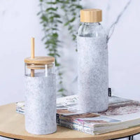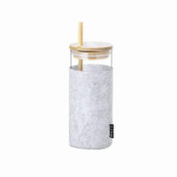 Body made of borosilicate glass -BPA free- offering exceptional strength and durability, extending its lifespan and making it reusable countless times. Including soft, sustainable RPET felt pouch, bamboo push-on lid with a hole for straw, and a reusa