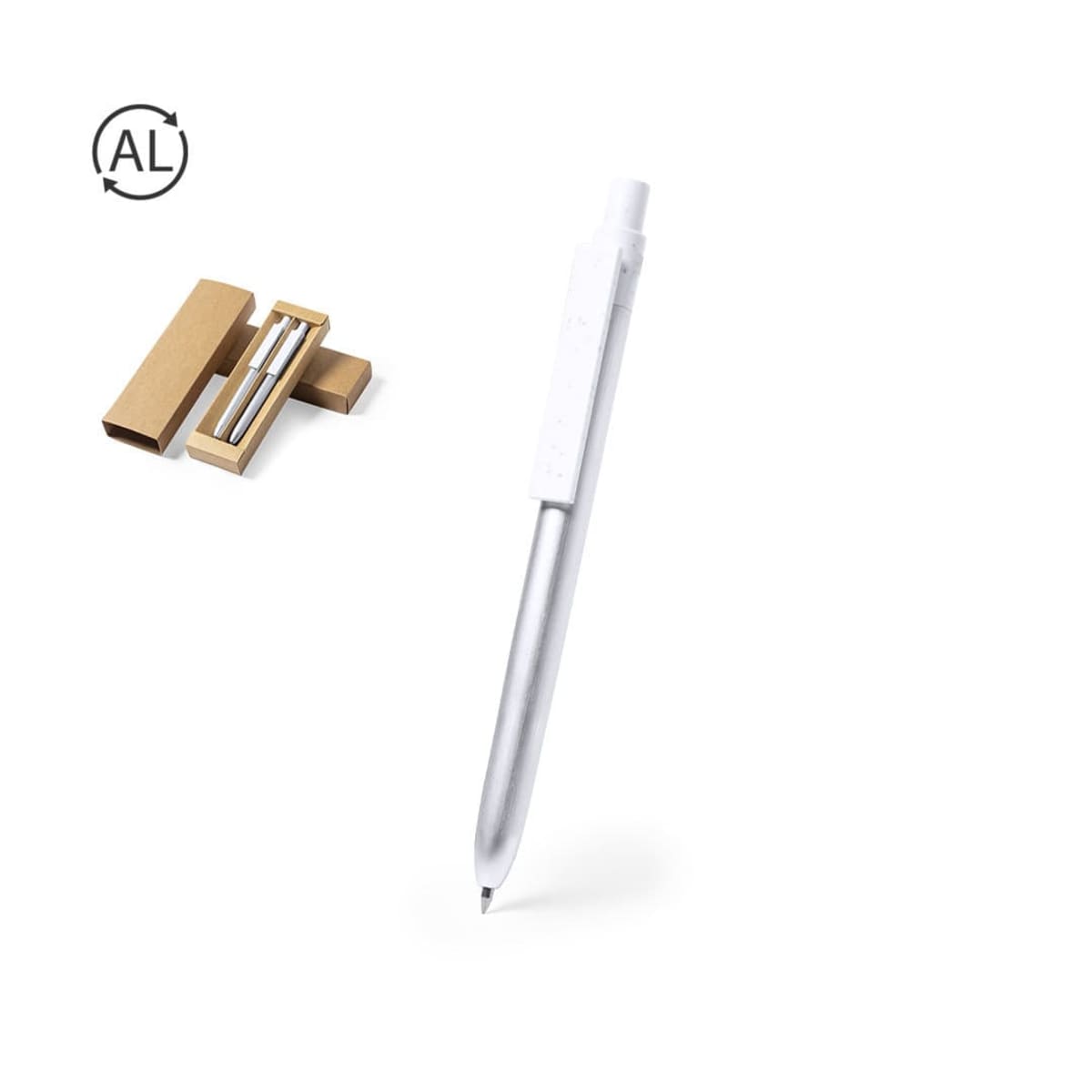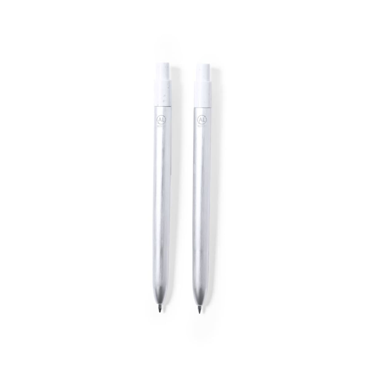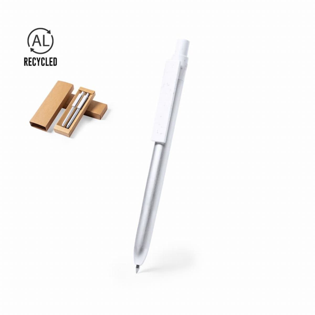 Including: Ball pen in recycled aluminium with push-button mechanism, silver finish barrel and white fittings. With recycled aluminium logo on the top of the ball pen, jumbo cartridge and blue ink.Roller pen in recycled aluminium with push-button mec