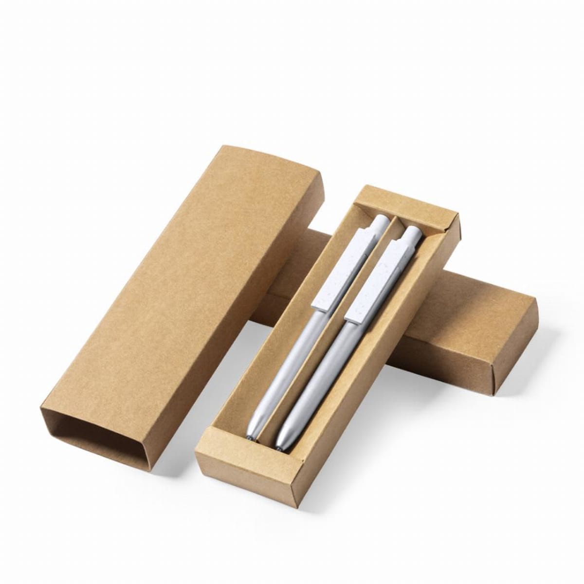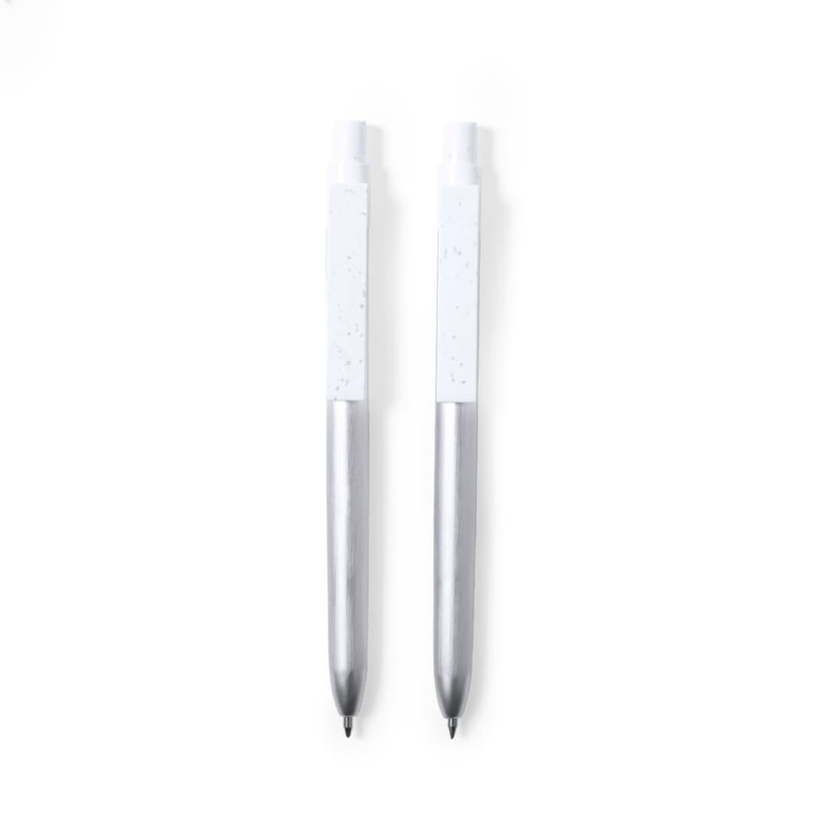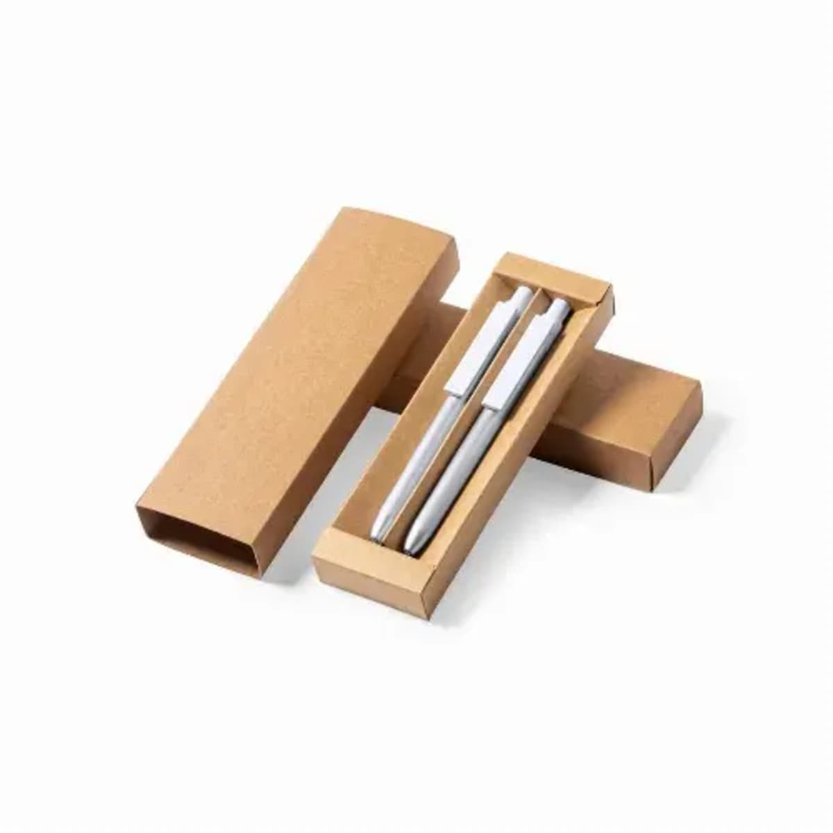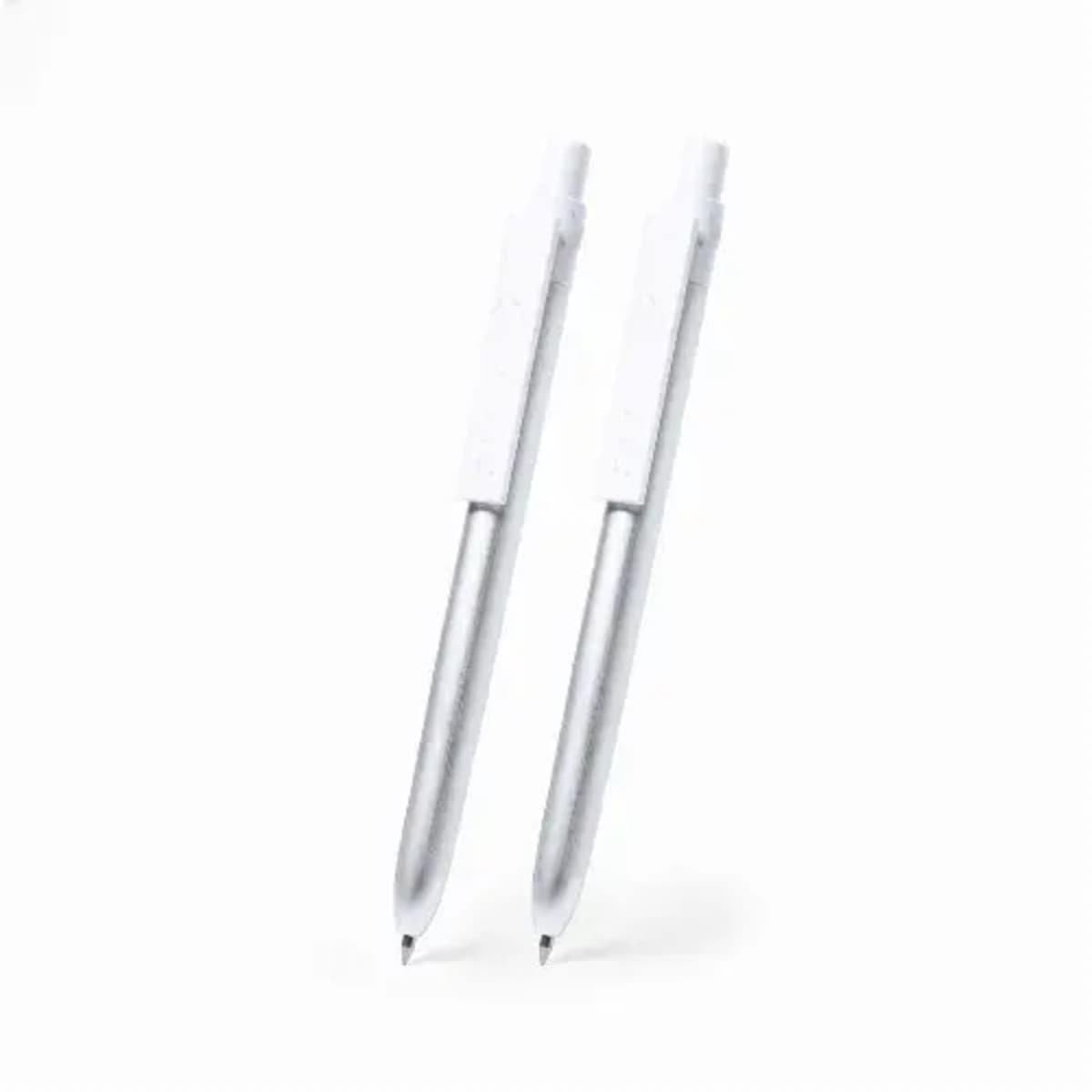 Including: Ball pen in recycled aluminium with push-button mechanism, silver finish barrel and white fittings. With recycled aluminium logo on the top of the ball pen, jumbo cartridge and blue ink.Roller pen in recycled aluminium with push-button mec