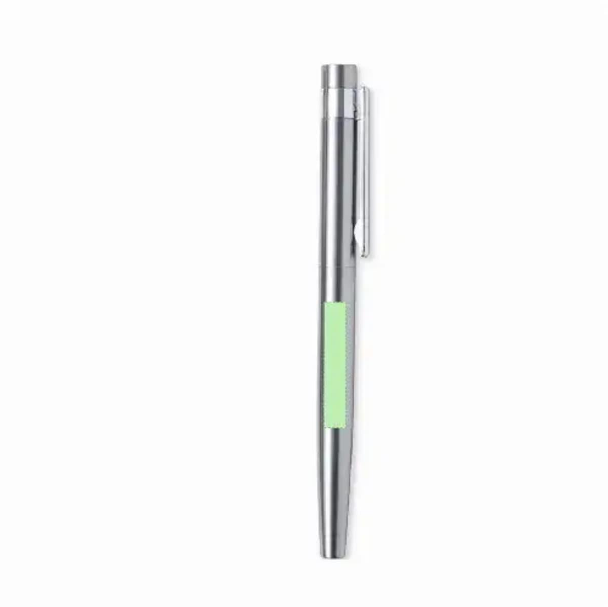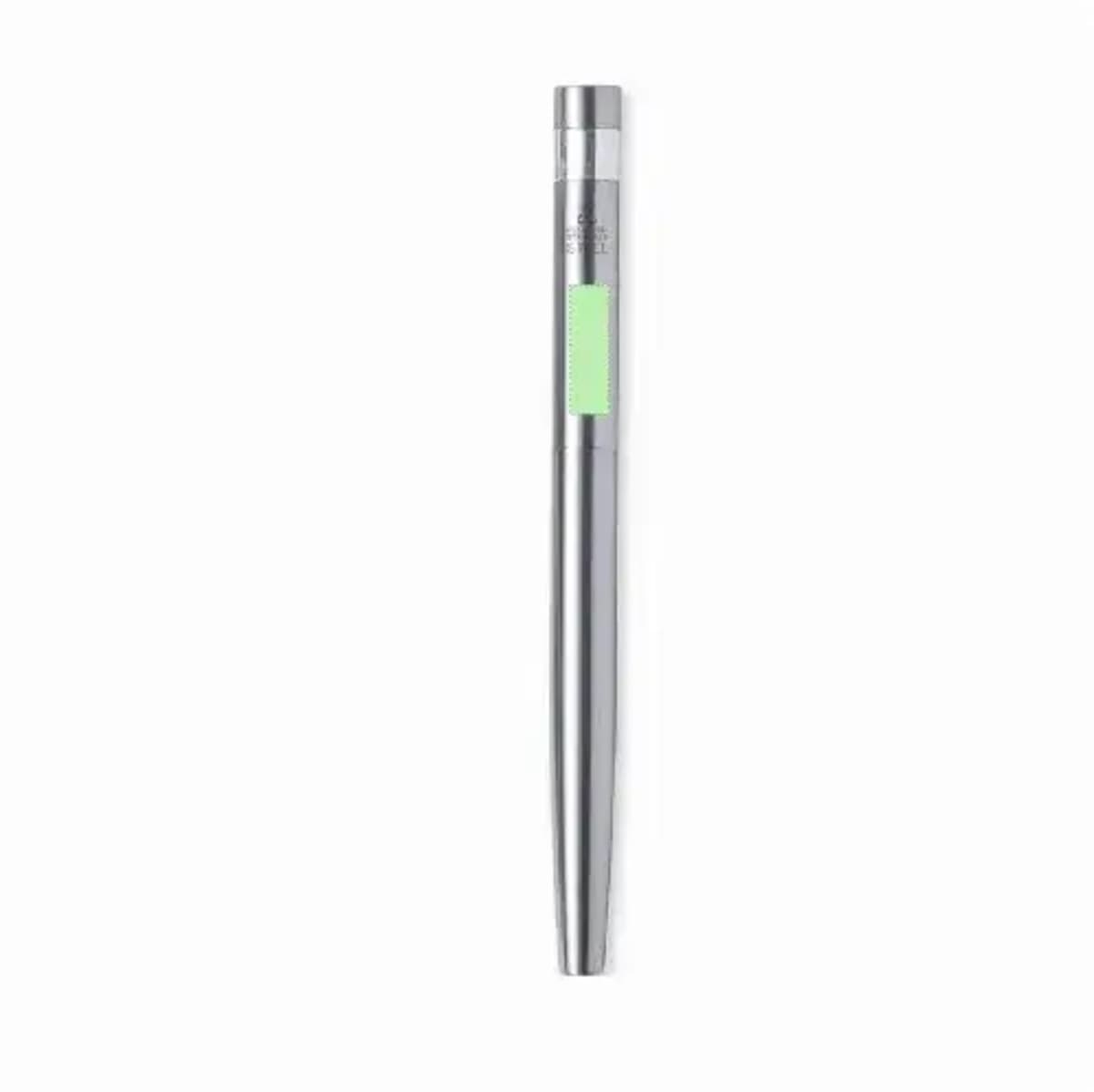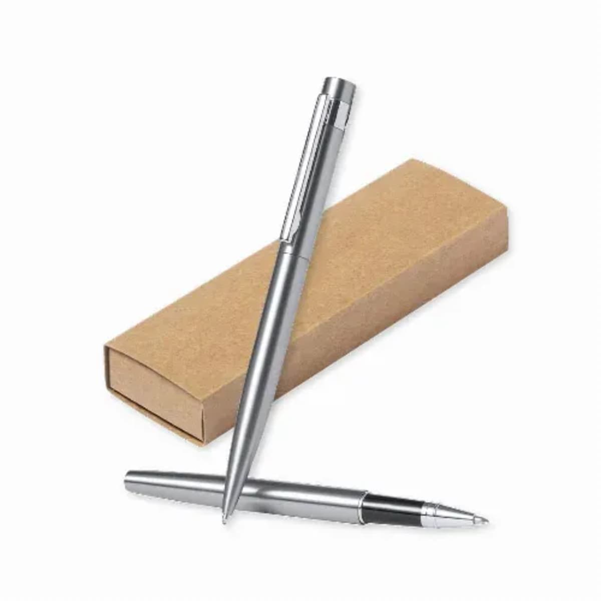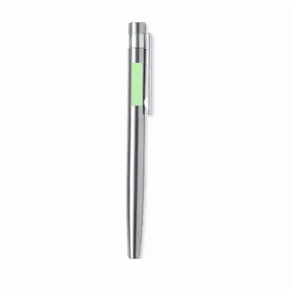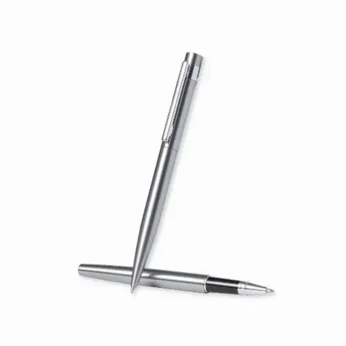 Including: Ball pen with push-button mechanism, silver finish barrel and chrome plated fittings. Metallic clip and with the distinctive of recycled stainless steel on the top of the pen. Jumbo cartridge and blue ink.Roller pen with push-button mechan