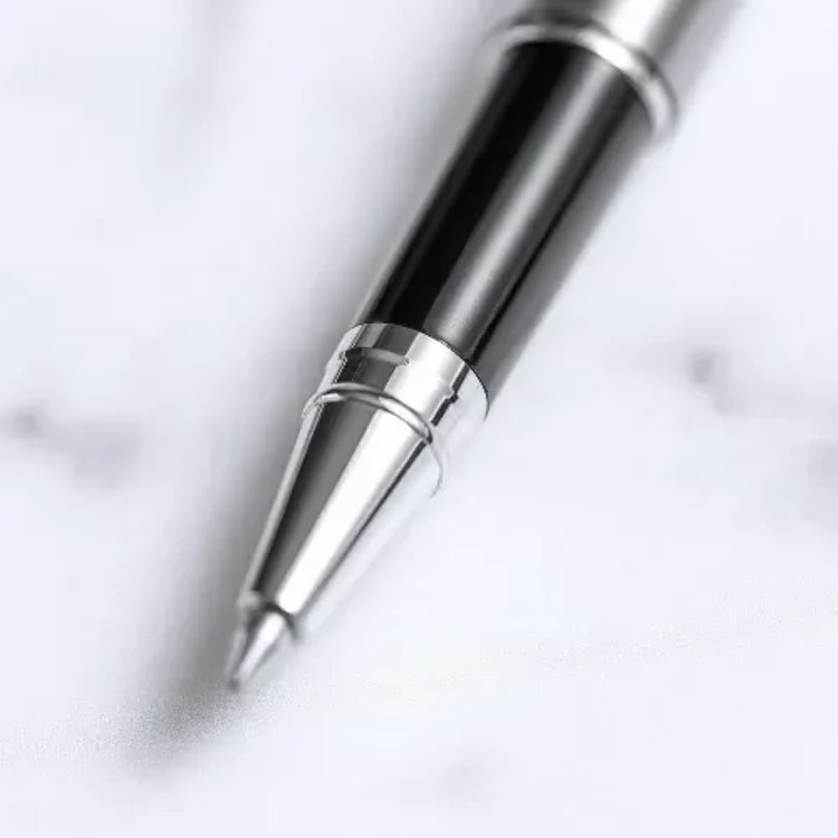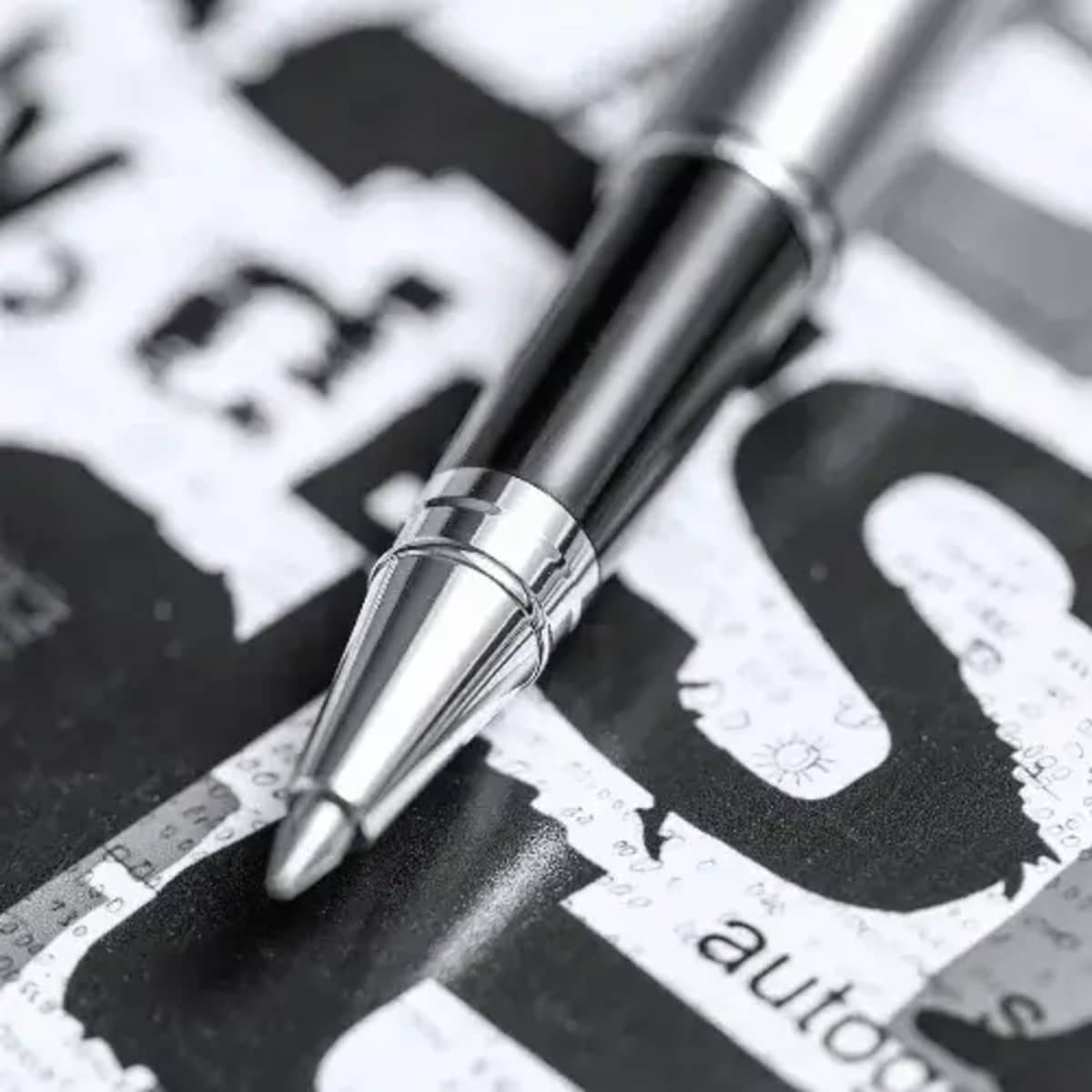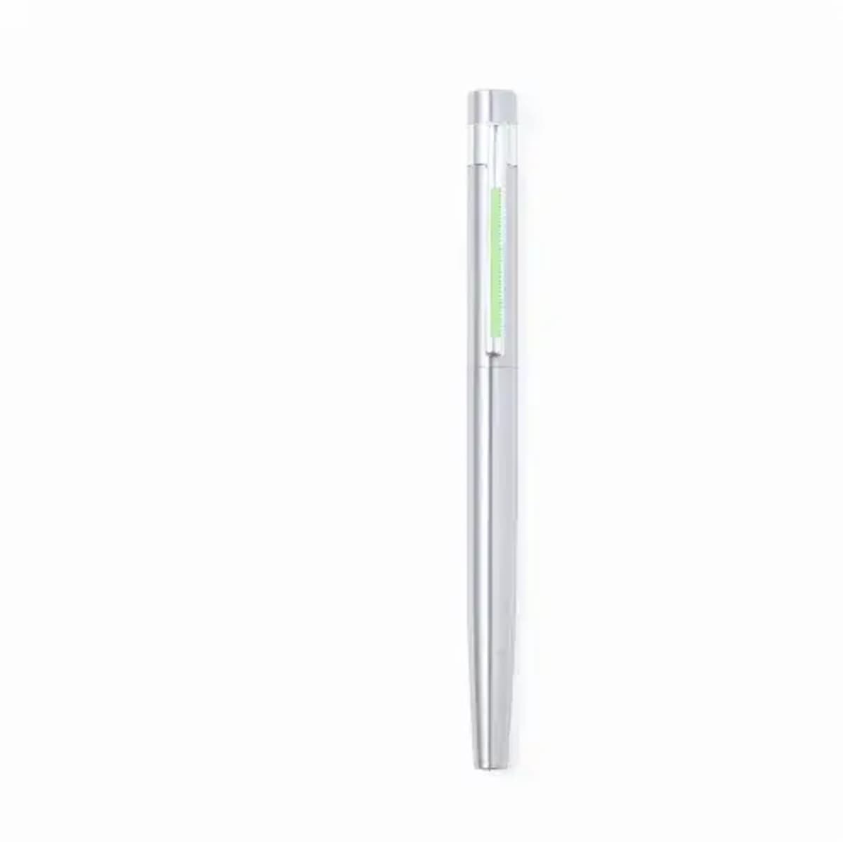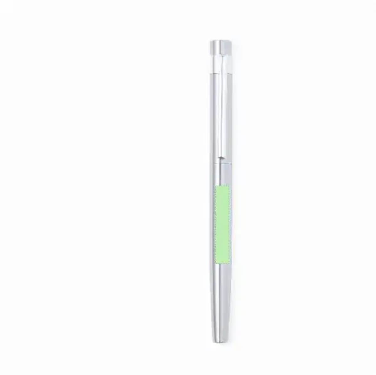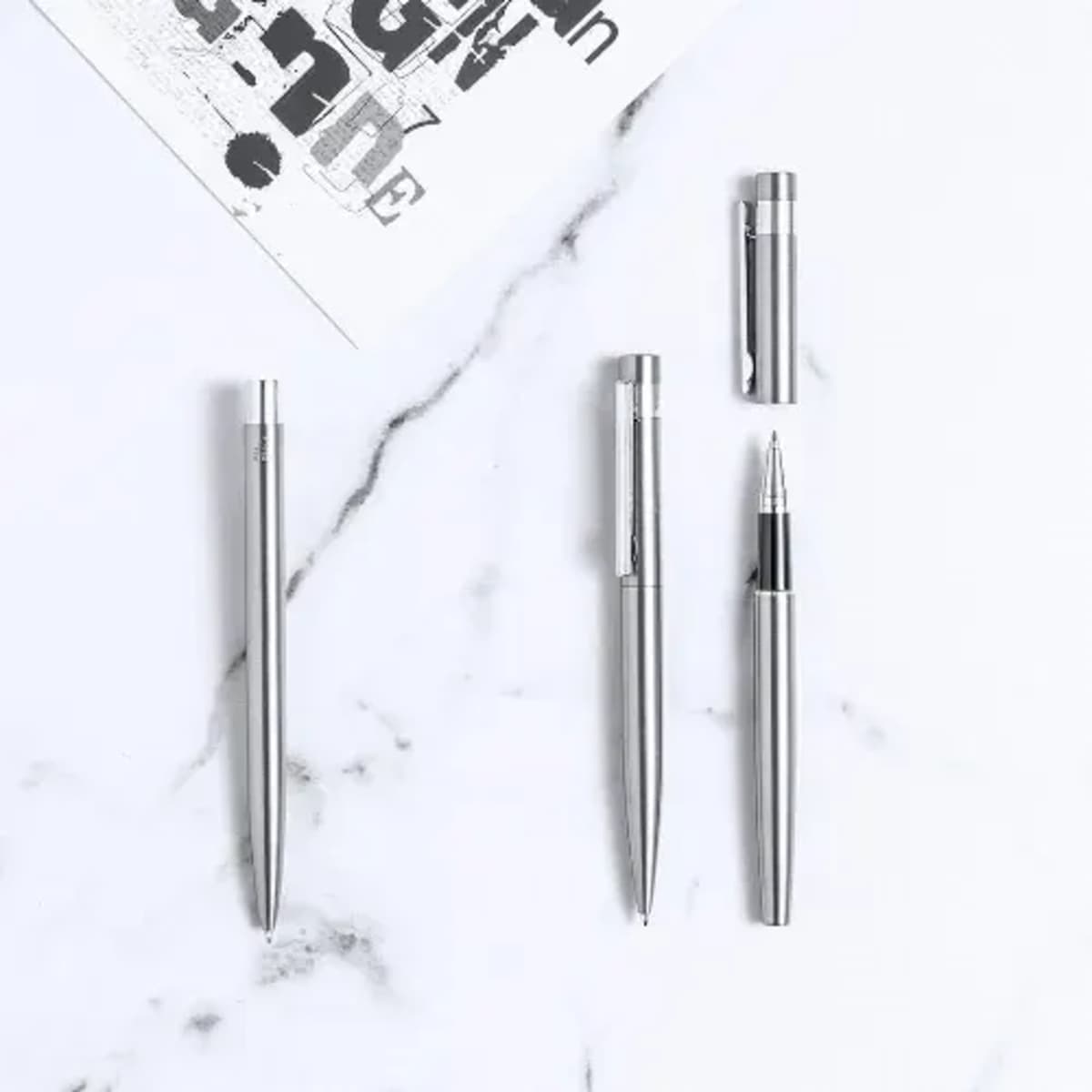 Including: Ball pen with push-button mechanism, silver finish barrel and chrome plated fittings. Metallic clip and with the distinctive of recycled stainless steel on the top of the pen. Jumbo cartridge and blue ink.Roller pen with push-button mechan