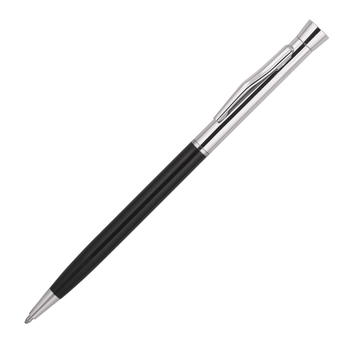 The exquisite design of the Linda Metal Ballpoint Pen is an elegant, corporate promotional gift idea that is sure to impress any client. Your client's engraved (champagne finish) or pad printed promotional logo on it's slim barrel will compliment and reflect the values of their business. Finished in black metal with chrome trim, it features a quality engineered, twist action, retractable ballpoint. Black ink comes courtesy of a Cross type refill.