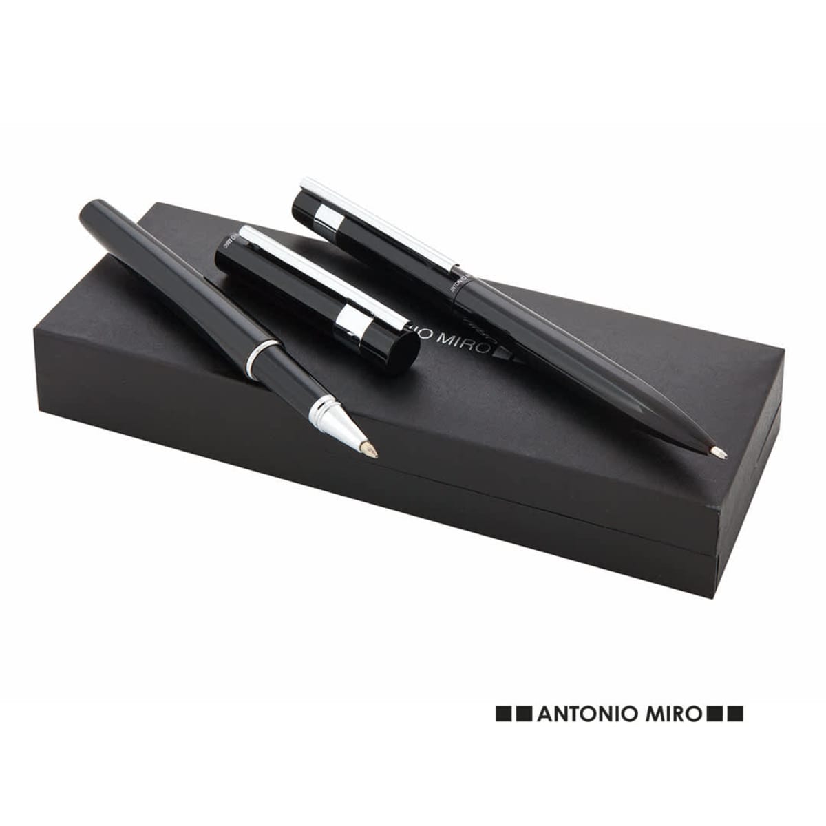 Elegant set by Antonio Miró with a twist mechanism ball pen and a hood roller Metal body in gloss black finish with silver clip Presented in an elegant individual black box with the brand logo and inside a sleeve Blue ink