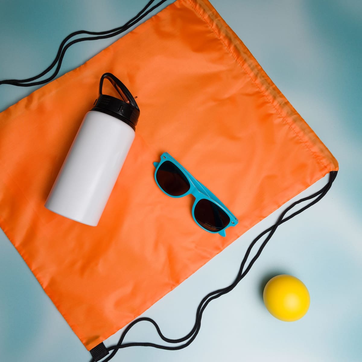 Materials:  Pronto Drawstring Backpack: 210D Polyester, Amore 500ml Junior Bottle - Flip Straw Lid: Bottle: Aluminium, Lid: PP, Horizon Sunglasses: Polycarbonate frame & lens, Hi Bounce Ball: Natural Rubber