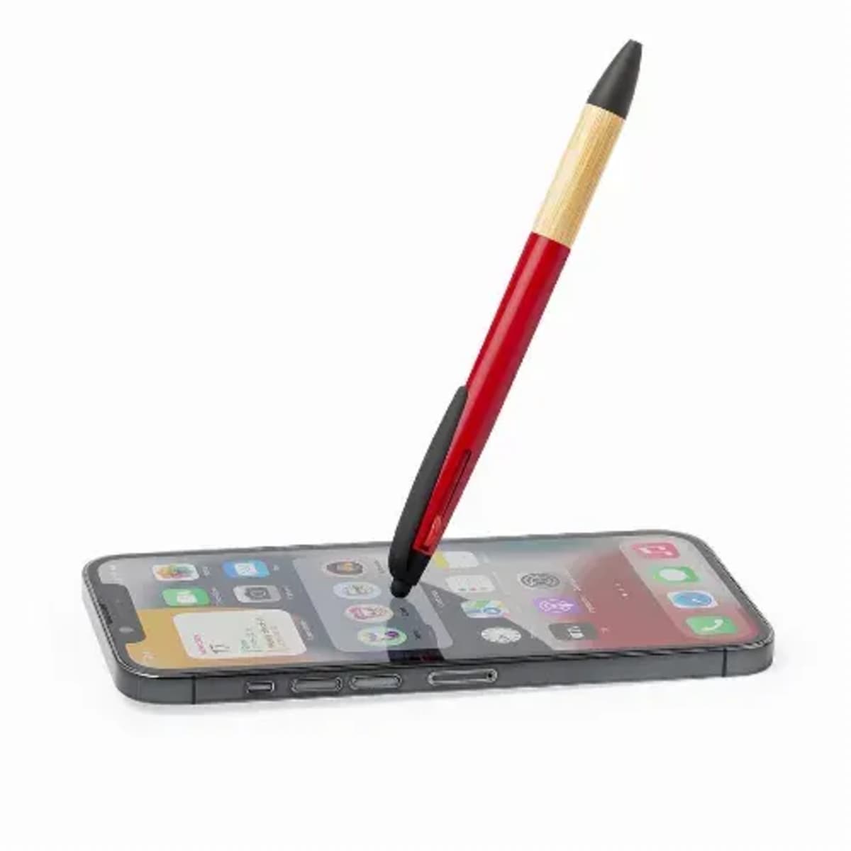Practical ball pen pointer with 3 different ink colours (blue, red, and black) made of bamboo.