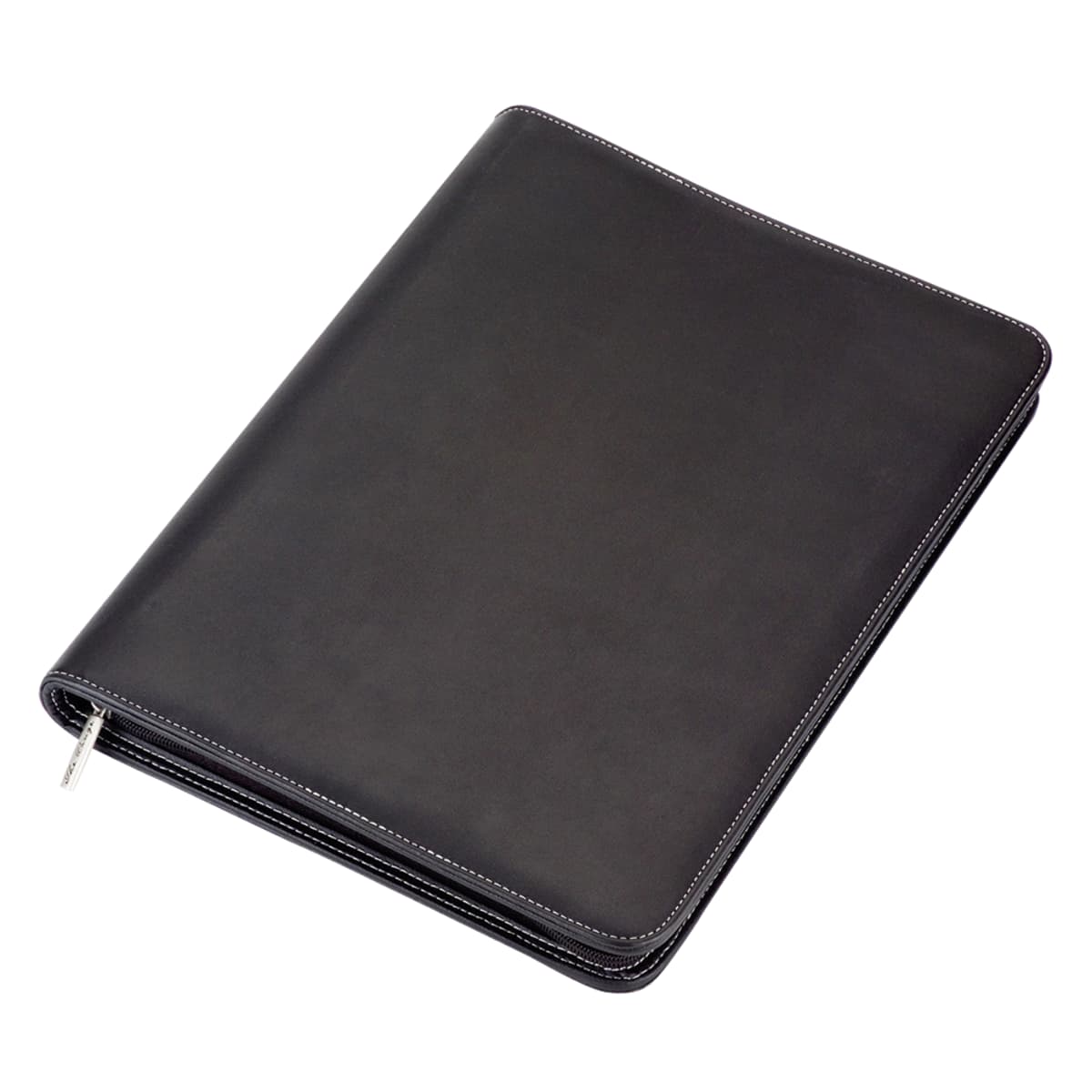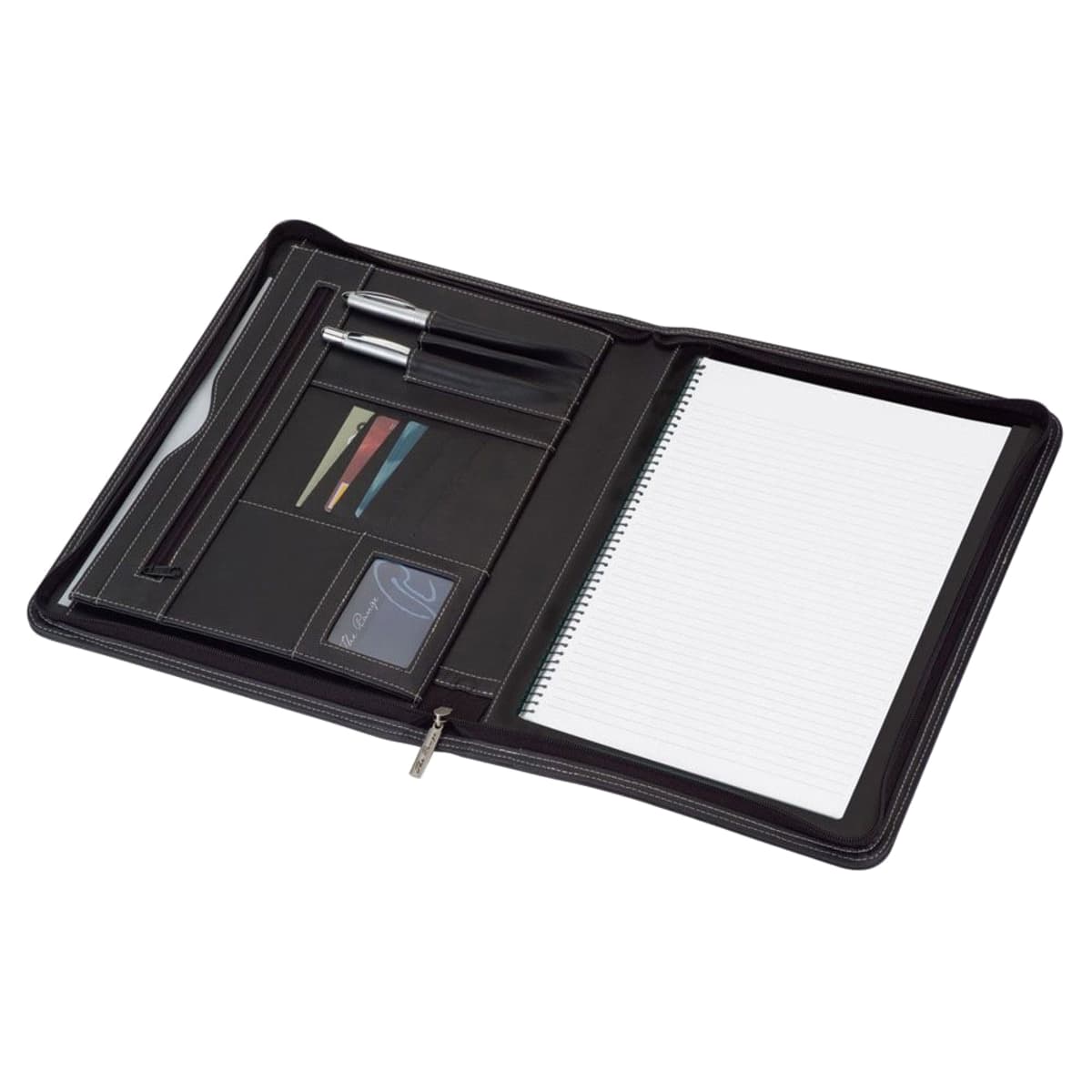 Features:  Features include zipper closure, internal gusseted pocket, internal zippered pocket, 2 pen loops, business card holders and comes with a spiral white lined notepad that inserts from the side. Pens are not included. Check out our Tablet Compatibility