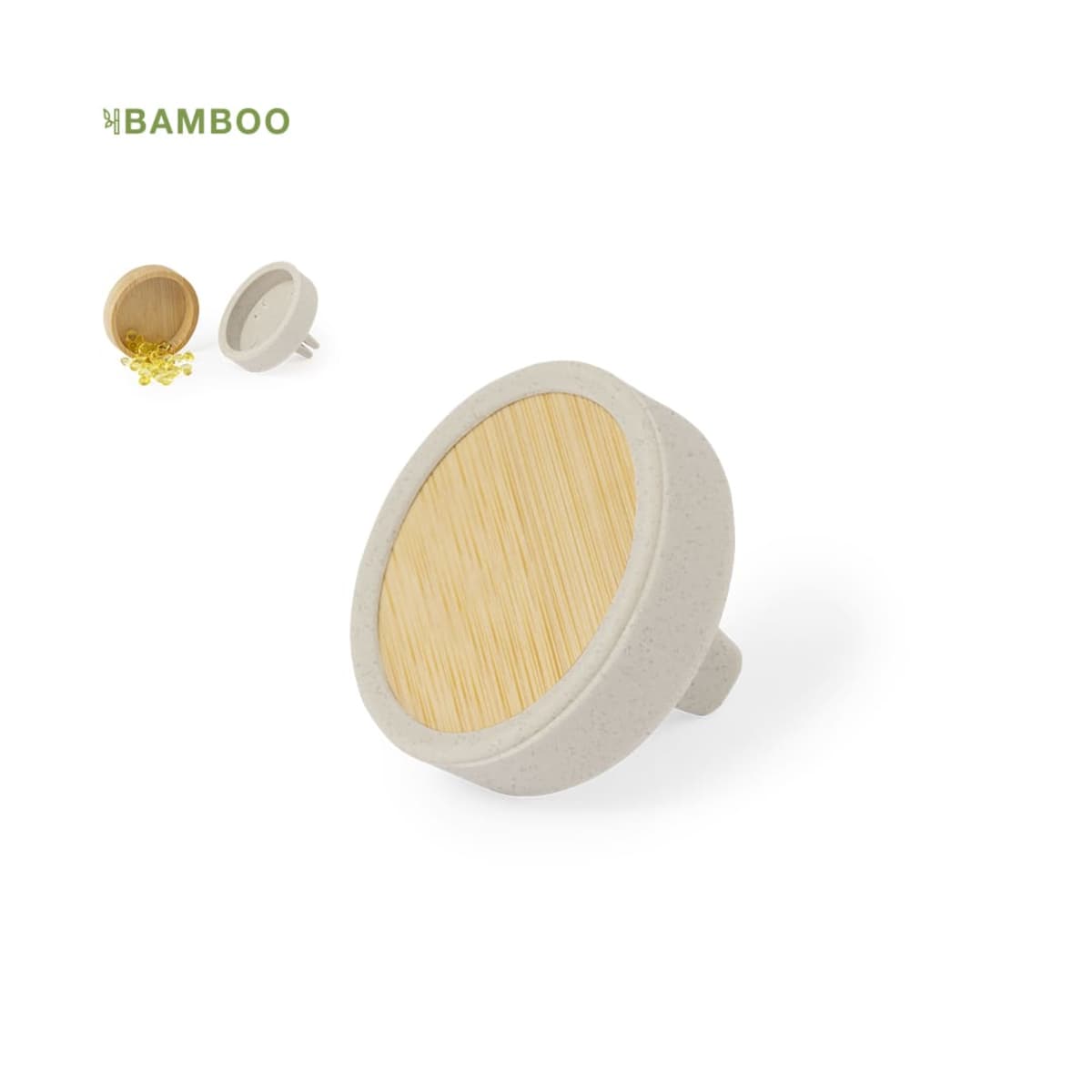 Made of bamboo and silicone, with lemon scent and suitable for car grille. Presented in a kraft paper bag.Materials such as bamboo encourage the use of natural raw materials, reducing pollutant emissions. It comes from a highly resistant and versatil