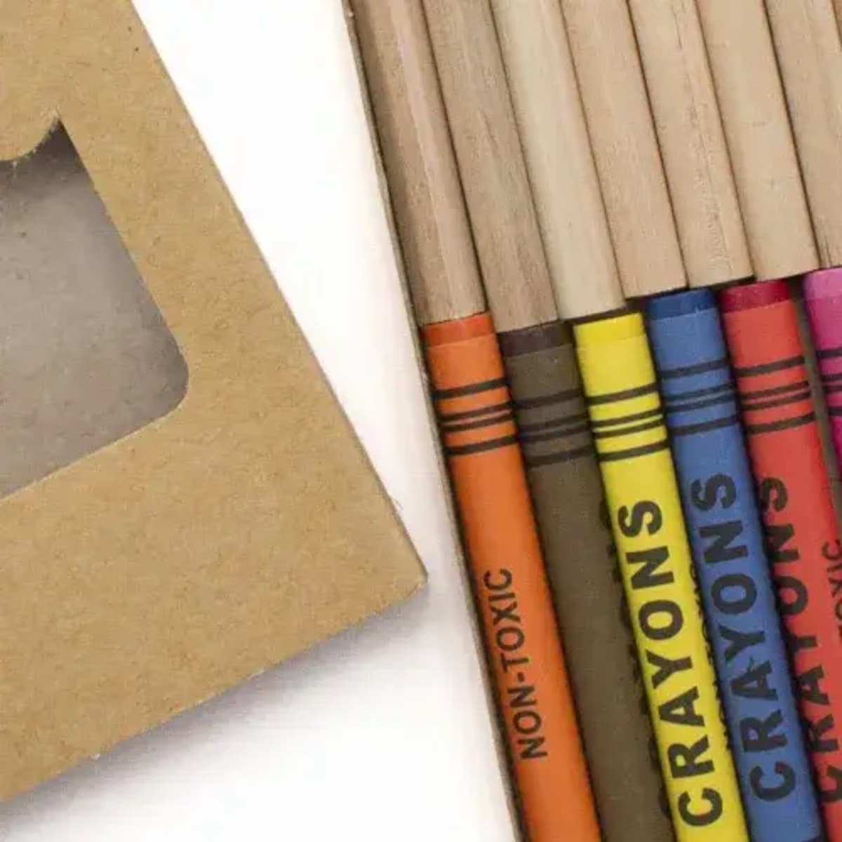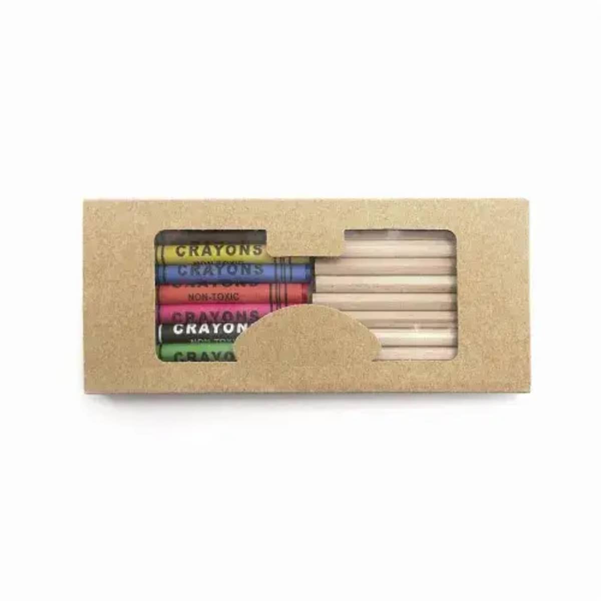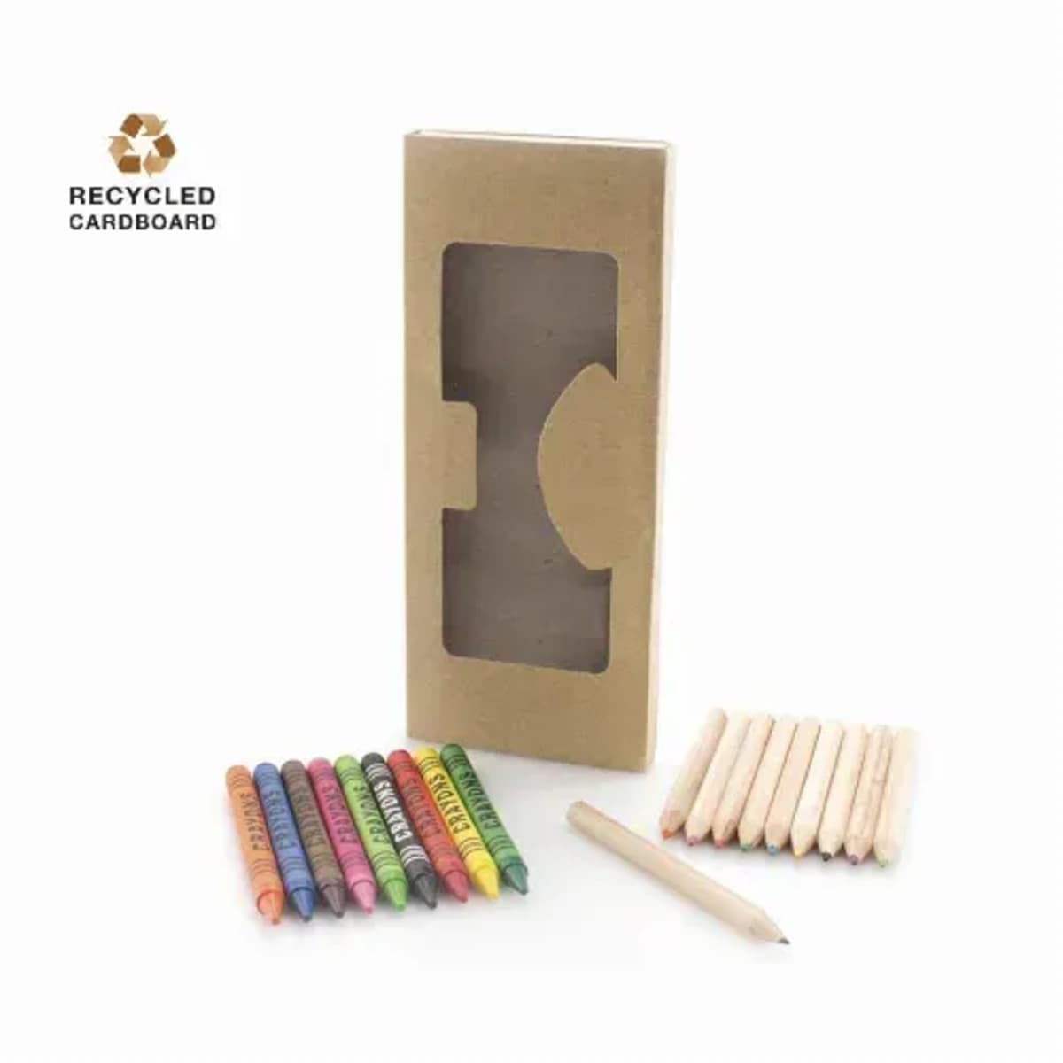 Contains cylindrical body crayons and natural wood pencils of hexagonal body in varied colors.