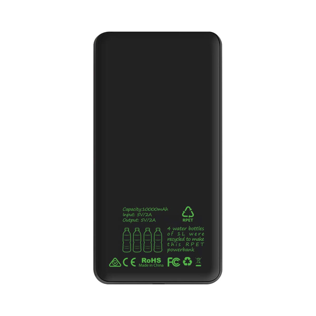 The Albert Eco power bank provides a 10000 mAh, A-Grade Lithium-Polymer battery packed into a lightweight eco-friendly case manufactured from 4 Recycled PET bottles. It features Type-C and Micro USB inputs, dual USB-A outputs, an LED capacity indicator, an on/off switch, and protection to stabilise the output voltage and prevent overcharging or short circuits. Choose between a double-sided moulded RPET case or an RPET and RPET fabric case. The power bank includes a Type-C charge cable, a user manual, and recycled packaging. Material: RPET, RPET Fabric.