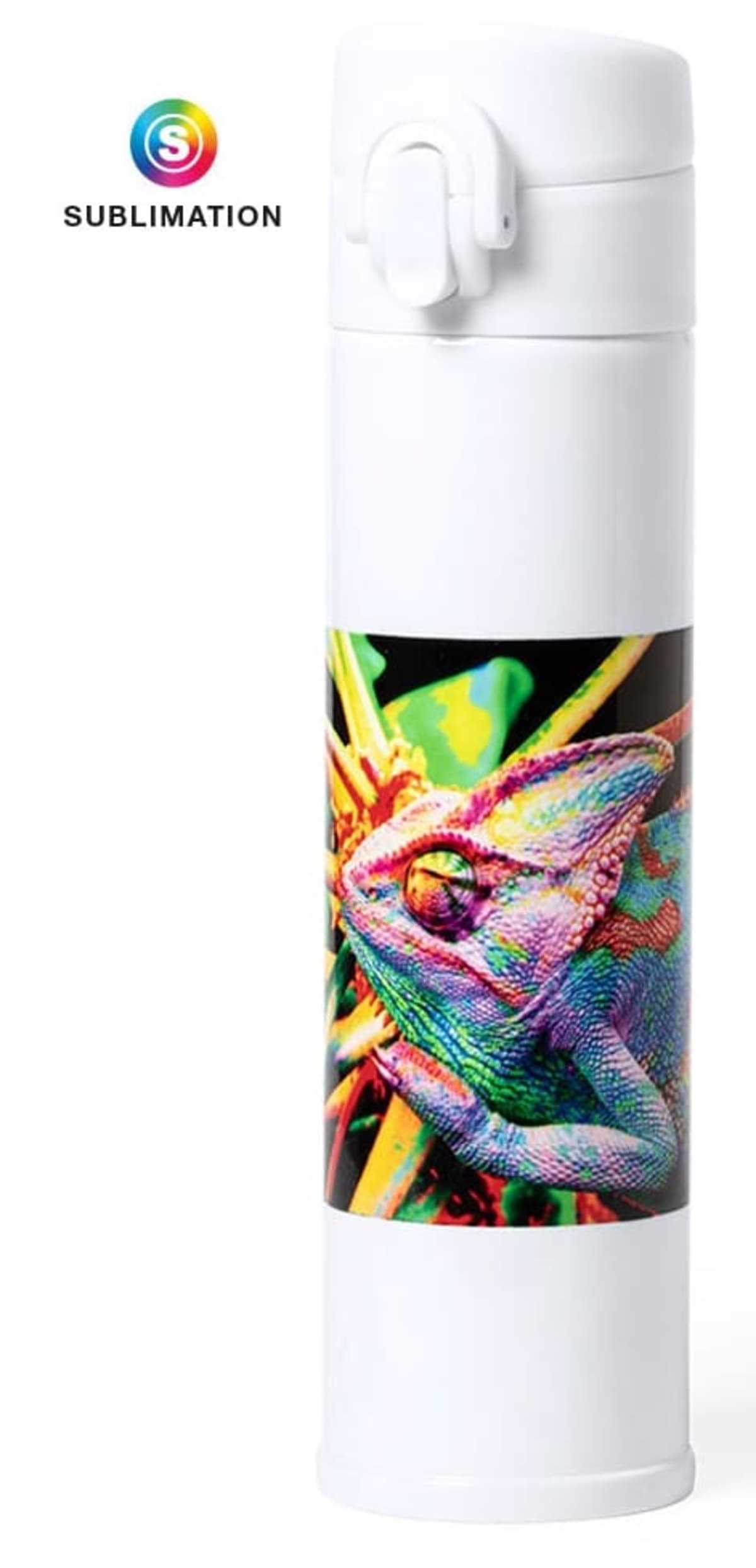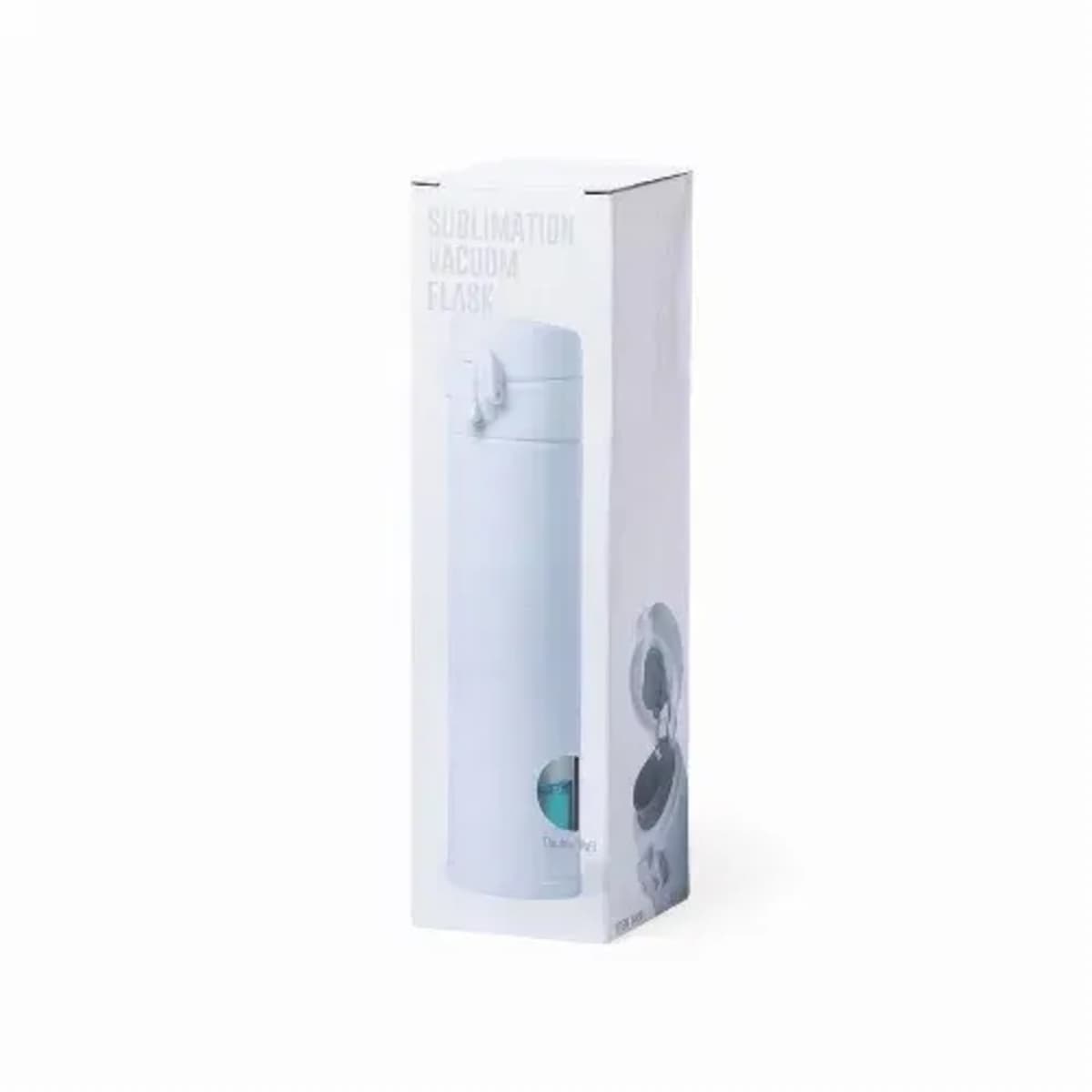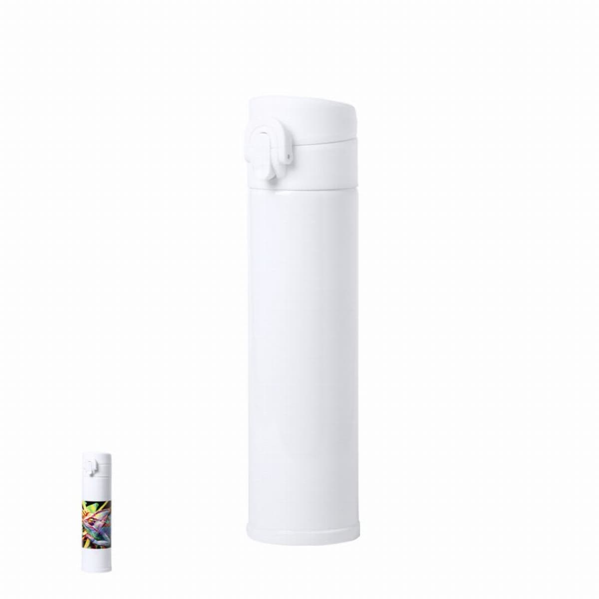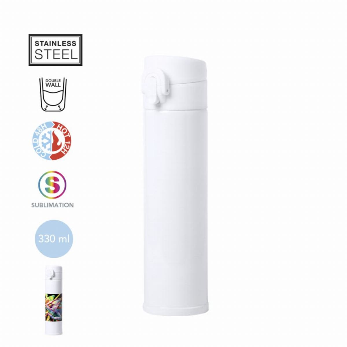 Features:  Double wall for a better and longer preservation of liquid’s temperature, with security lock and including an easy, button opening mechanism. Especially manufactured for sublimation printing and presented in an attractive design box. Instruction manu