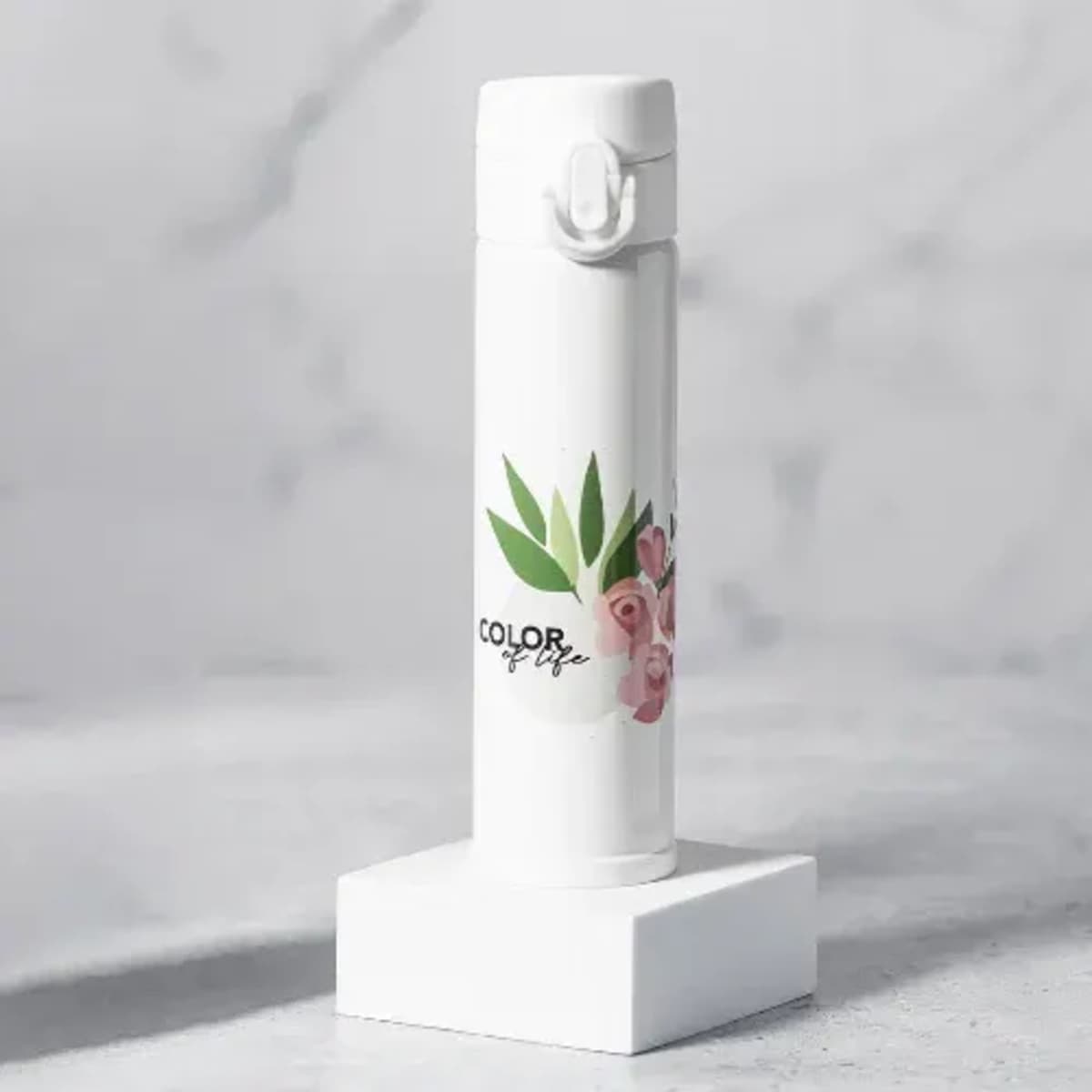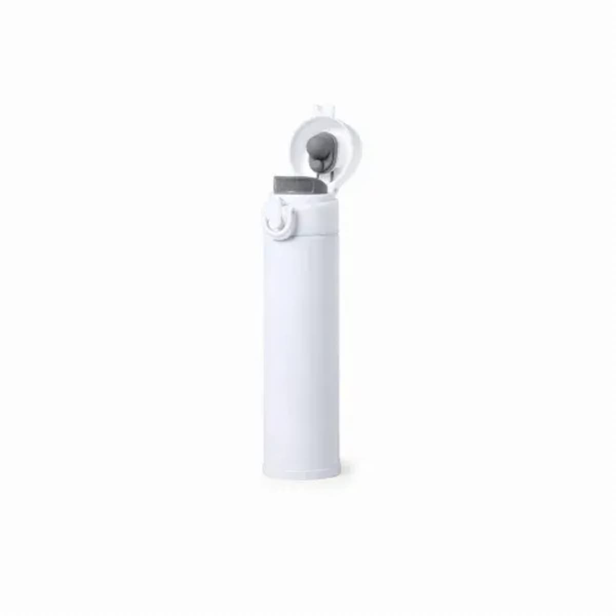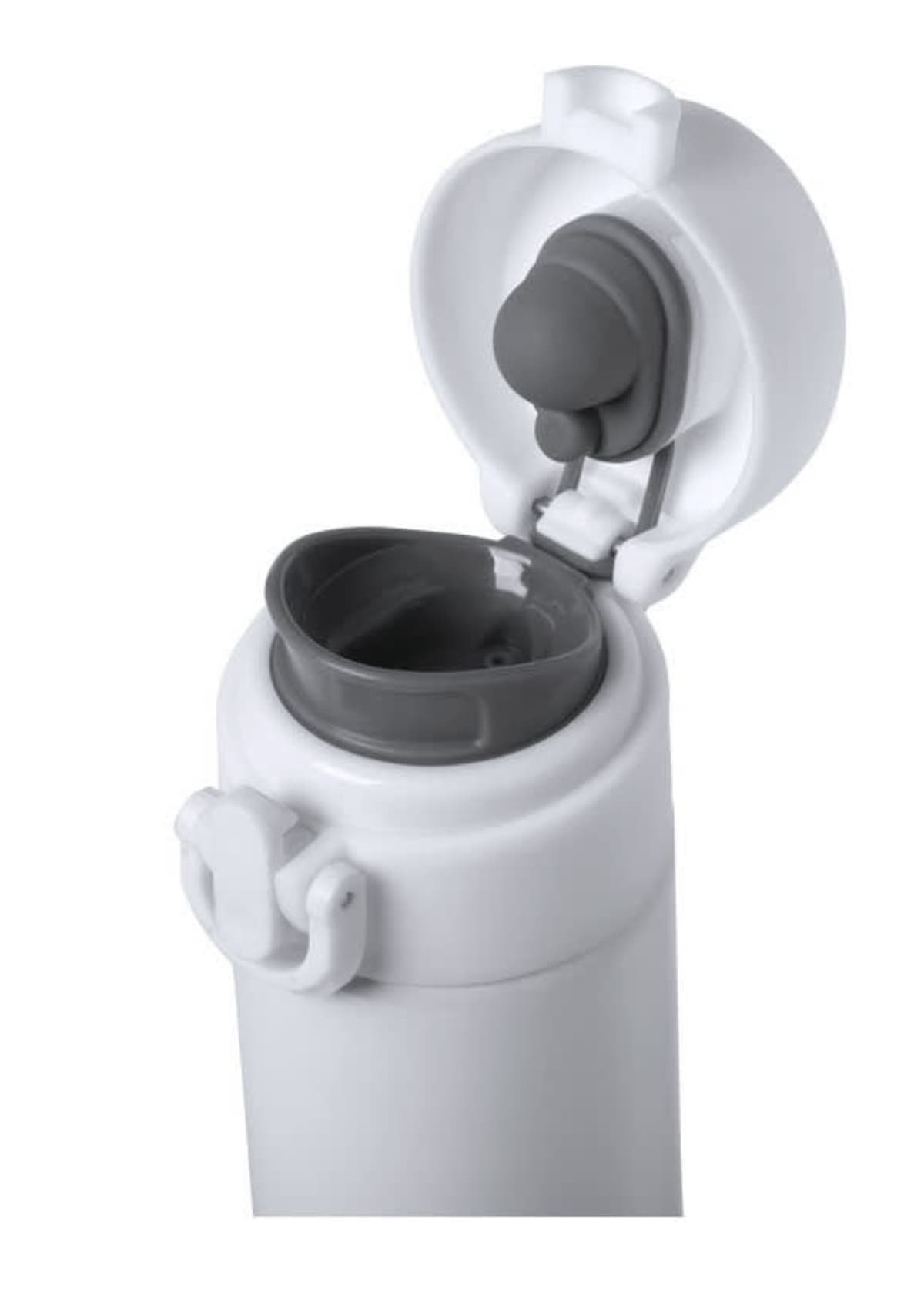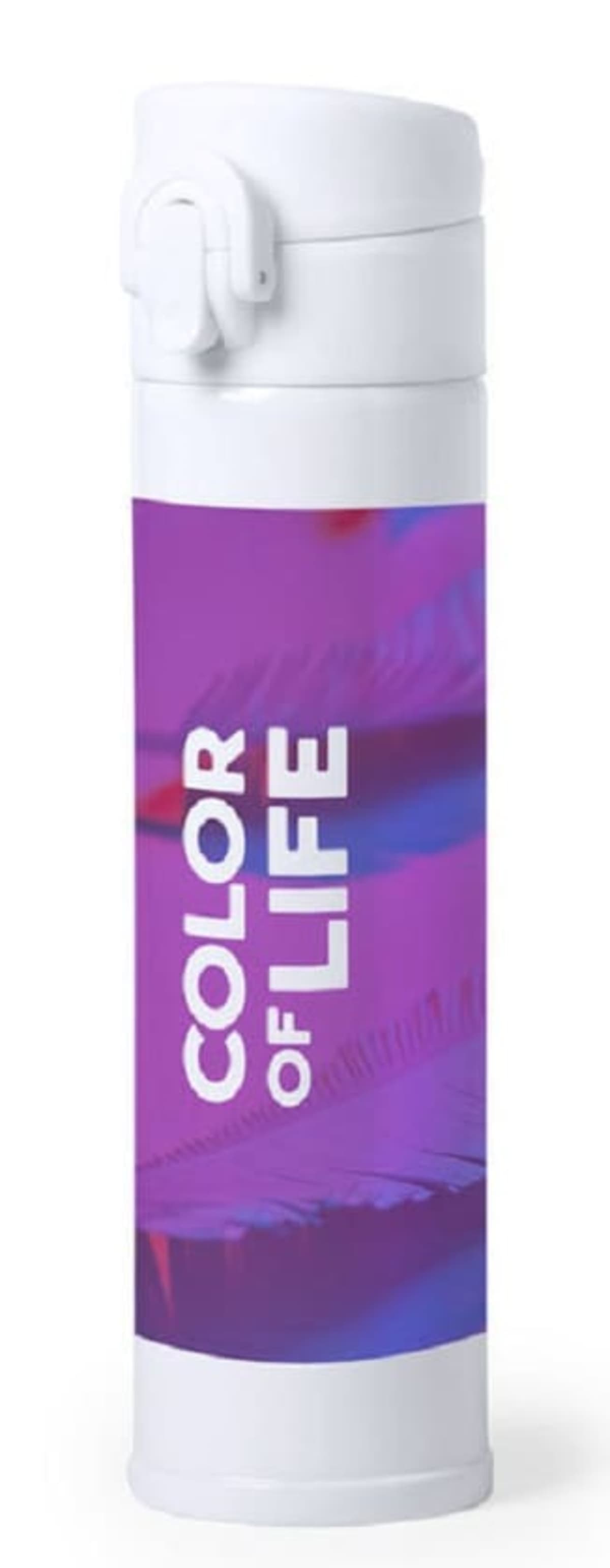Features:  Double wall for a better and longer preservation of liquid’s temperature, with security lock and including an easy, button opening mechanism. Especially manufactured for sublimation printing and presented in an attractive design box. Instruction manu