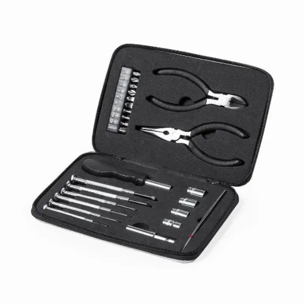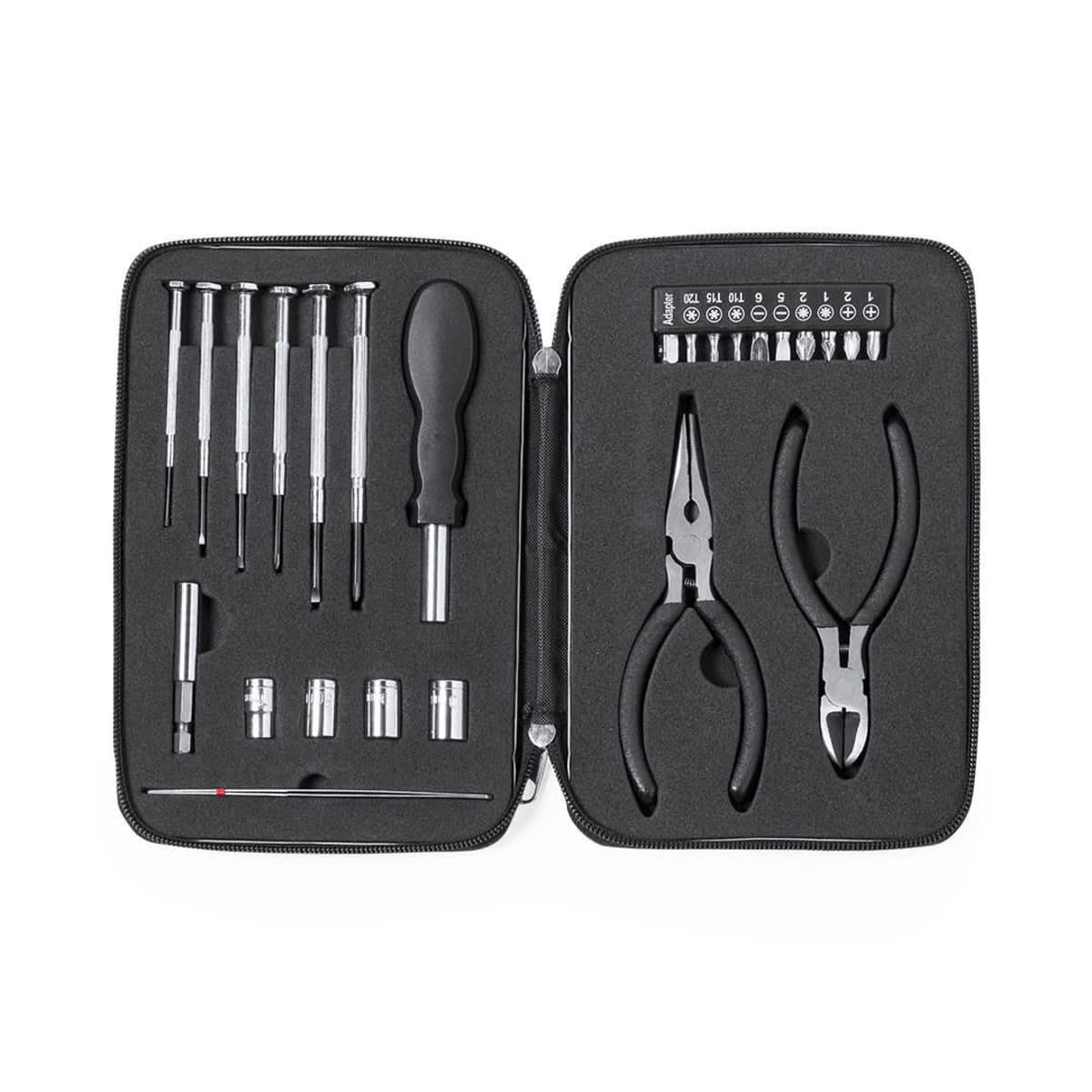 Including precision screwdriver set, multi-function tool, interchangeable tips, flat and Phillips screwdrivers, tube heads, tweezers and pliers. Presented in an individual box.
