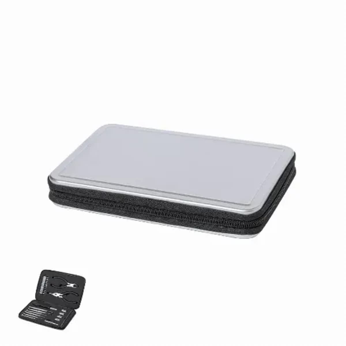 25-accessory tool set in durable aluminum case with die-cut inside in EVA.