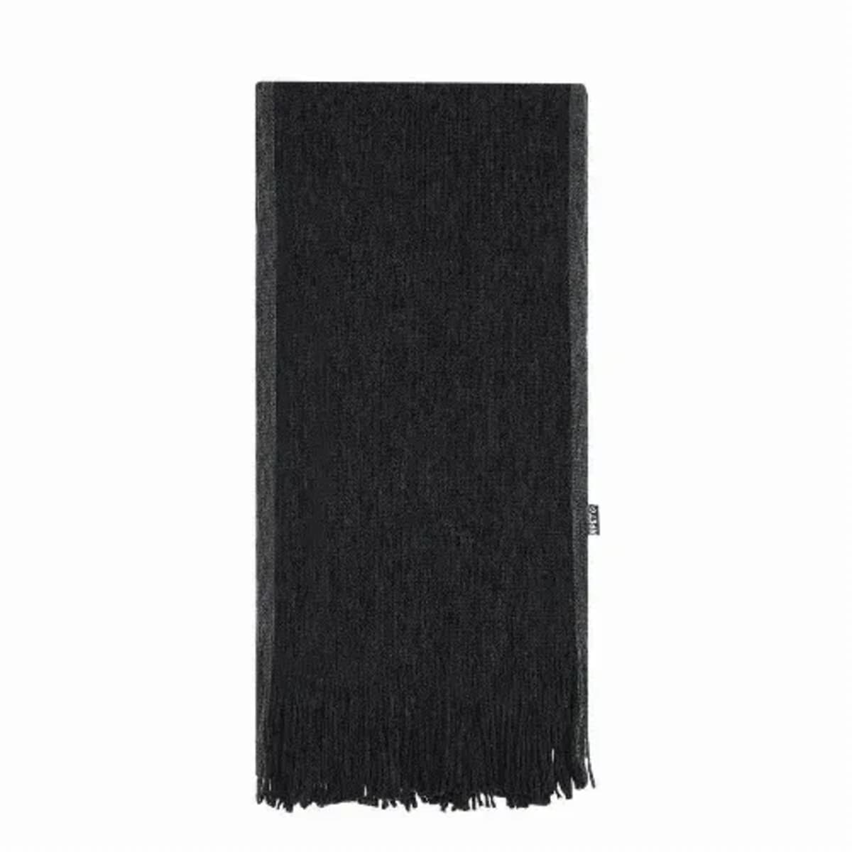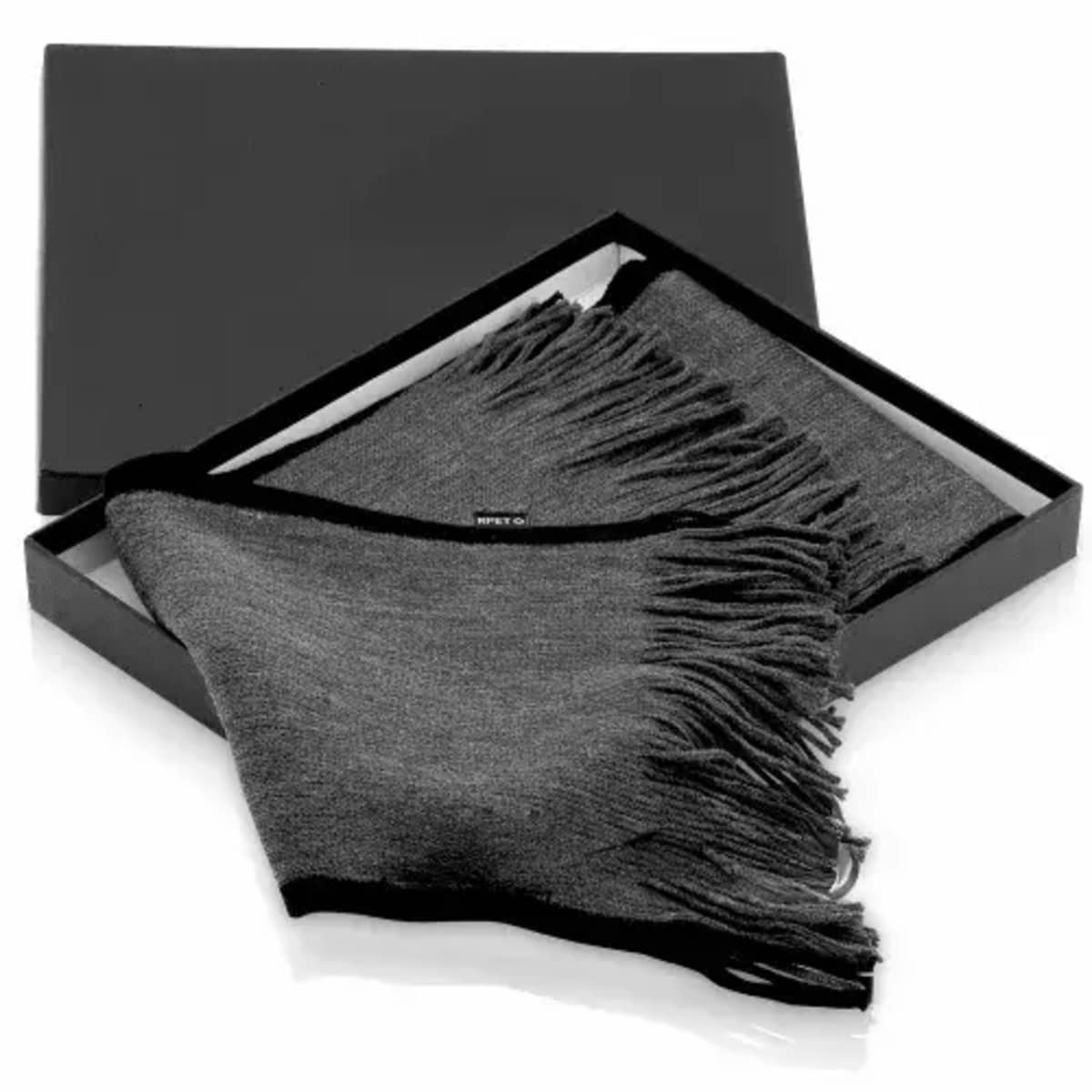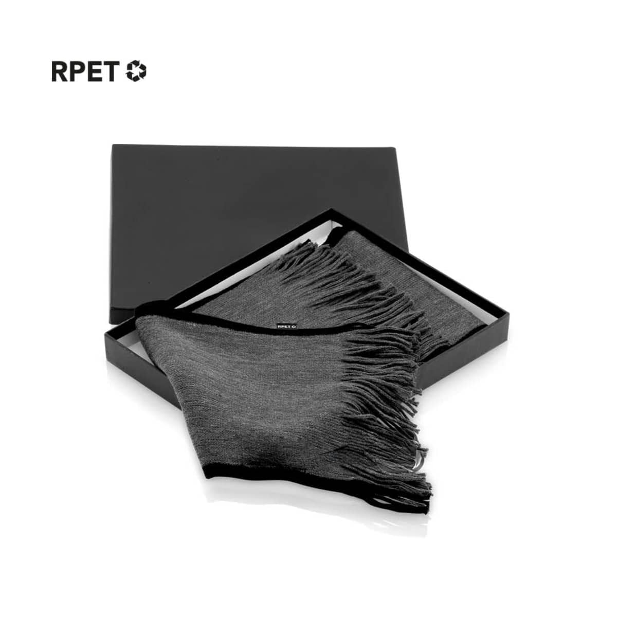 Made in stylish colours, with contrasting edges and fringed finish. With RPET label and presented in an elegant black box with lid. RPET material is made from recycled plastic, thus promoting the reuse of plastic waste and helping the sustainability