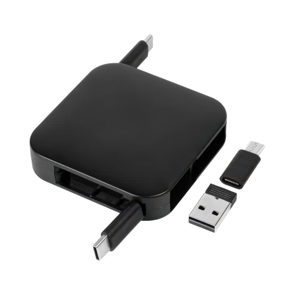 Goodbye to tangled cables with the Avola 4-in-1 Type-C retractable cable and stand. Offering quick charging and data transfer options, the Avola includes Type-C to Lightning and Type-C to USB-A adaptors, along with a slide-out phone stand that retracts into a compact, lightweight travel case to help minimise your travel accessories. Compatible with Apple CarPlay, Android Auto, and most portable devices, including smartphones and laptops. Material: ABS, TPE.