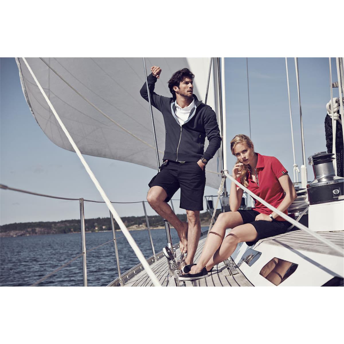 Ladies’ piqué polo in combed cotton with contrasting tape at neck, placket, side vent and loop at sleeve end. Bicoloured buttons. Contrast colour at reversed side collar.