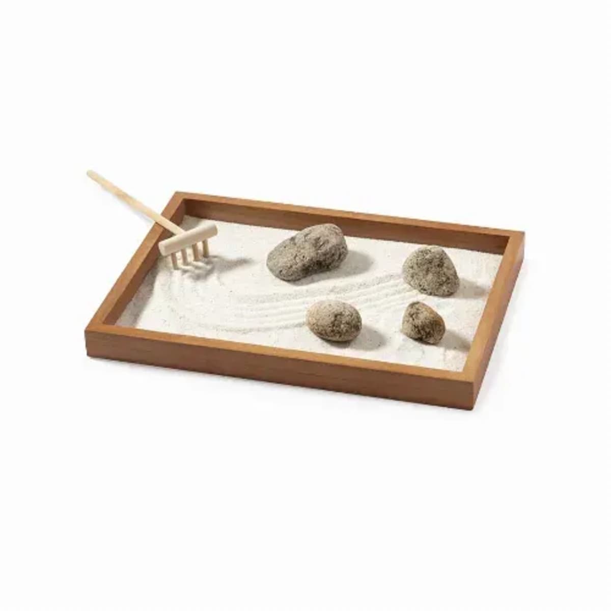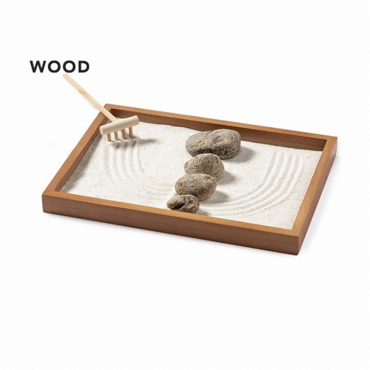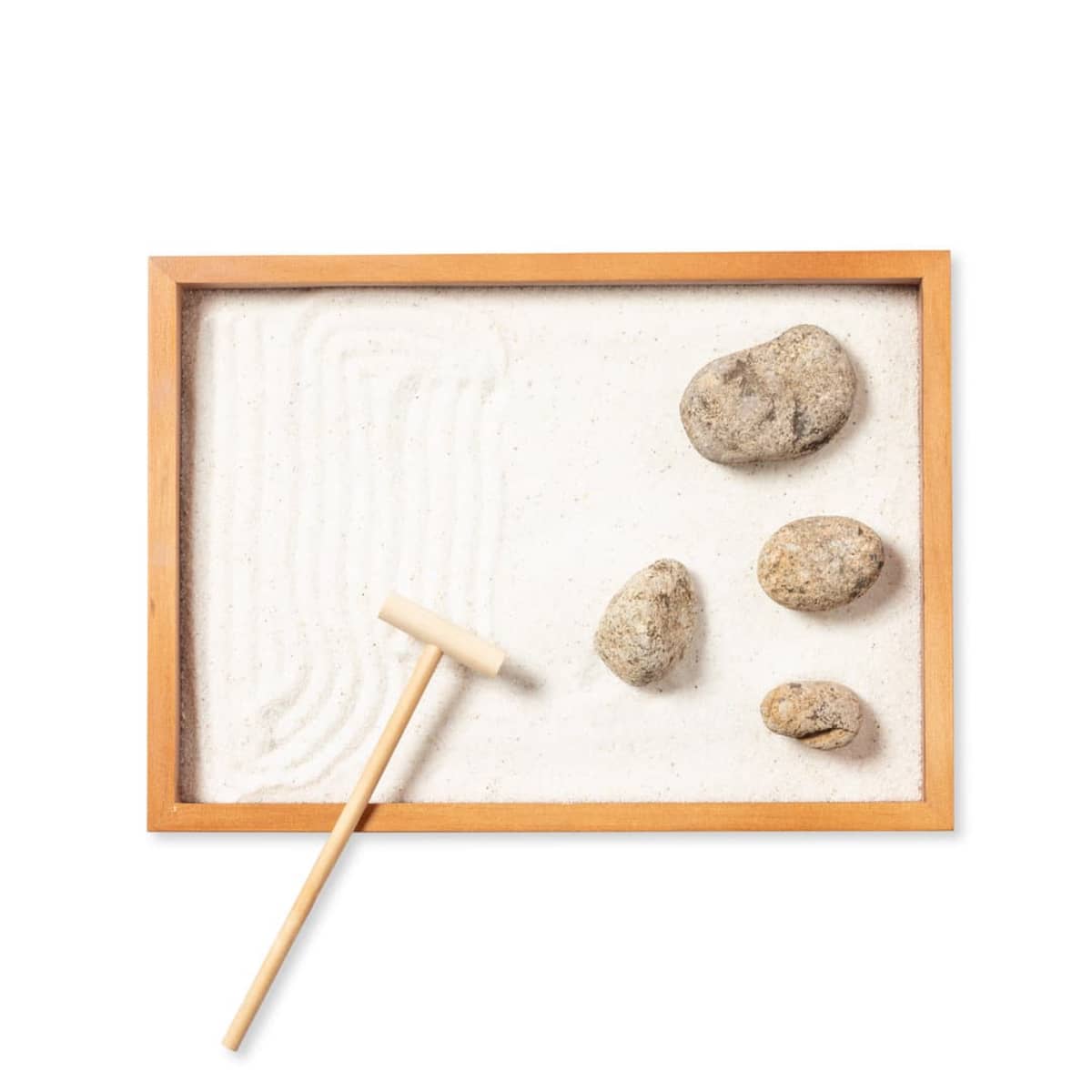 Container base and rake made of natural wood, with 4 natural stones and a small bag of white sand. Presented in an individual box with kraft design.