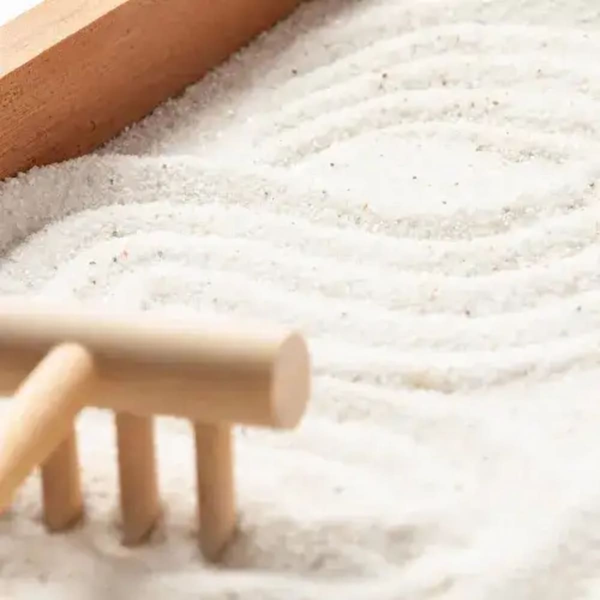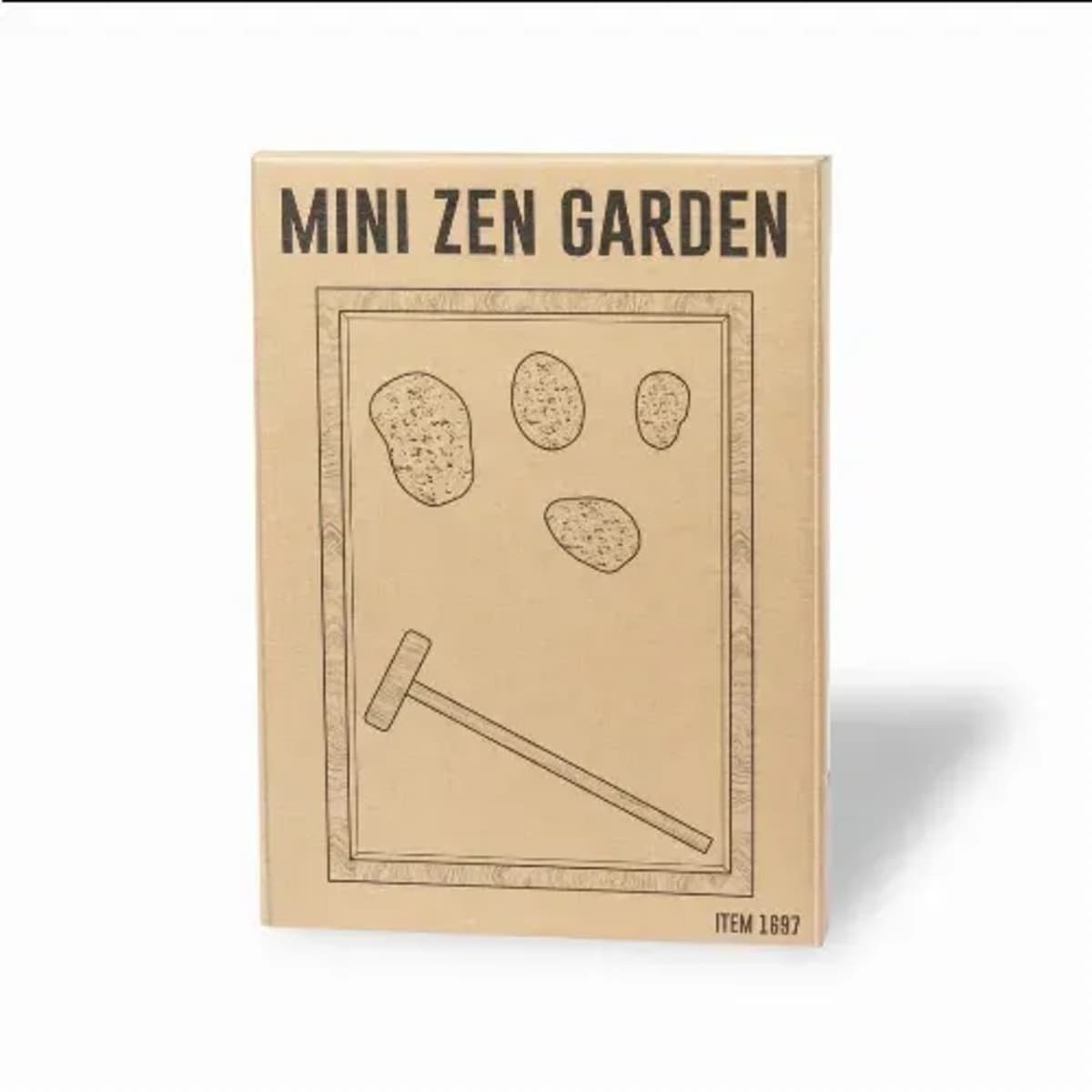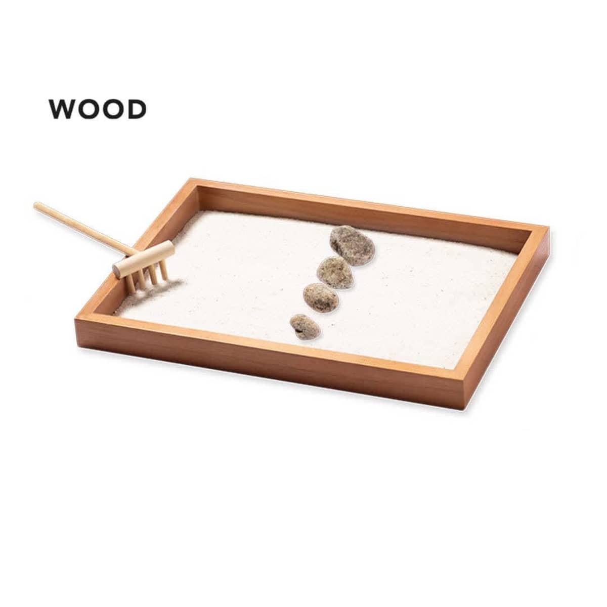Container base and rake made of natural wood, with 4 natural stones and a small bag of white sand. Presented in an individual box with kraft design.