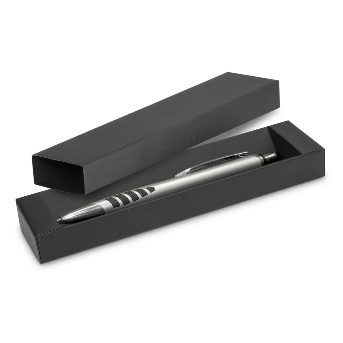 Retractable plastic ballpoint pen with a metallic barrel, soft rubber accents in the grip zone and shiny chrome trim. It has a black large volume refill with 1800 metres of German manufactured Dokumental ink and can be presented in an optional pen sleeve.