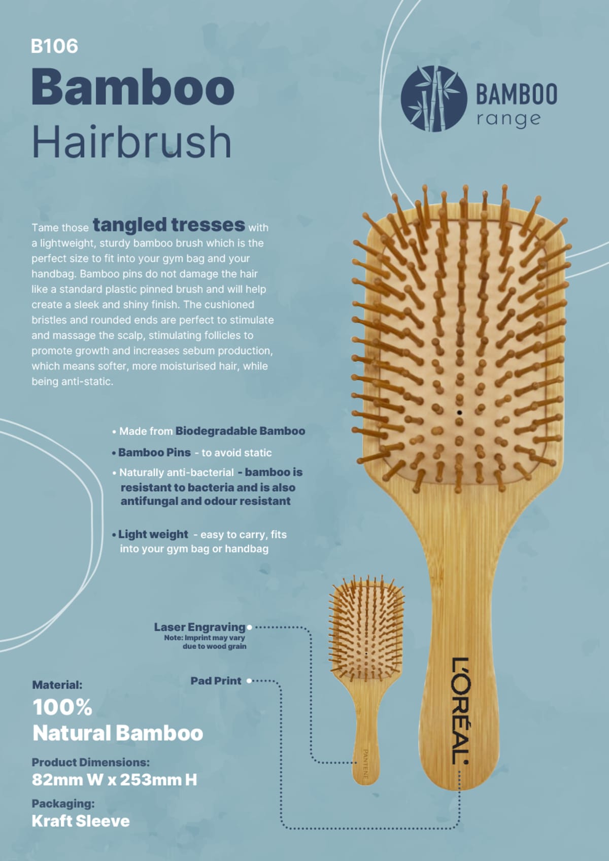 A lightweight, sturdy bamboo brush which is the perfect size to fit into your gym bag or your handbag. Bamboo pins do not damage the hair like a standard plastic pinned brush and will help create a sleek and shiny finish. The cushioned bristles and rounded ends are perfect to stimulate and massage the scalp, stimulating follicles to promote growth and increase sebum production, which means softer, more moisturised hair while being anti-static.