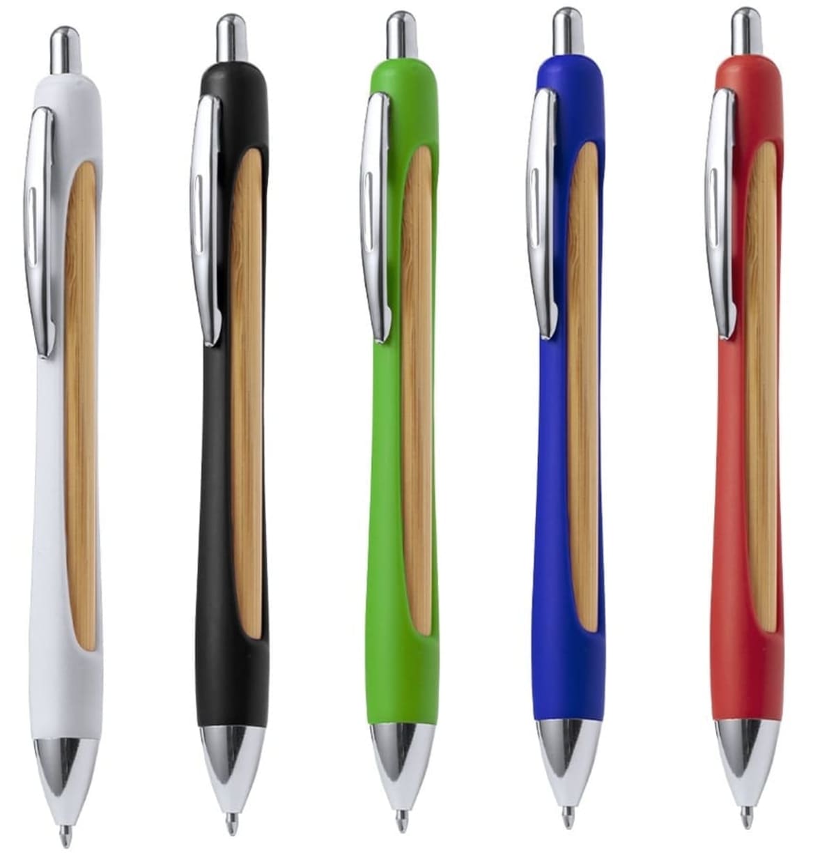 Features:  With a distinctive design combining bamboo and RABS, and available in a variety of vibrant colours all along the barrel. Blue ink, with chrome plated button, clip and tip. Presented individually in a recycled bag.RABS is a highly recyclable and highl