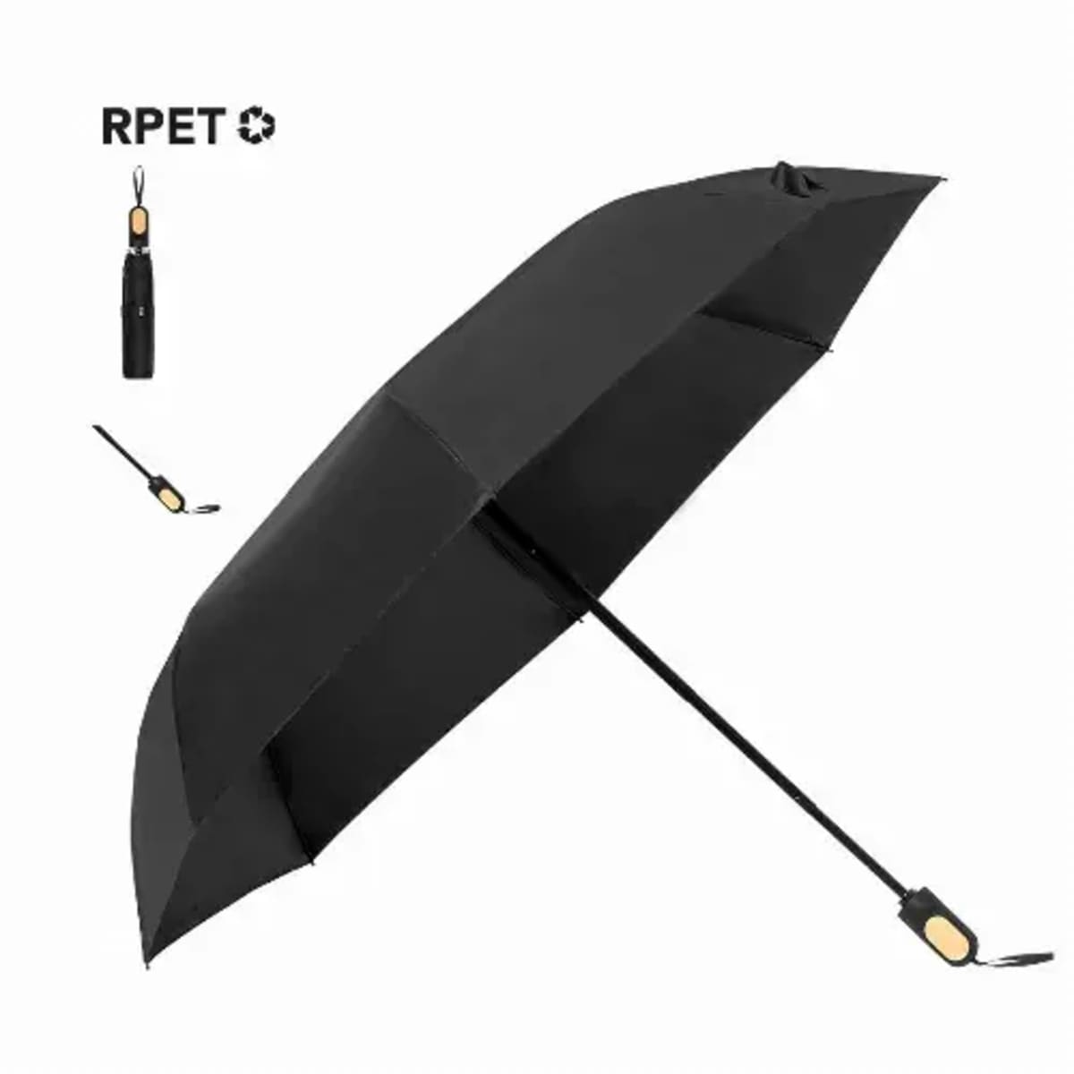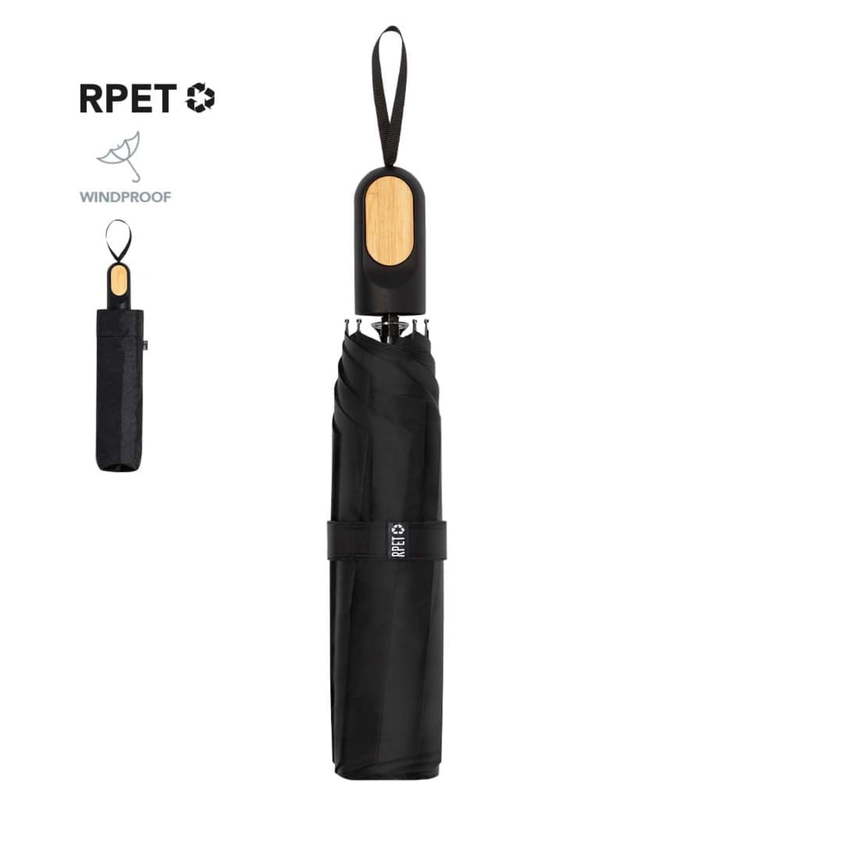 In 190T RPET pongee material.Manual opening, with windproof mechanism and fibreglass ribs. Ergonomic handle with elegant bamboo details, easy to carry due to its drawstring, with sleeve and matching velcro fastening. With RPET label and presented in
