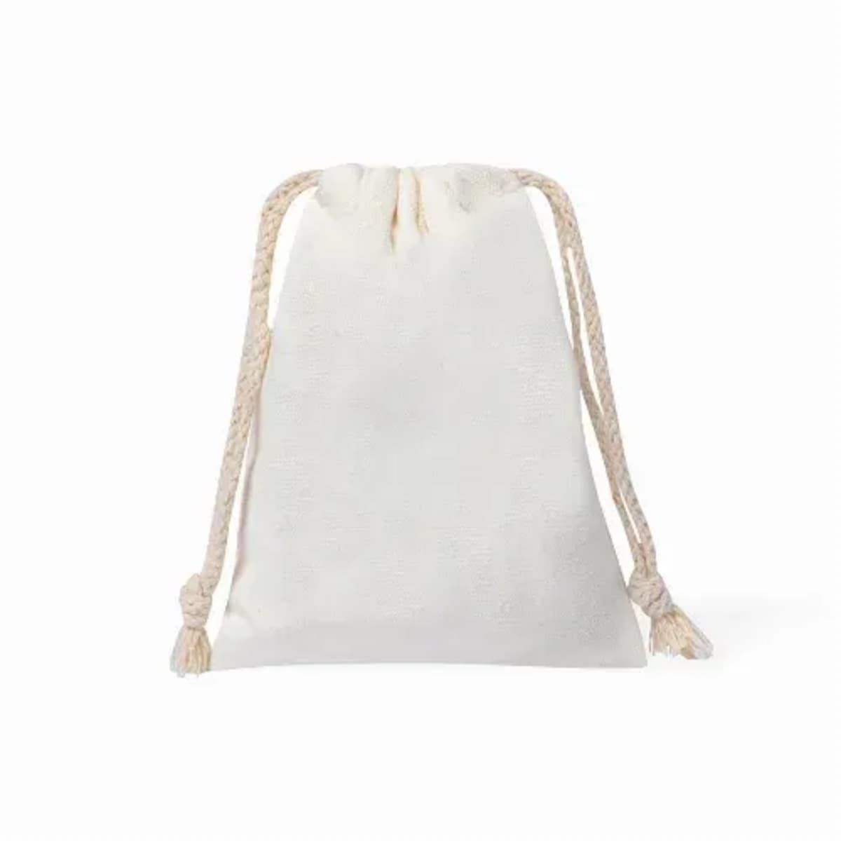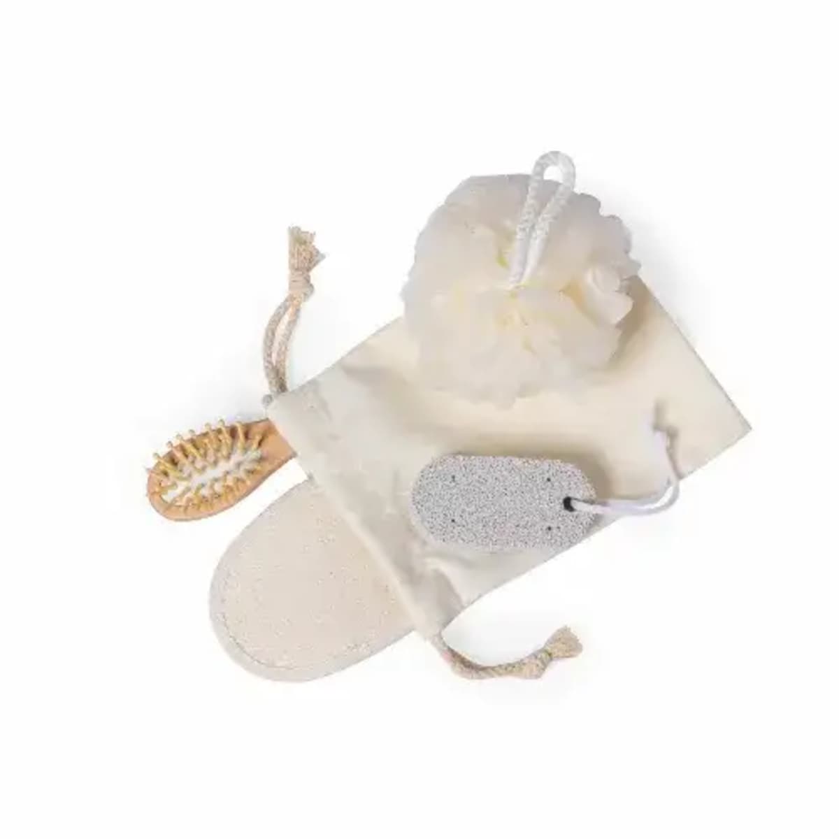 Complete bath set with 4 accessories, presented in a practical, self-closing cotton bag.