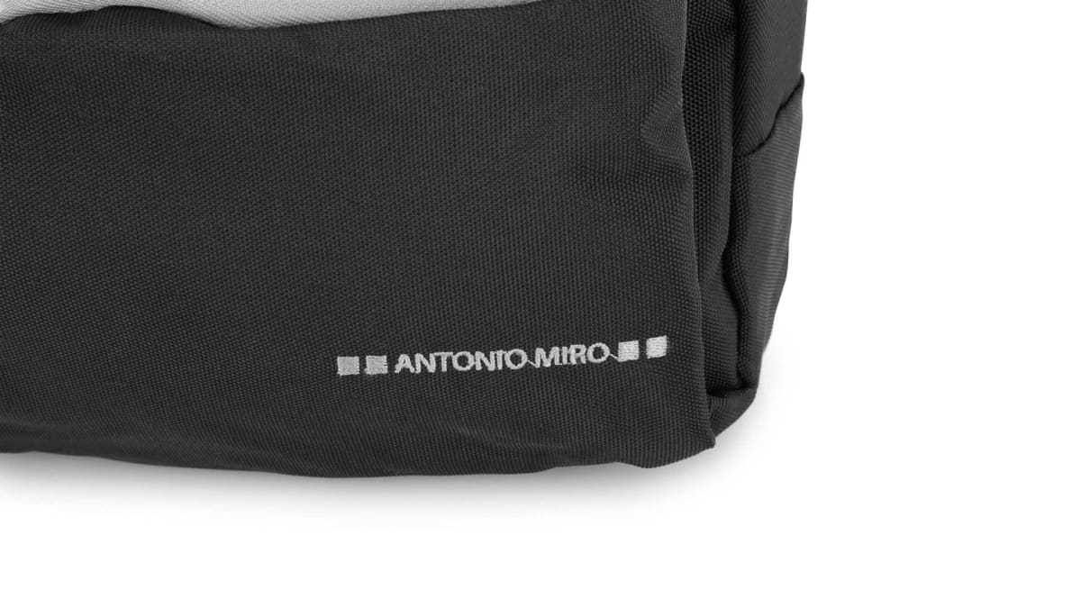 Multi purpose beauty bag by Antonio Miró in nylon with sober black colour design. Main compartment with zipper closure and carrying handle. Outside zipper pocket. Label with the brand logo.