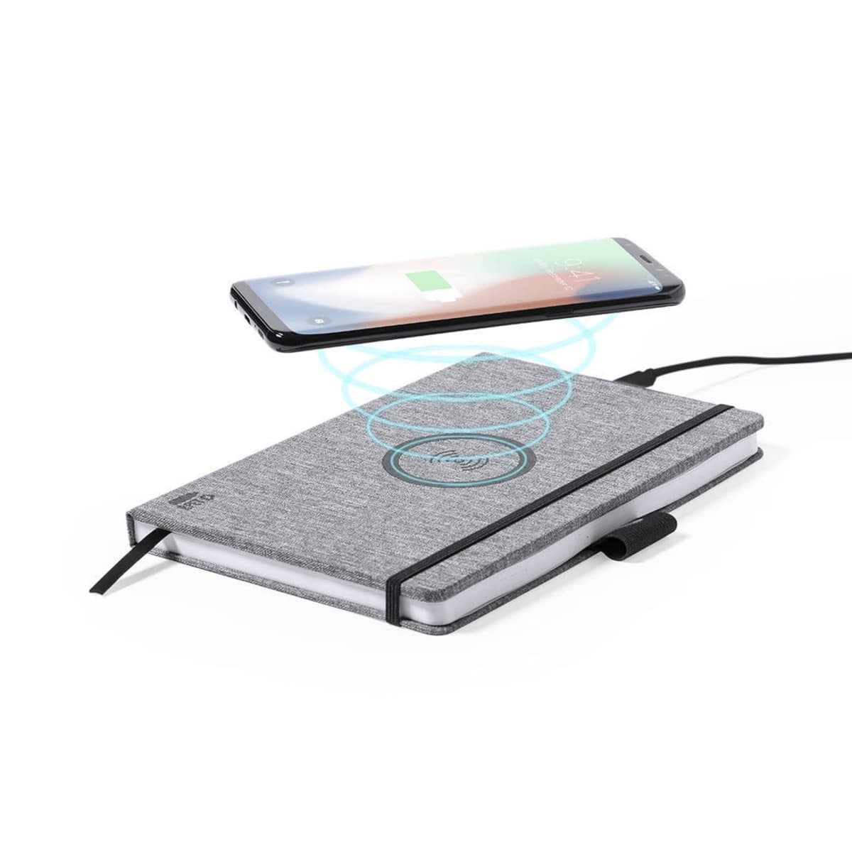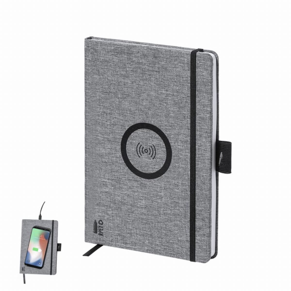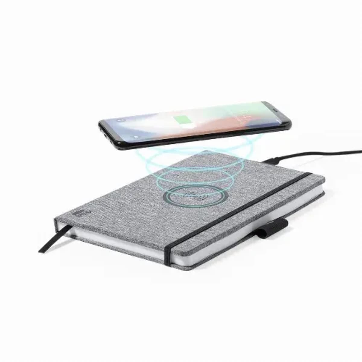 With 10W wireless charger integrated in the cover. Including 80 sheets with single-stripe layout. Compatible with smartphones with wireless charging technology. Type C charging cable and instruction manual in English and Spanish.