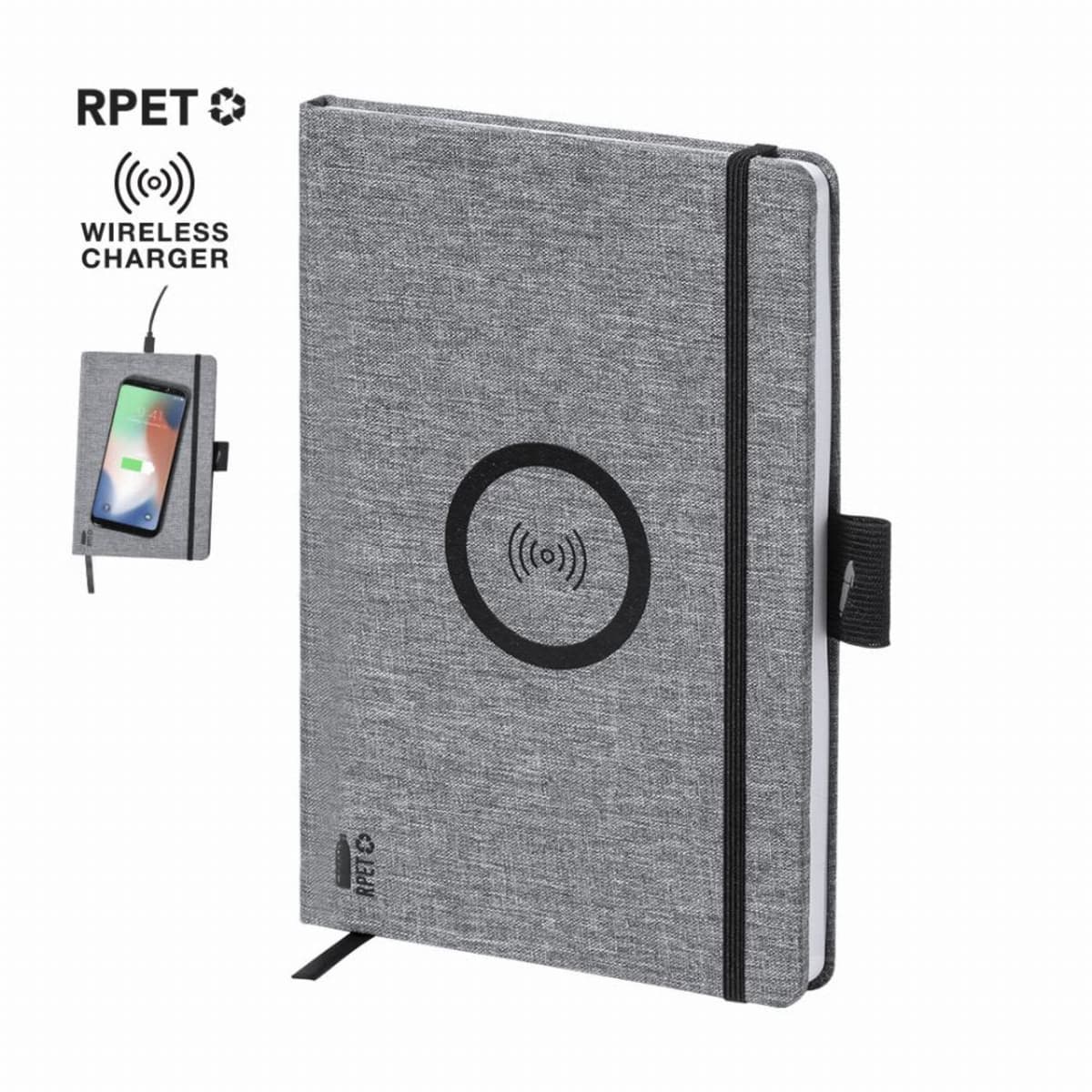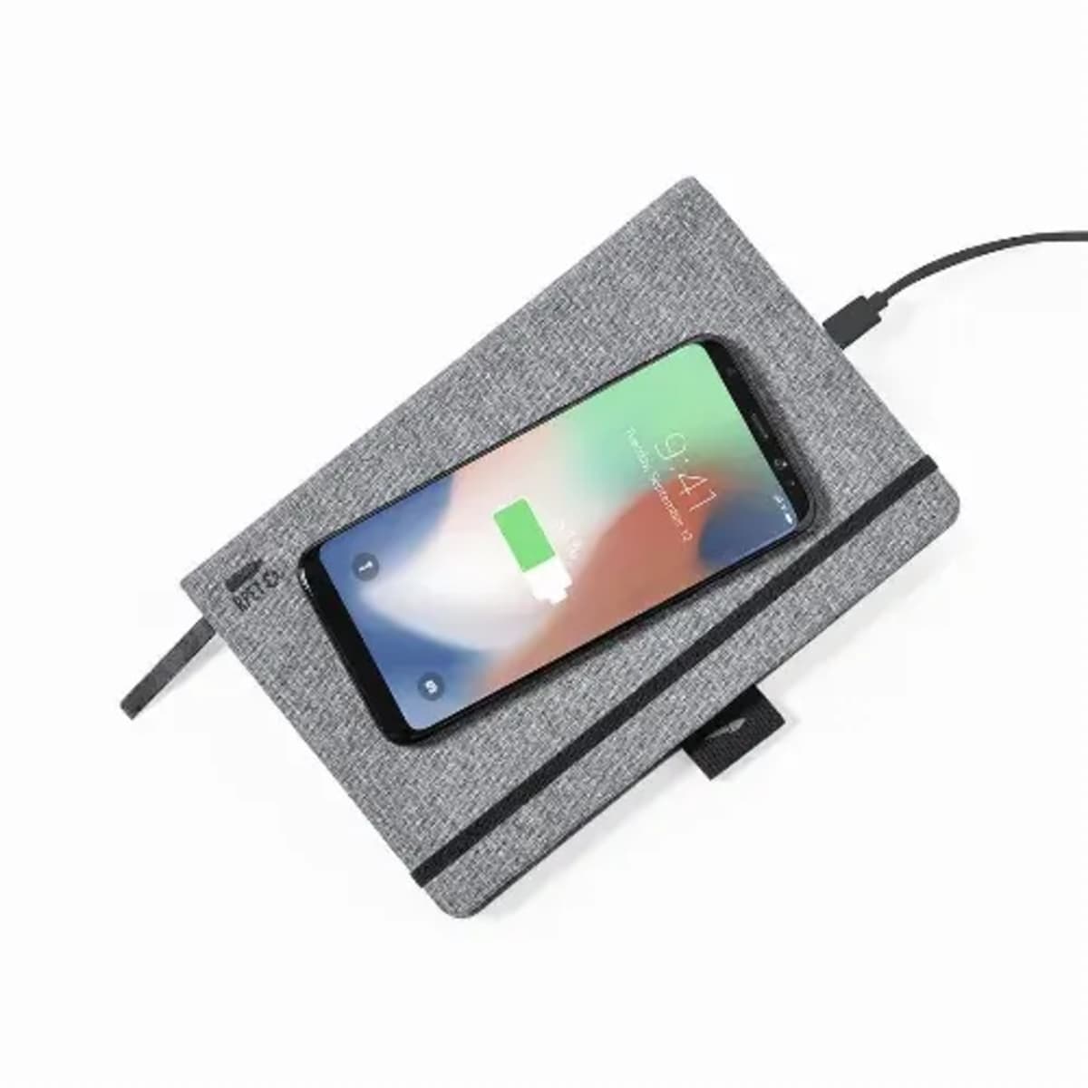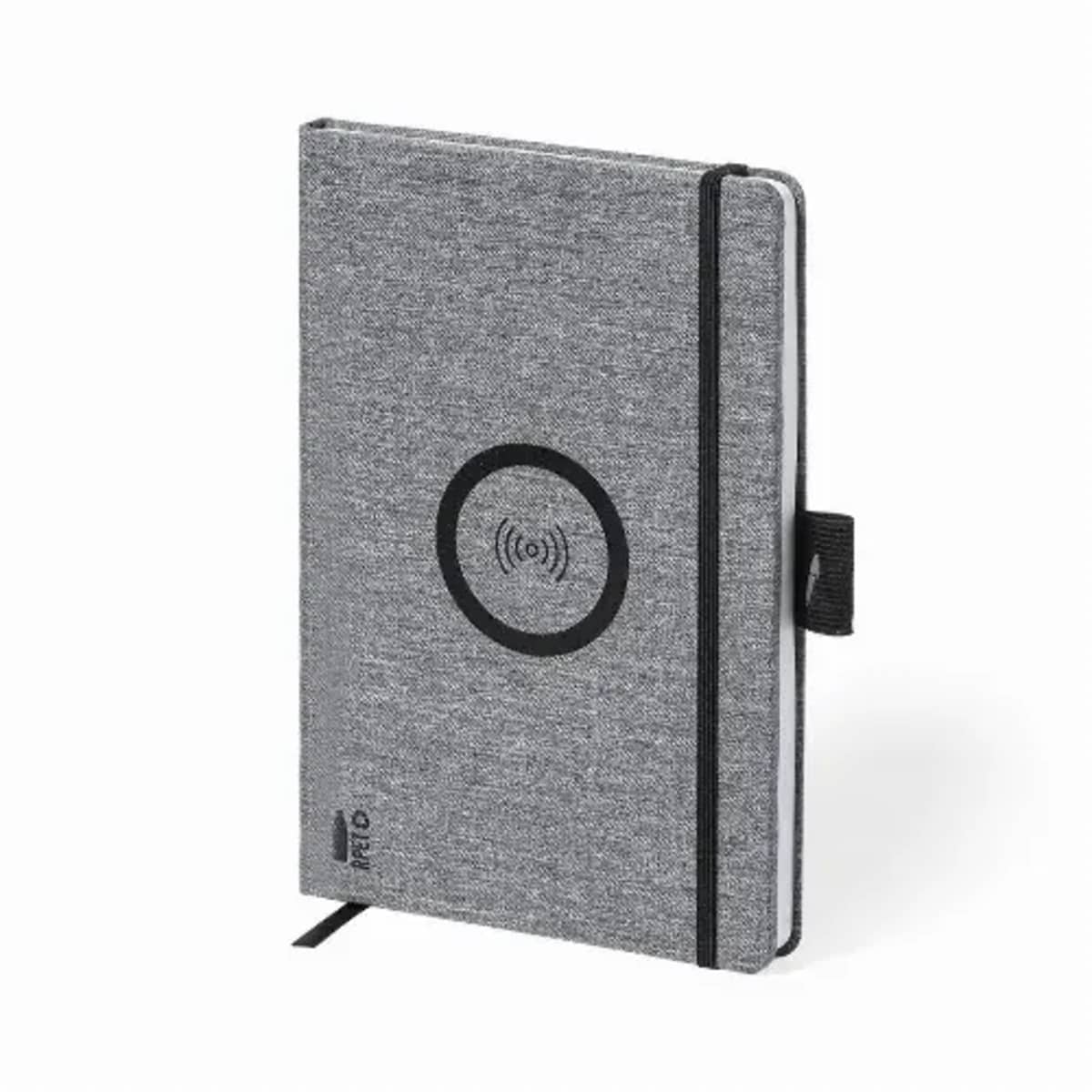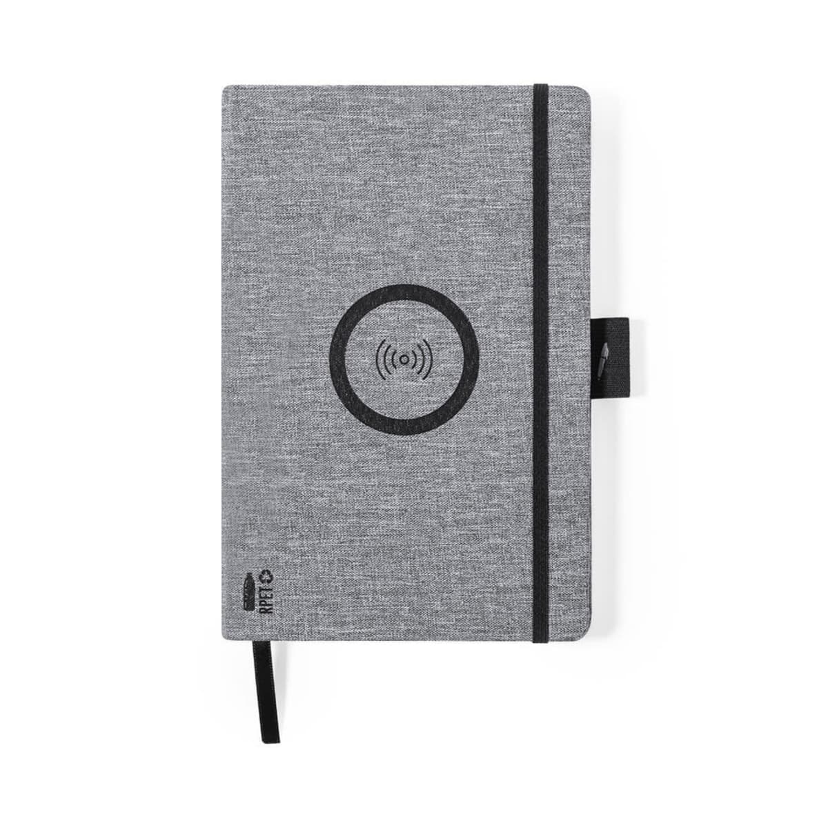 With 10W wireless charger integrated in the cover. Including 80 sheets with single-stripe layout. Compatible with smartphones with wireless charging technology. Type C charging cable and instruction manual in English and Spanish.