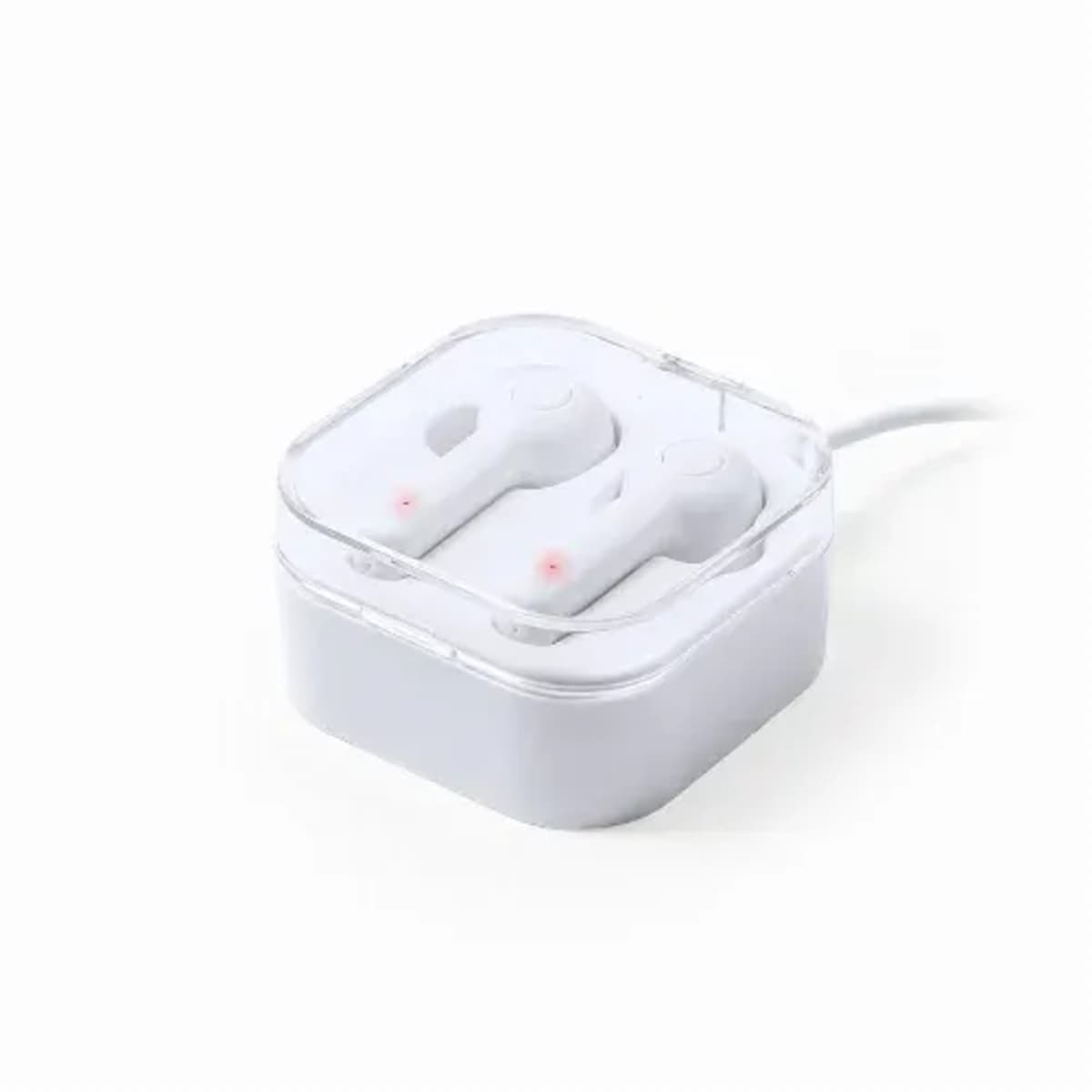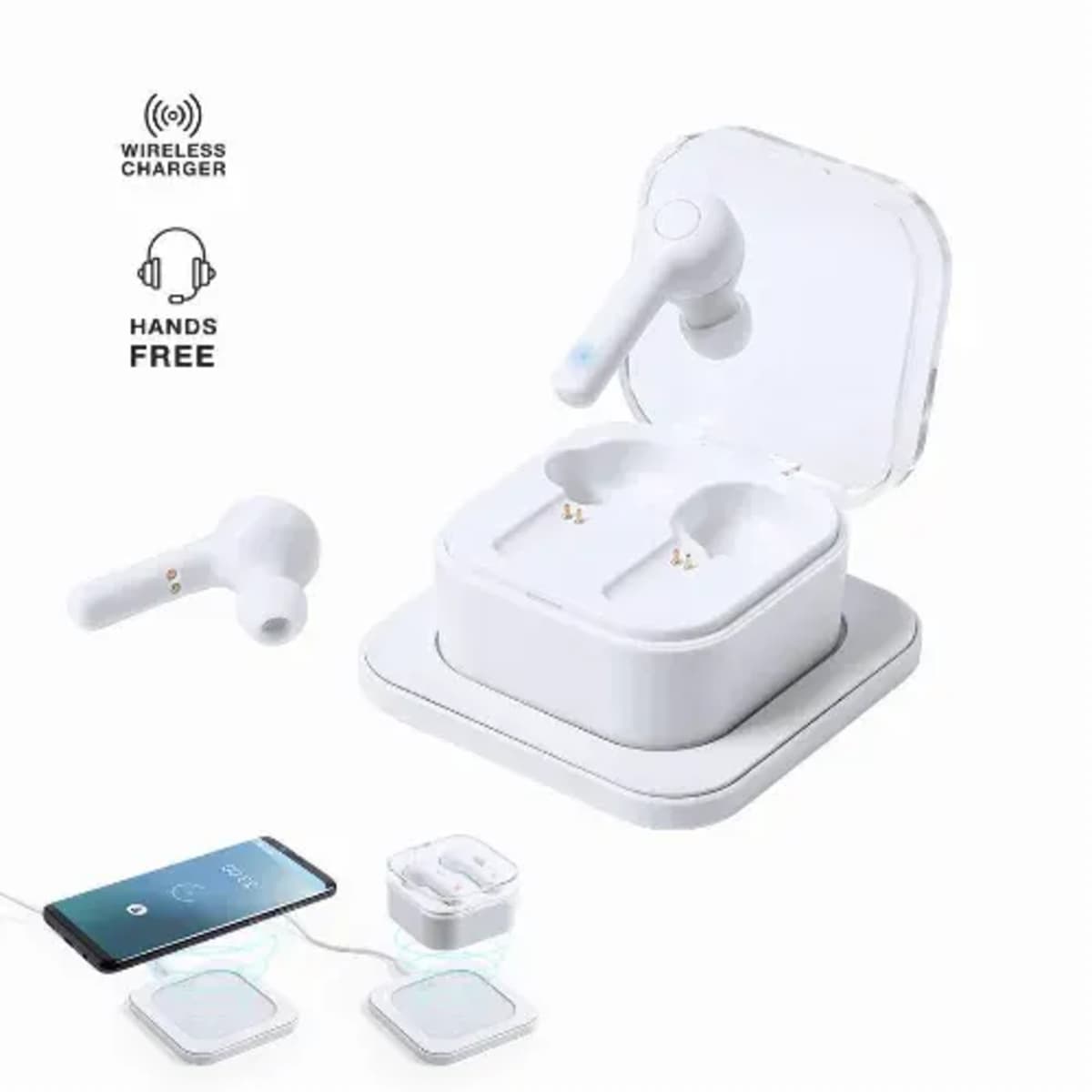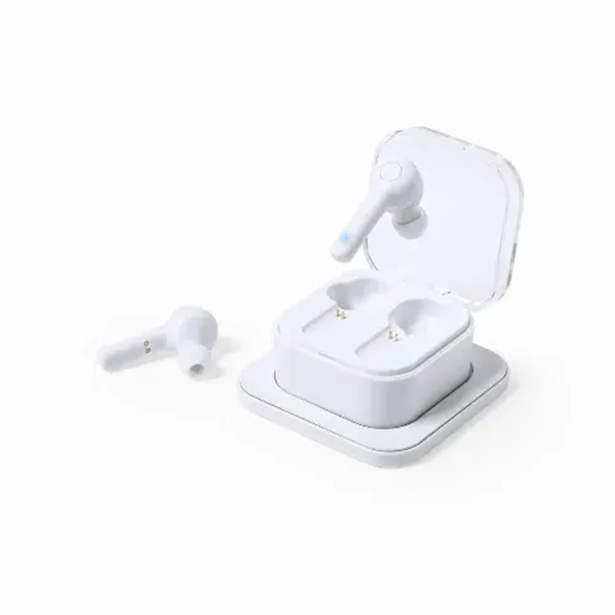 In elegant white finish and with ergonomic design. Including a control button integrated in the headset and lithium battery. Matching color charging base and LED charge status light. Hands-free and rechargeable function, including charging cable. Pre