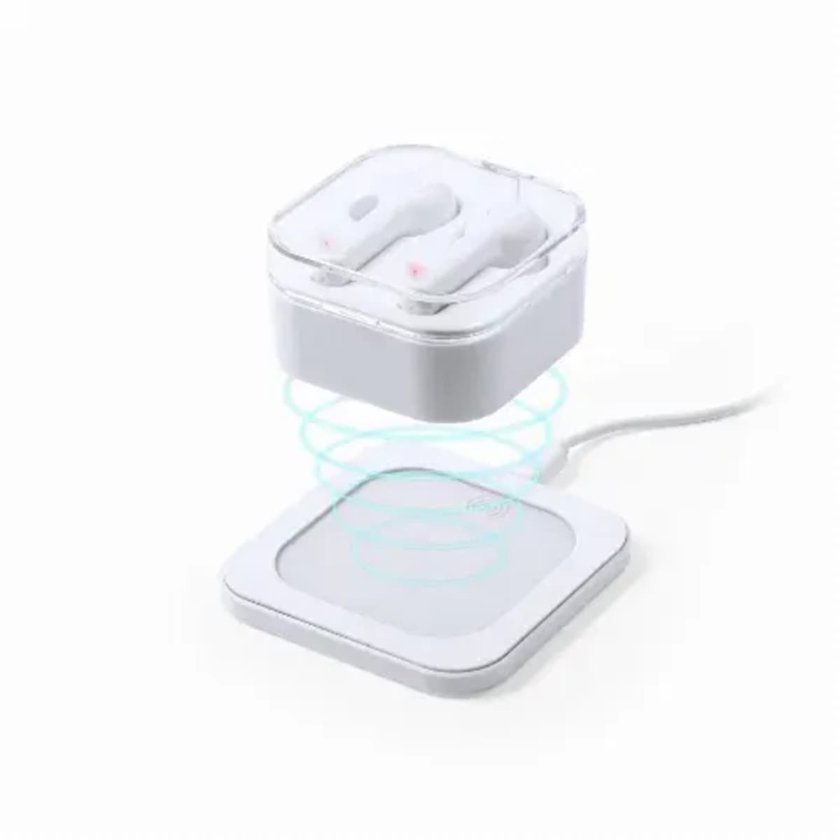 Bluetooth® 5.0 earphones with 5w wireless charging base, compatible with devices equipped with wireless charging technology.