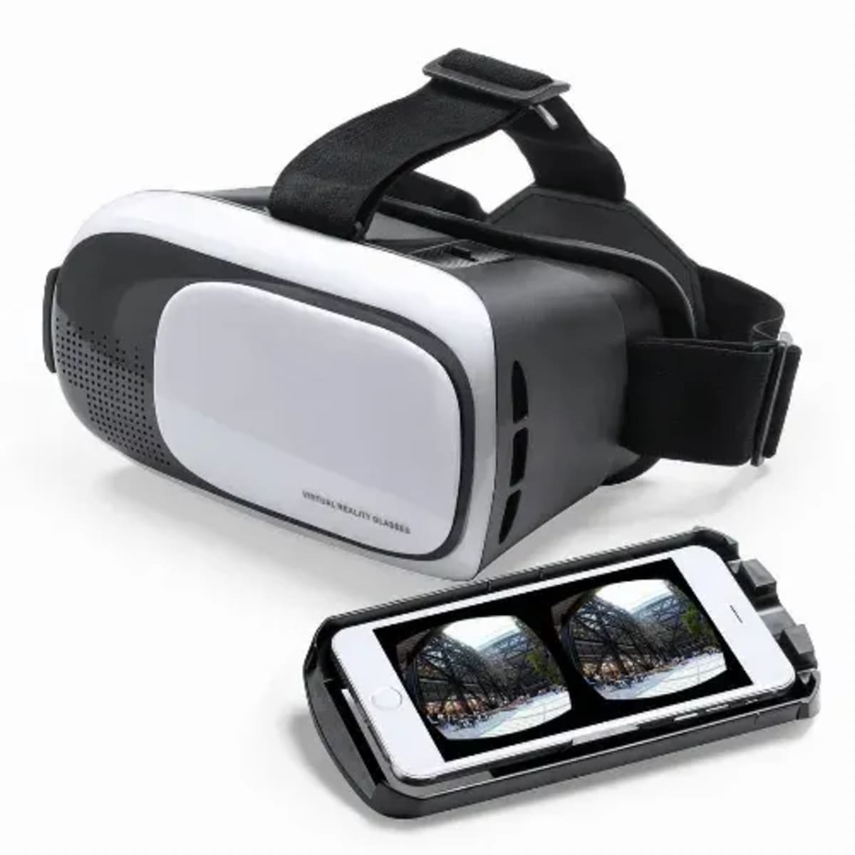 Virtual Reality glasses with adjustable lenses and tray for all types of smartphones.