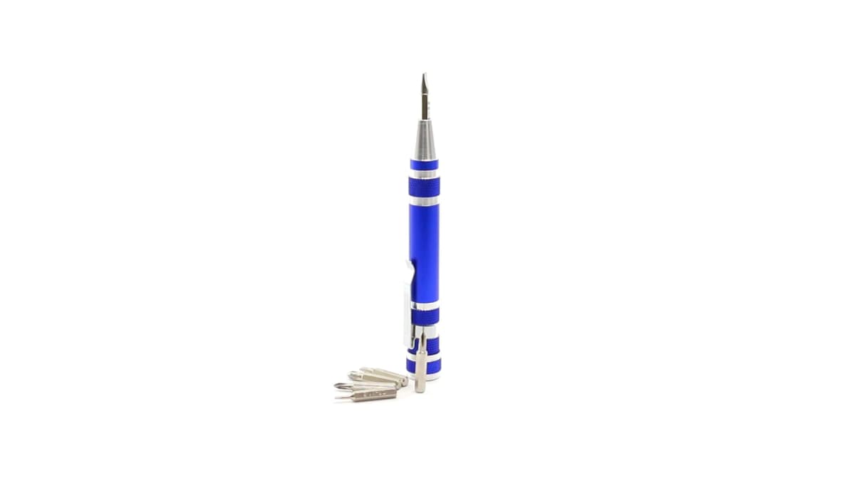 With non-slip body and metal clip. Includes 6 flat and cross-head screwdriver heads.