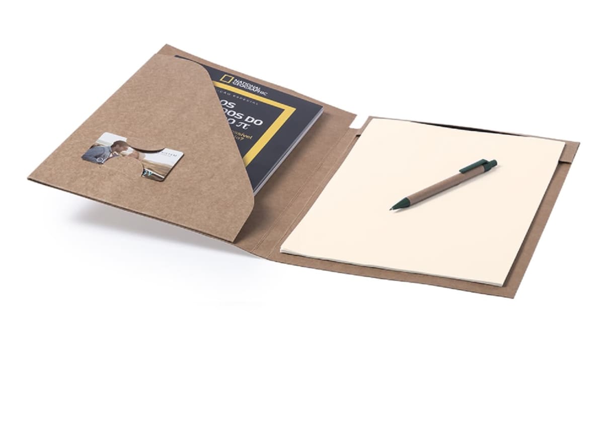 Resistant, rigidly finished recycled cardboard folder with matching color recycled cardboard ball pen included.