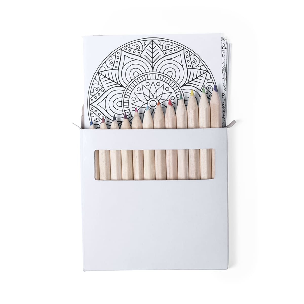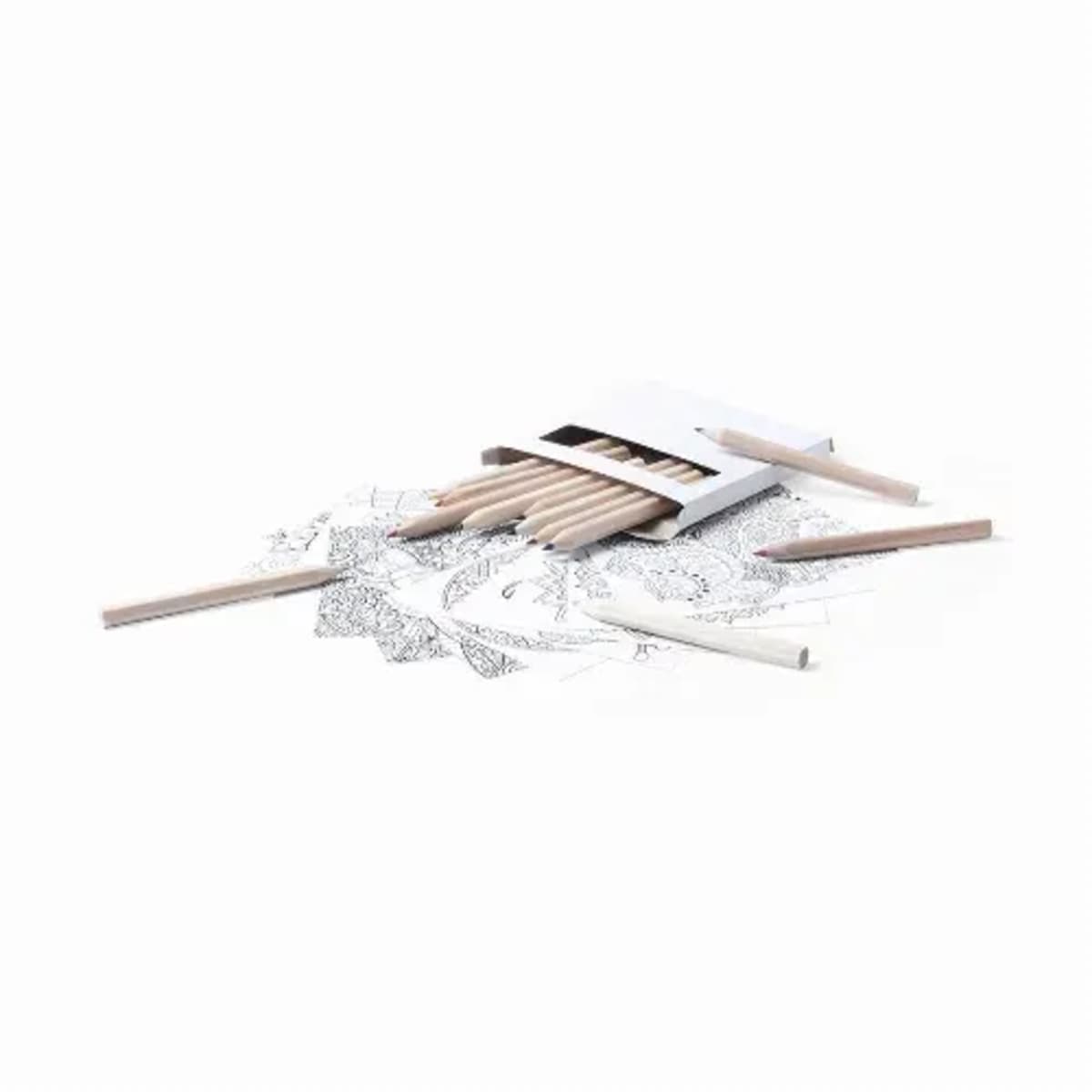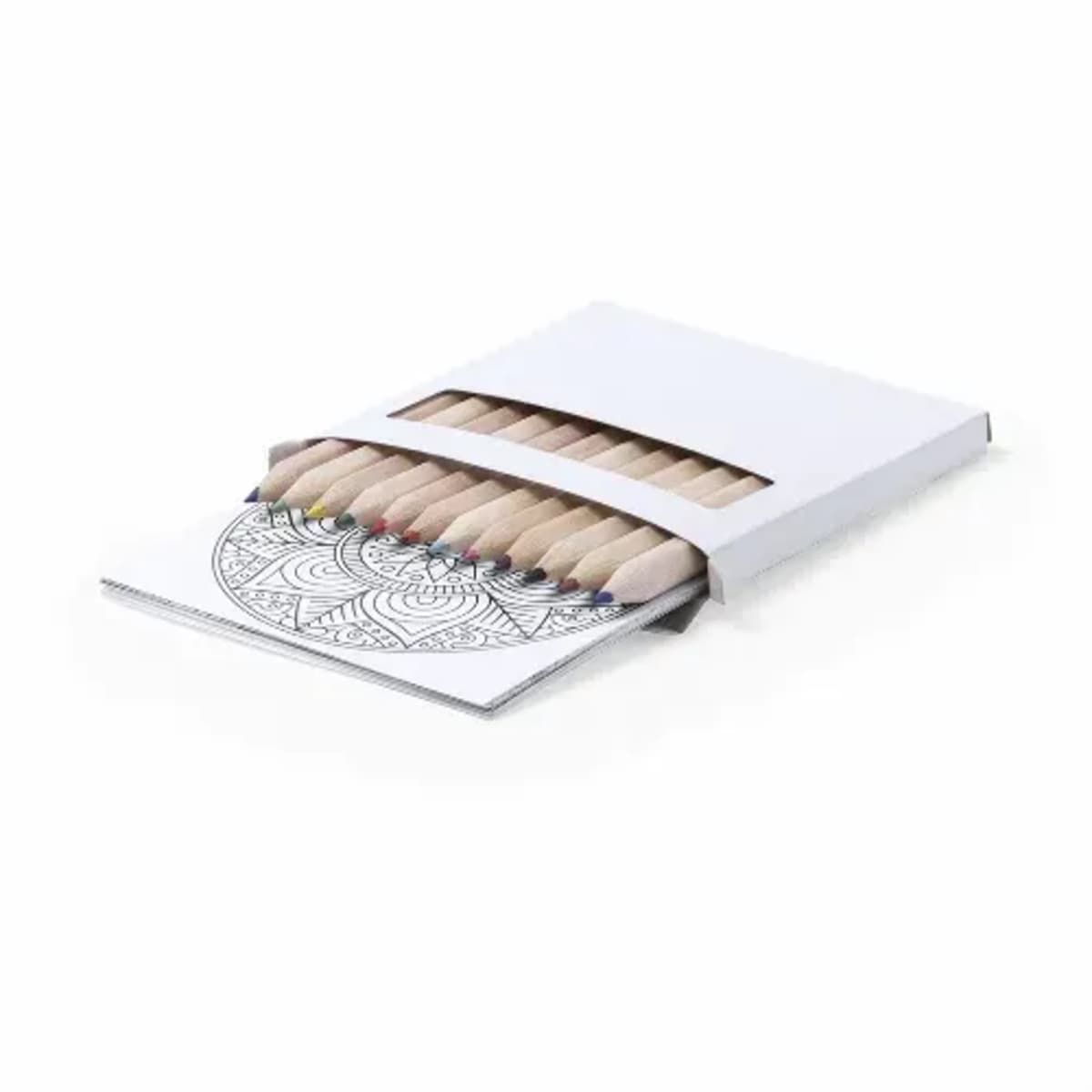 Includes 12 hexagonal body pencils and 12 sheets with different designs. Presented in cardboard box with window.