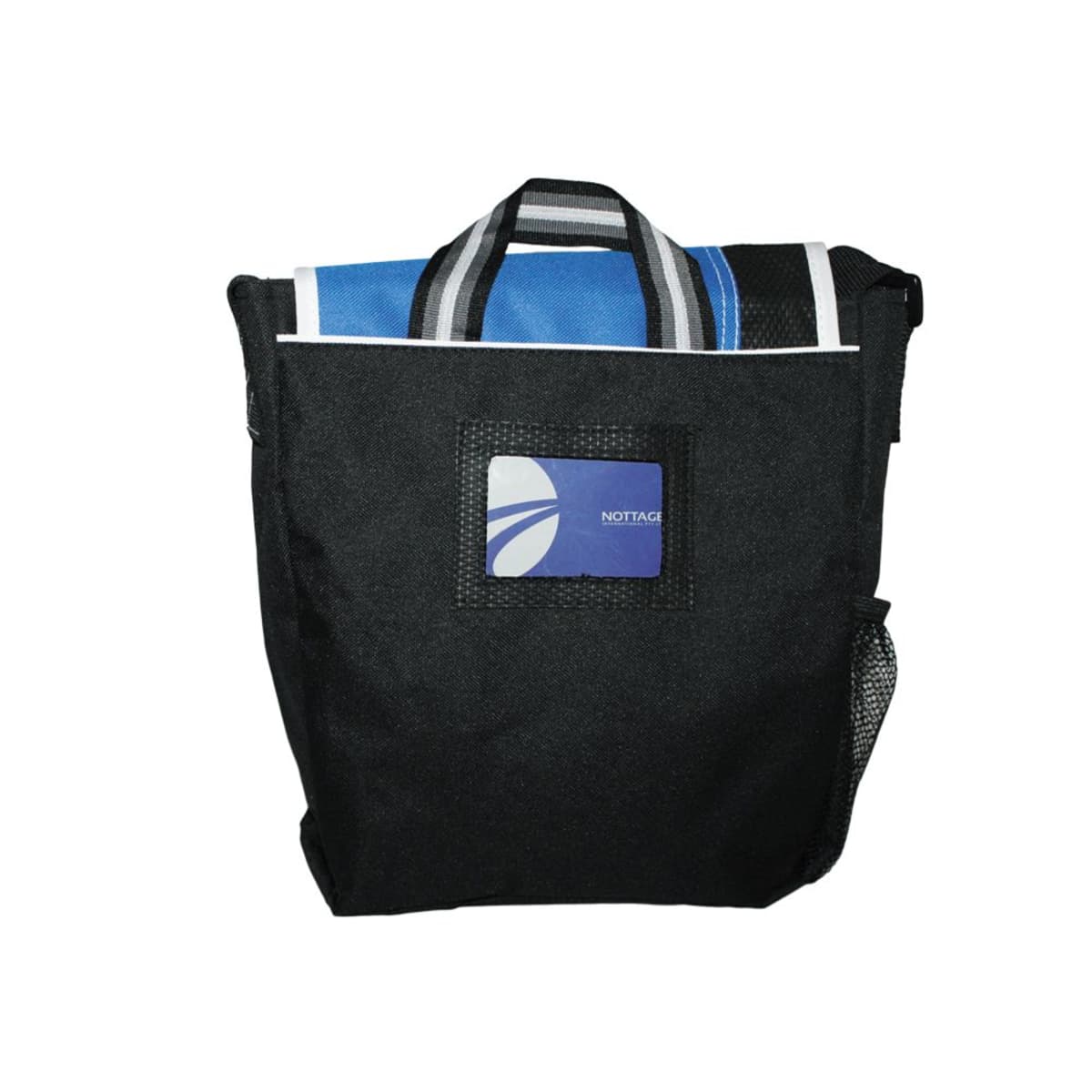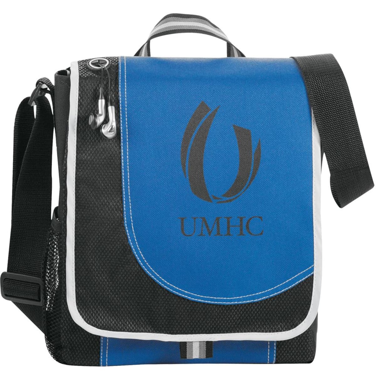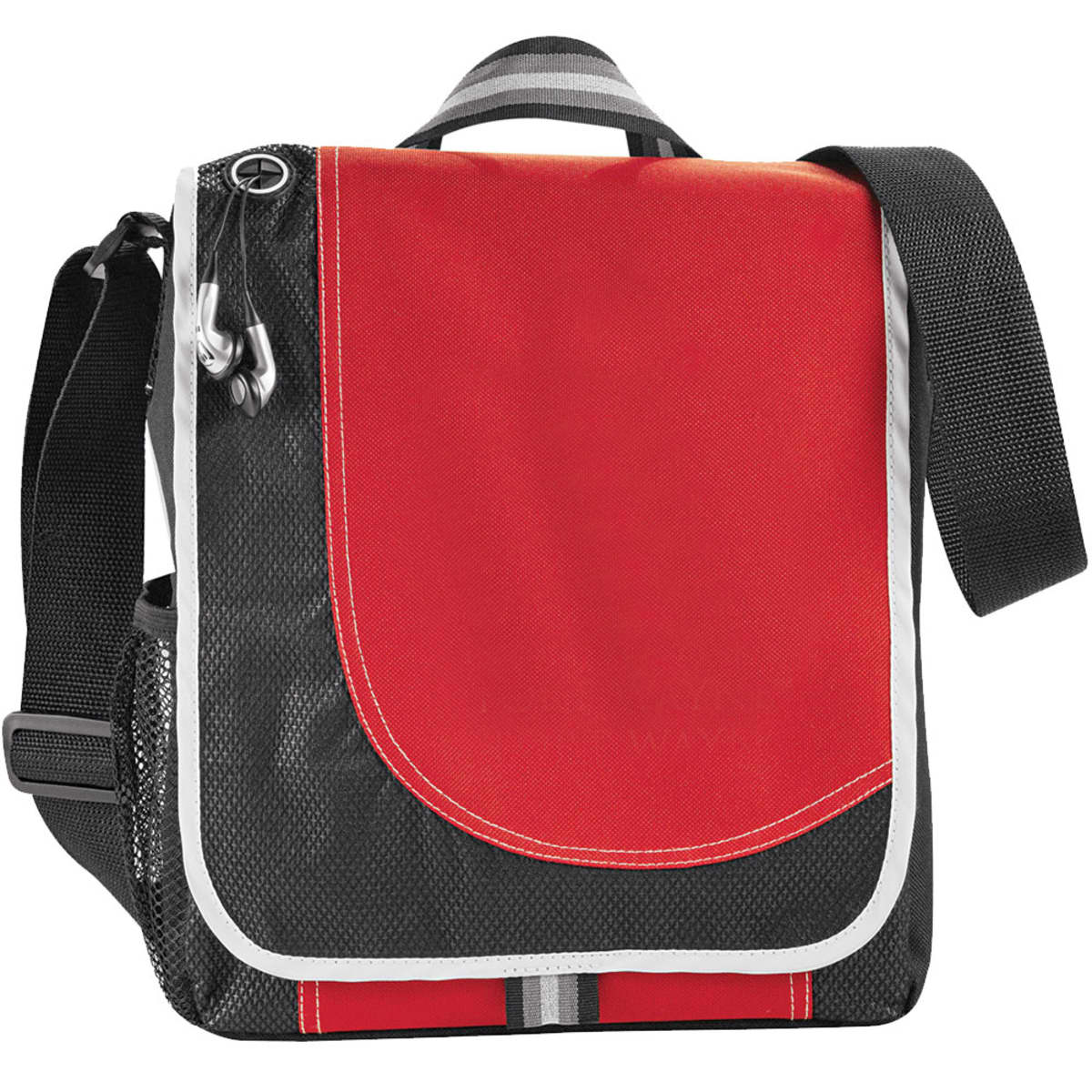 Made from 600D Polyester. Features an open main compartment, media pocket under flap with access to earbud port, side mesh pocket and pen loop. Supplied with business card stitched on bag.