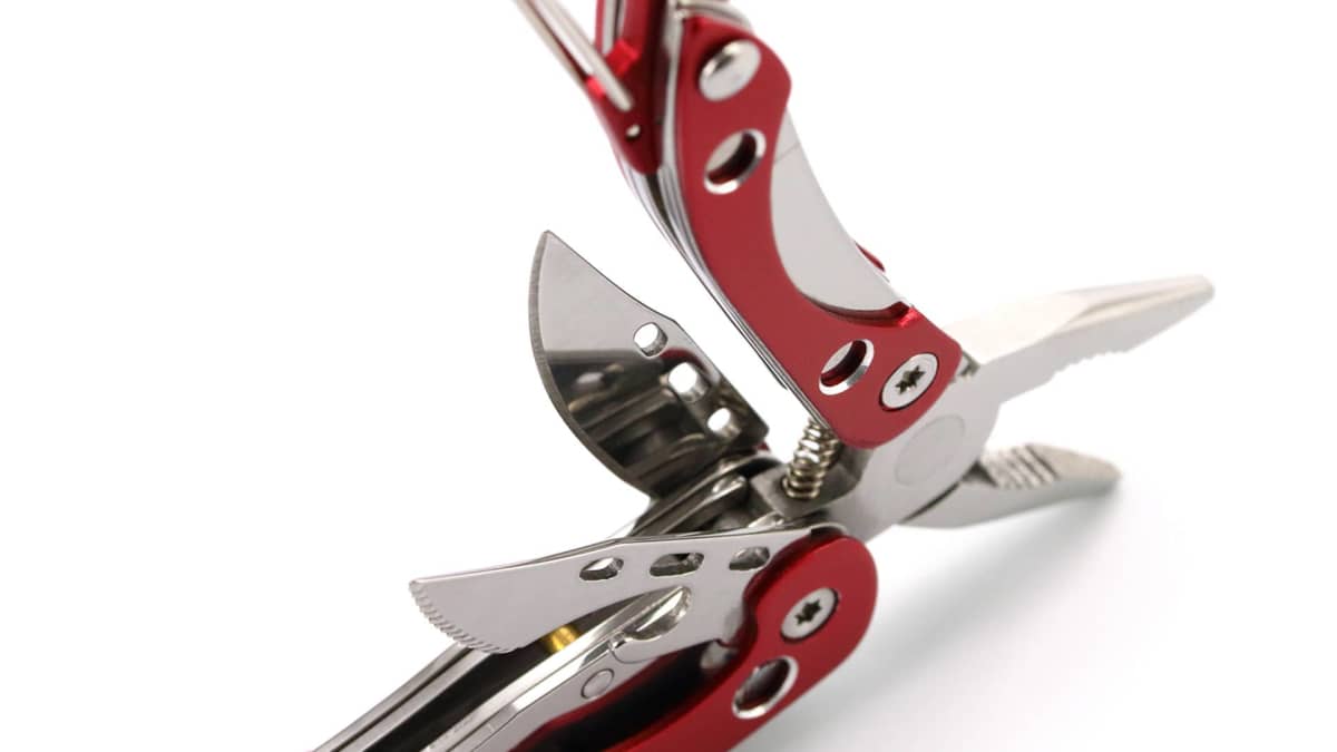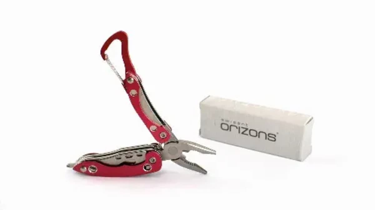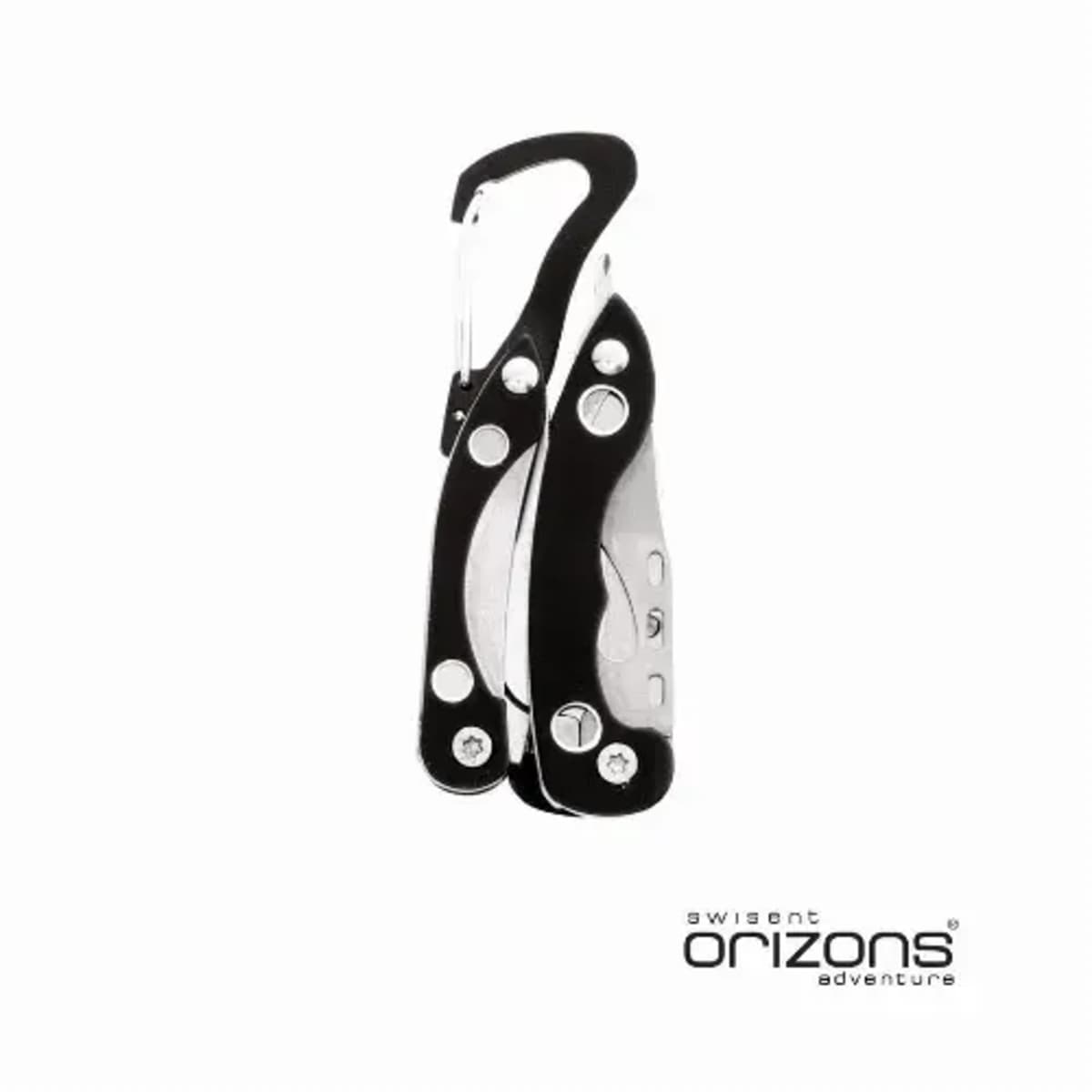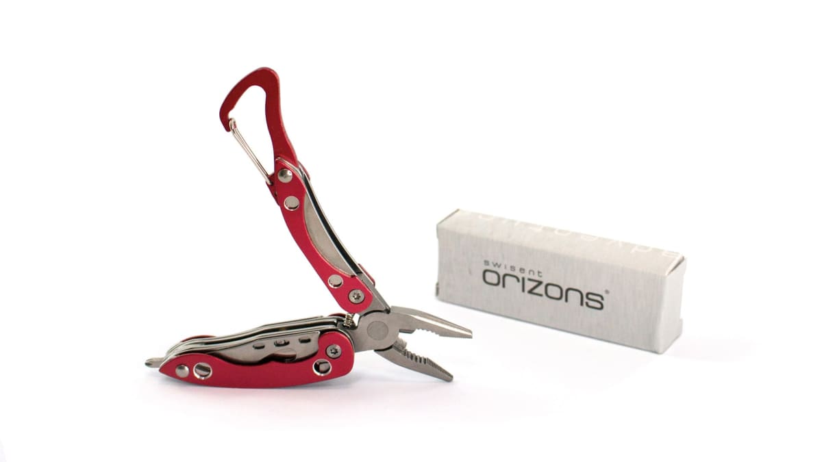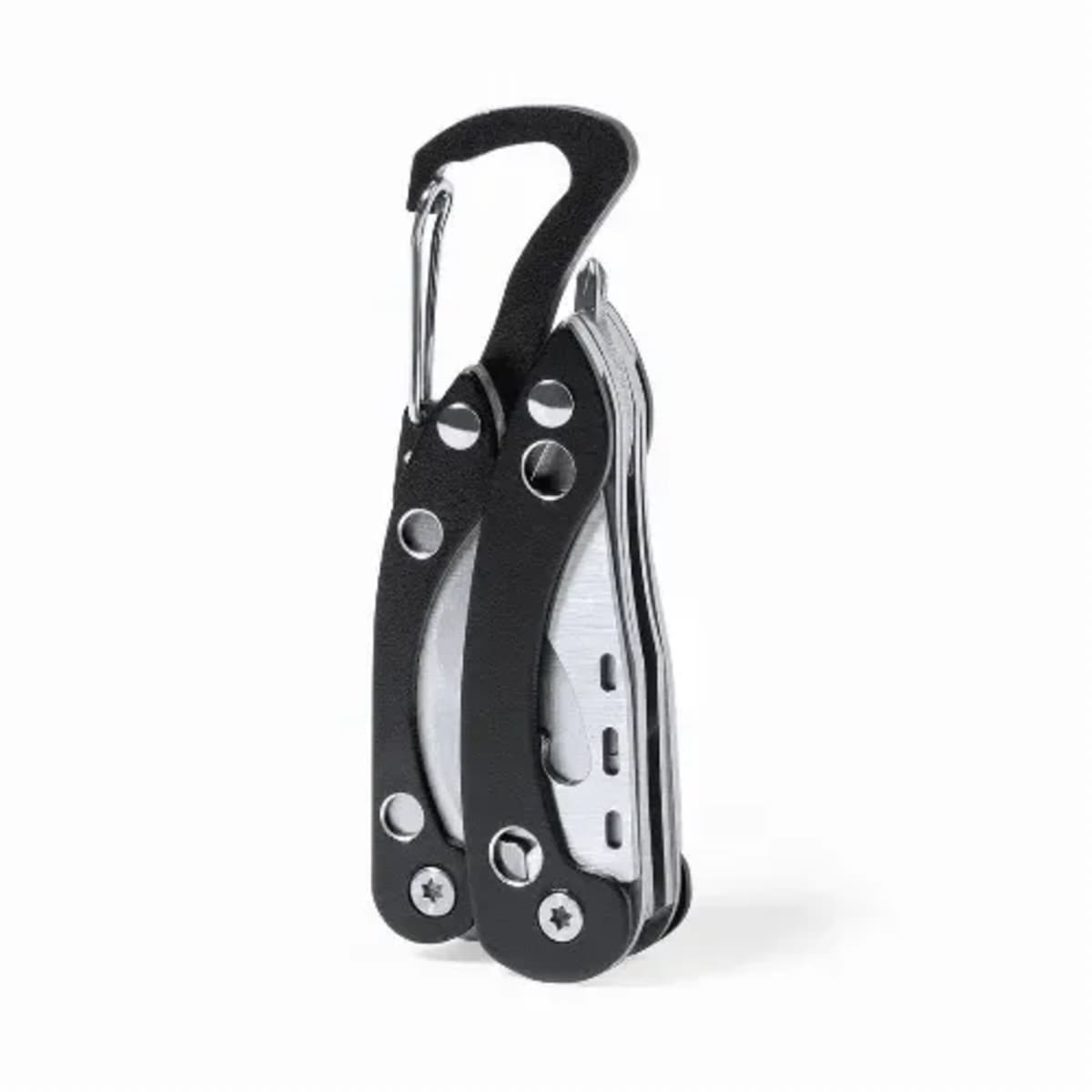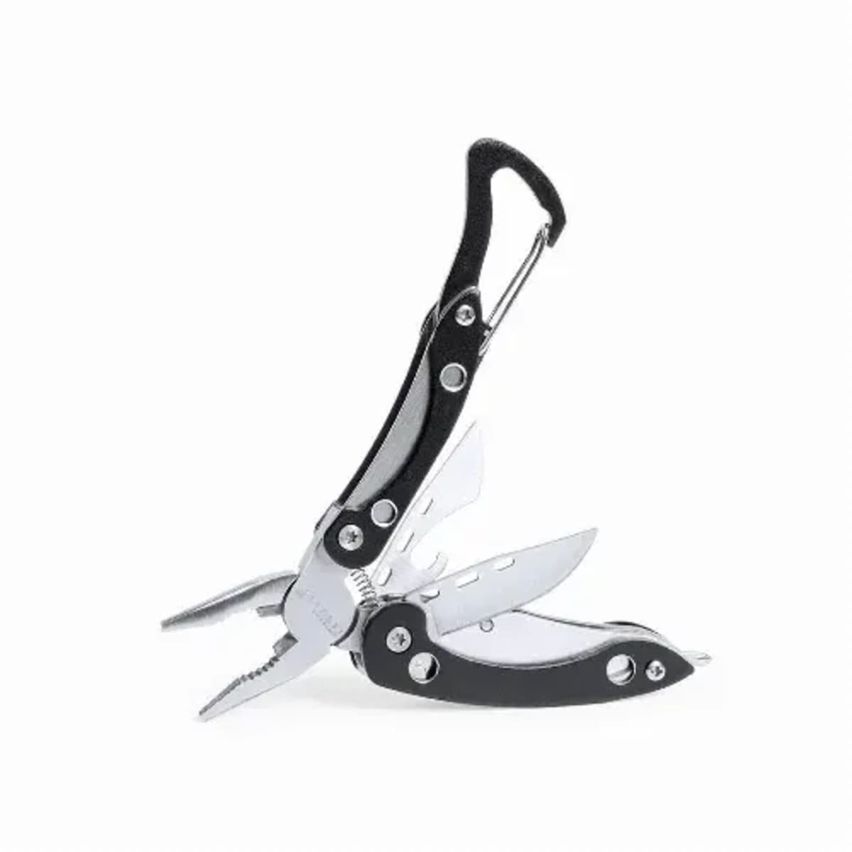 With pliers, razor, can opener with flat-head screwdriver with bottle opener function, star tip detonator and carabiner. Presented in an attractive design box with the brand logo.