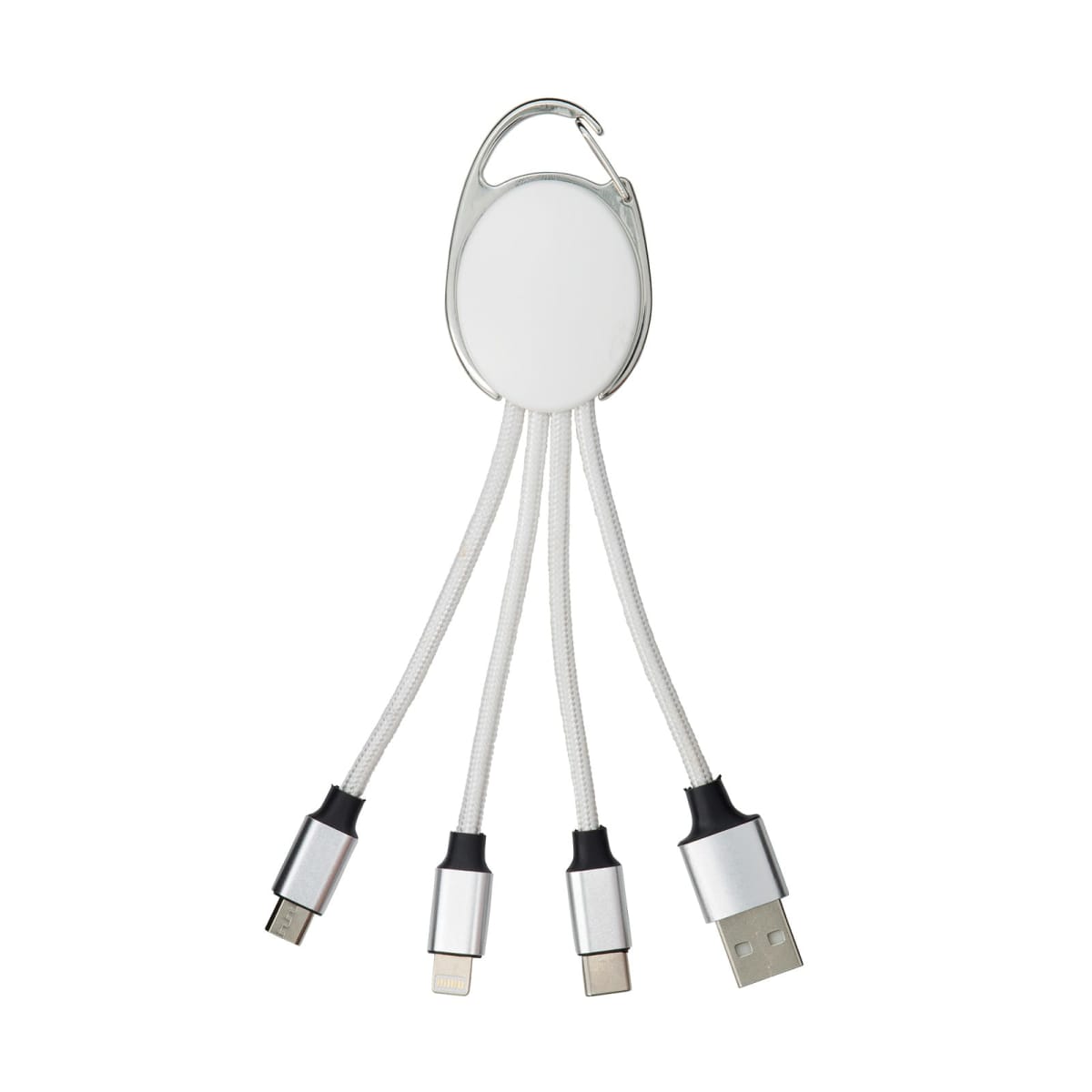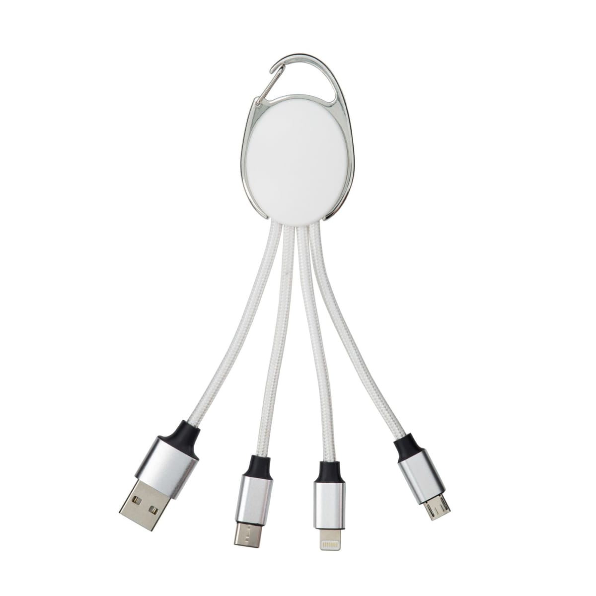 The Boston Cable is a versatile 4-in-1 charging solution designed for convenience on the go. Featuring connectors for Type A, Type C, Lightning, and Micro USB, it covers the most commonly used devices, making it an essential accessory for travel, work, or giveaways. While it does not support data transfer, it’s perfect for keeping your devices charged wherever you are. A carabiner clip makes it easy to attach to a bag, belt, or keyring, ensuring it’s always close at hand.