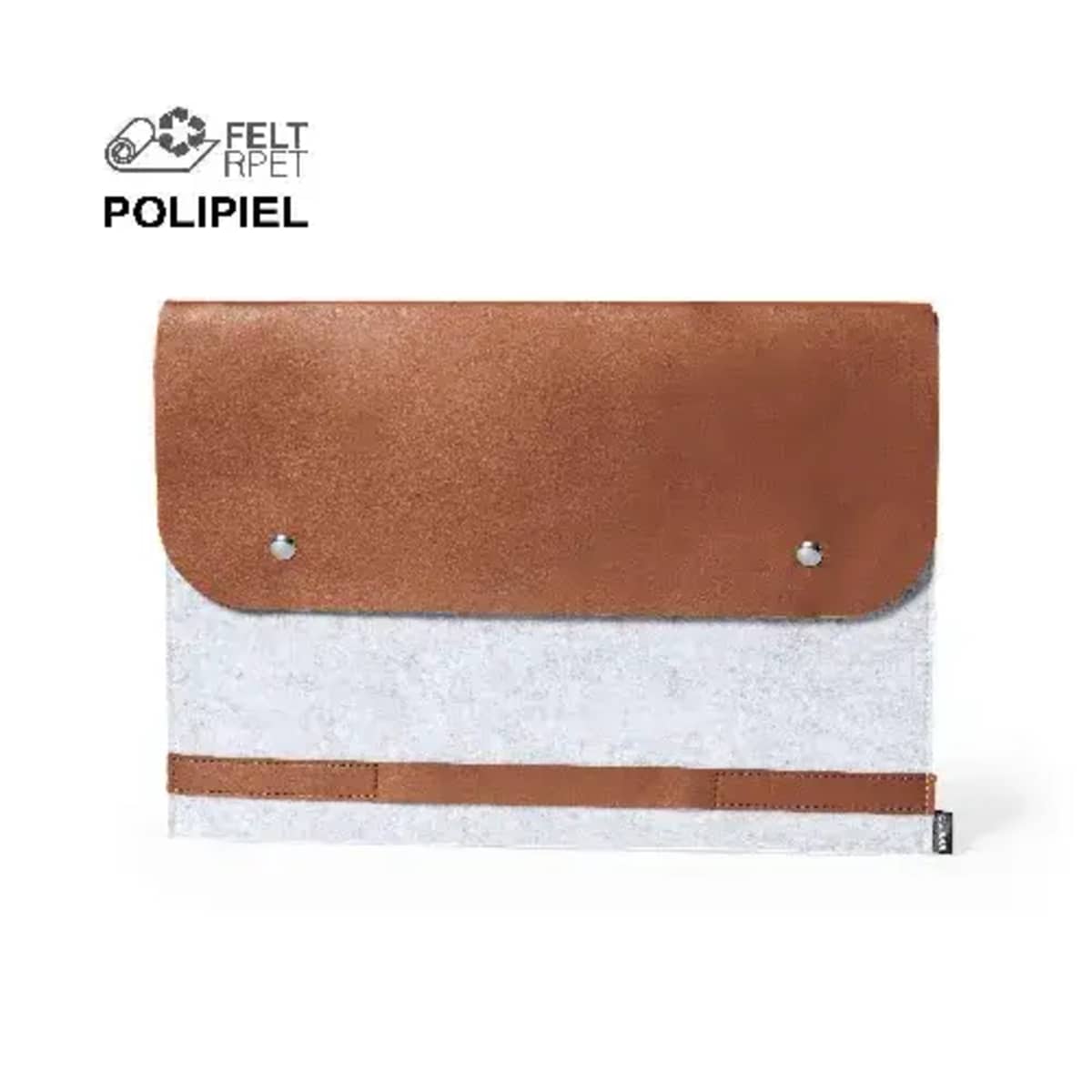 Main compartment with brown PU leather flap and clasp fastenings. Matching color PU leather strap at the base, with handle function. For laptops or tablets up to 14 inches. RPET label outside.Felt RPET is the result of the combination of the recyclin