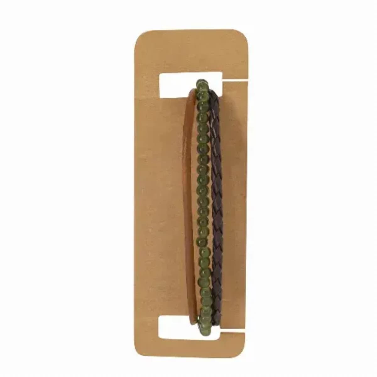 Bracelet made of leather, designed with the combination of three cords: light brown leather with a smooth finish, a central cord with green glass beads, and a third cord of braided brown leather.
