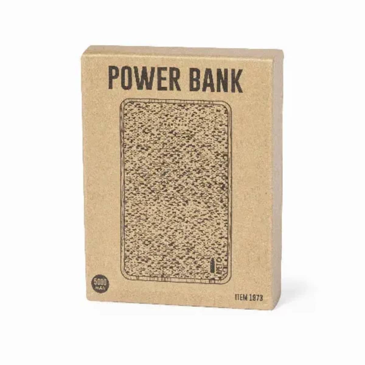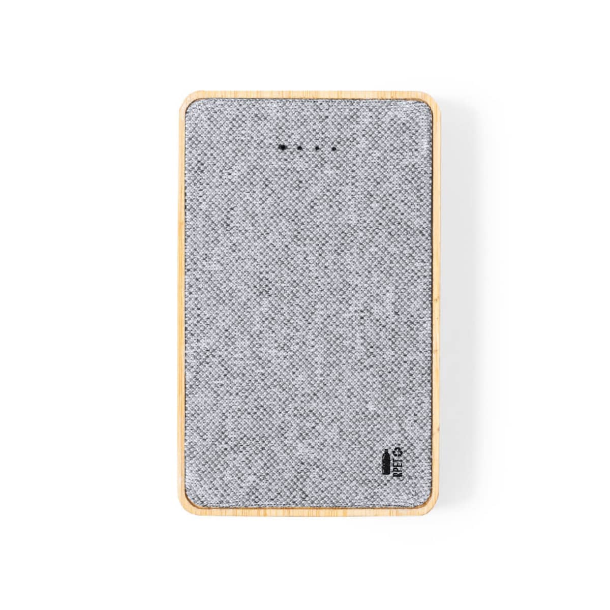 External auxiliary battery of 5,000 mAh, Made in bamboo and RPET material, made from recycled plastic to encourage the reuse of plastic waste and help the sustainability of the planet.