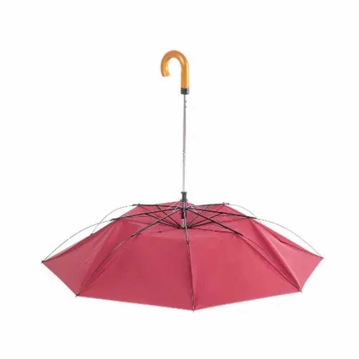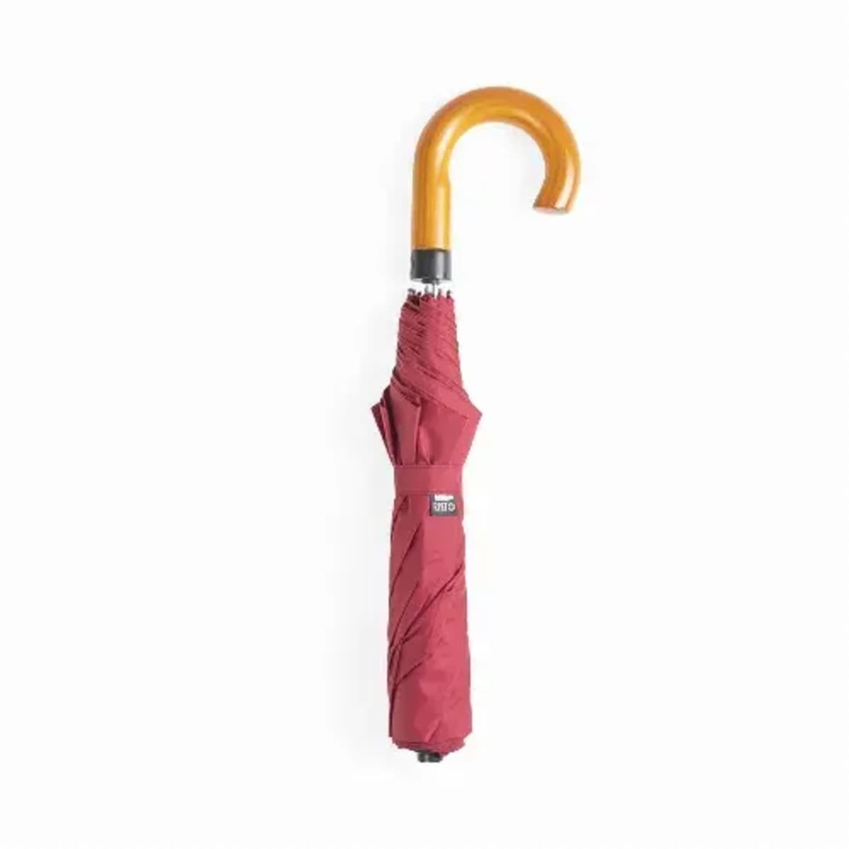 In 190T RPET pongee material, made from recycled plastic, to promote the reuse of plastic waste and help the sustainability of the planet. Automatic opening, with windproof mechanism and metal ribs. Curved wooden handle and RPET emblem on the label.