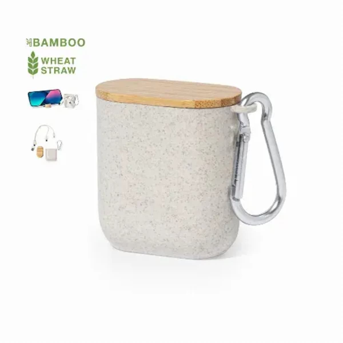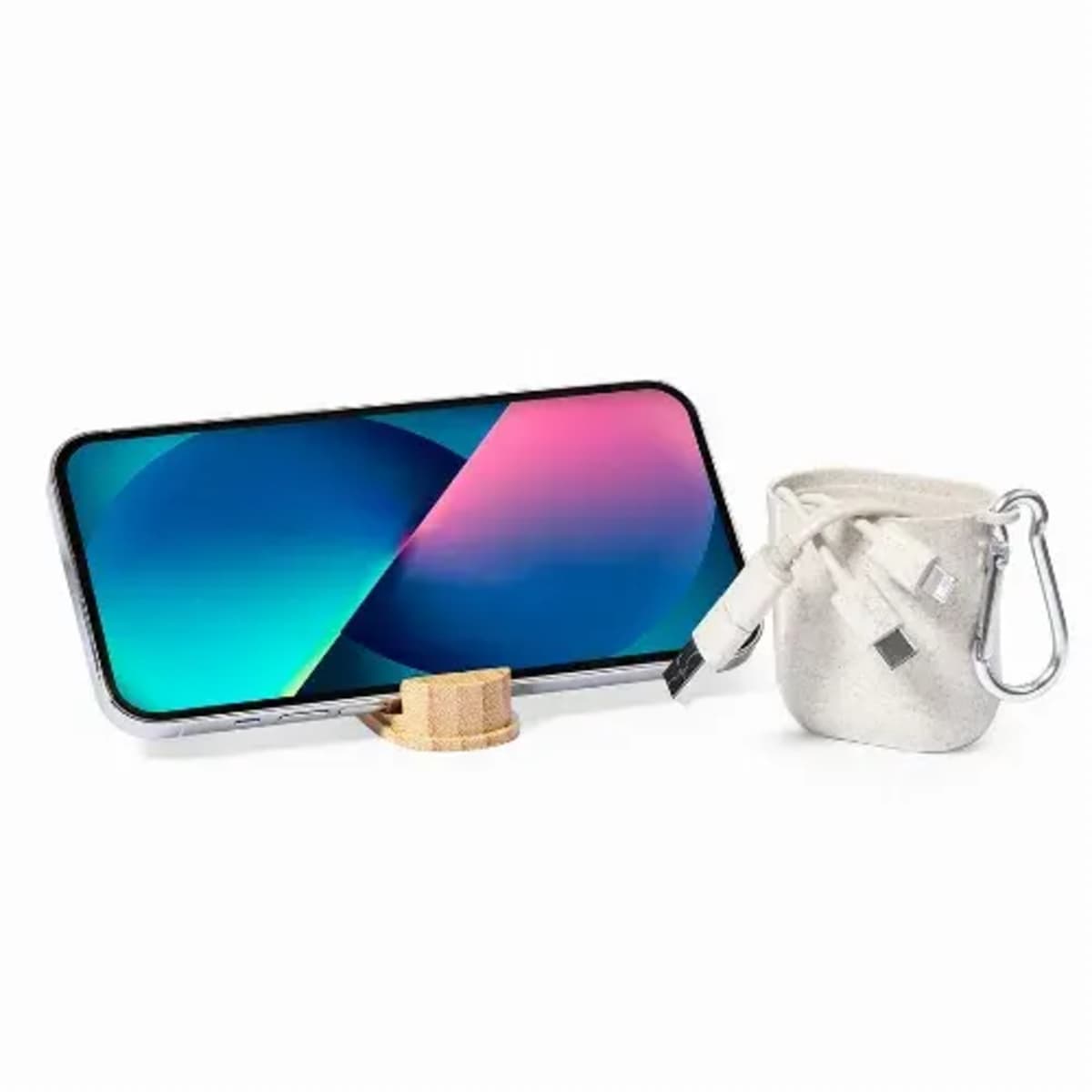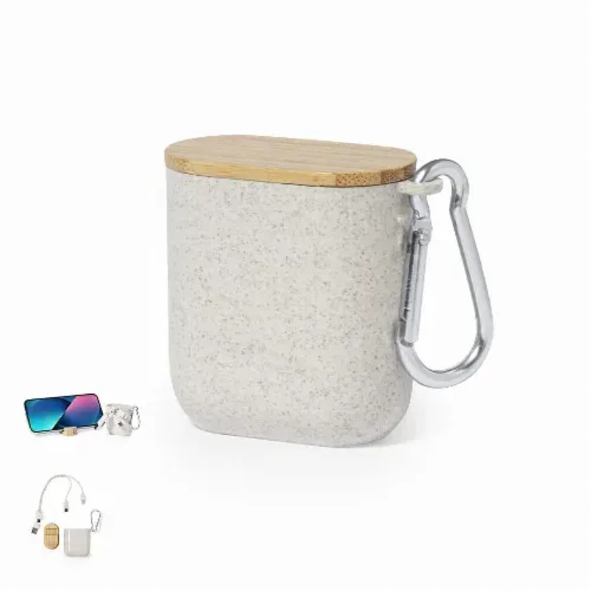 With Type-C and USB input connections and Type-C, Lightning, and Micro USB outputs. 5V DC 2.4A. Presented in an elegant design case made of wheat straw and bamboo closing lid, with holder function for smartphones. Made with vegetal elements to promot