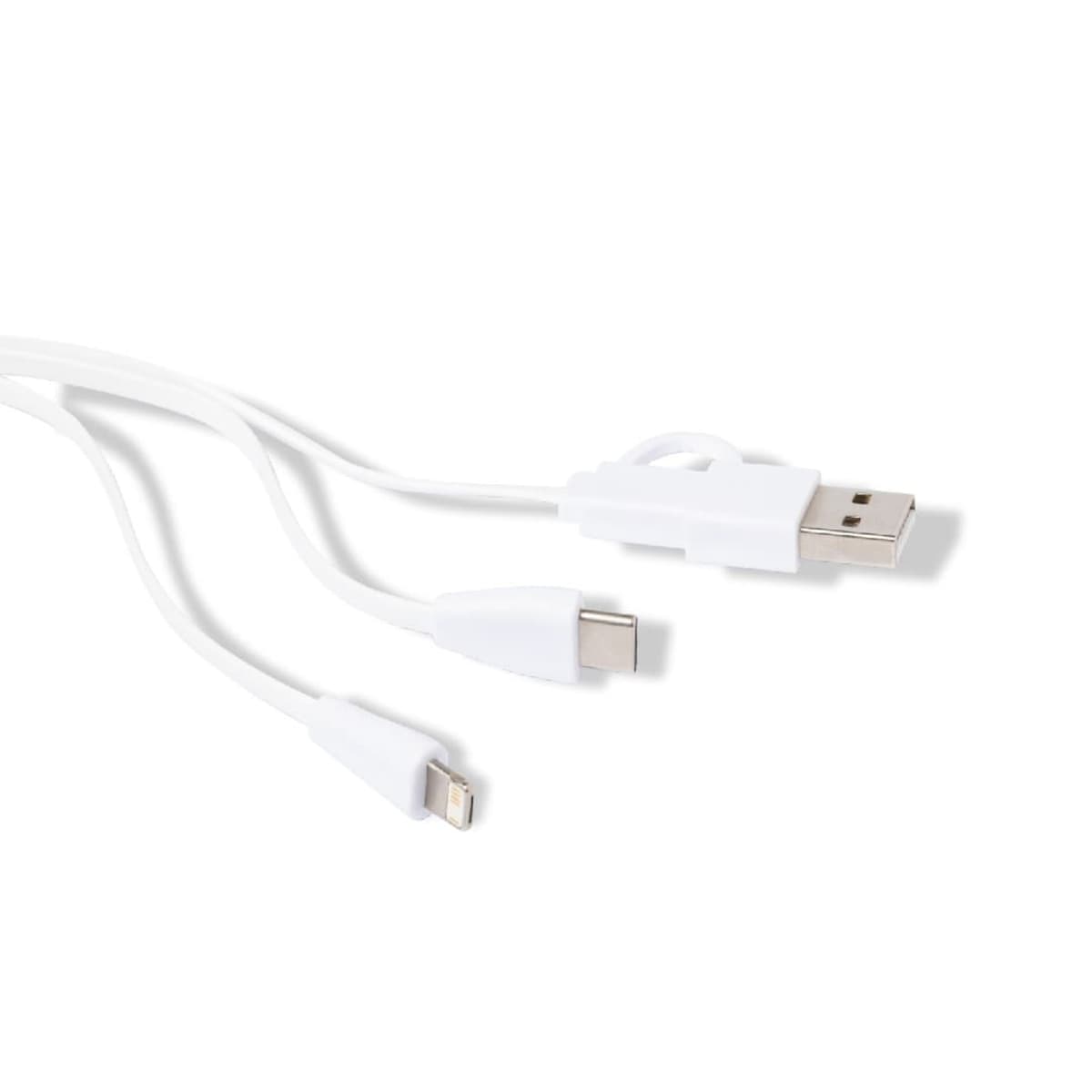 Including USB and Type-C input connections, with Lightning, Micro USB and Type-C 5VDC 2.4A outputs. Presented in an individual kraft design bag.