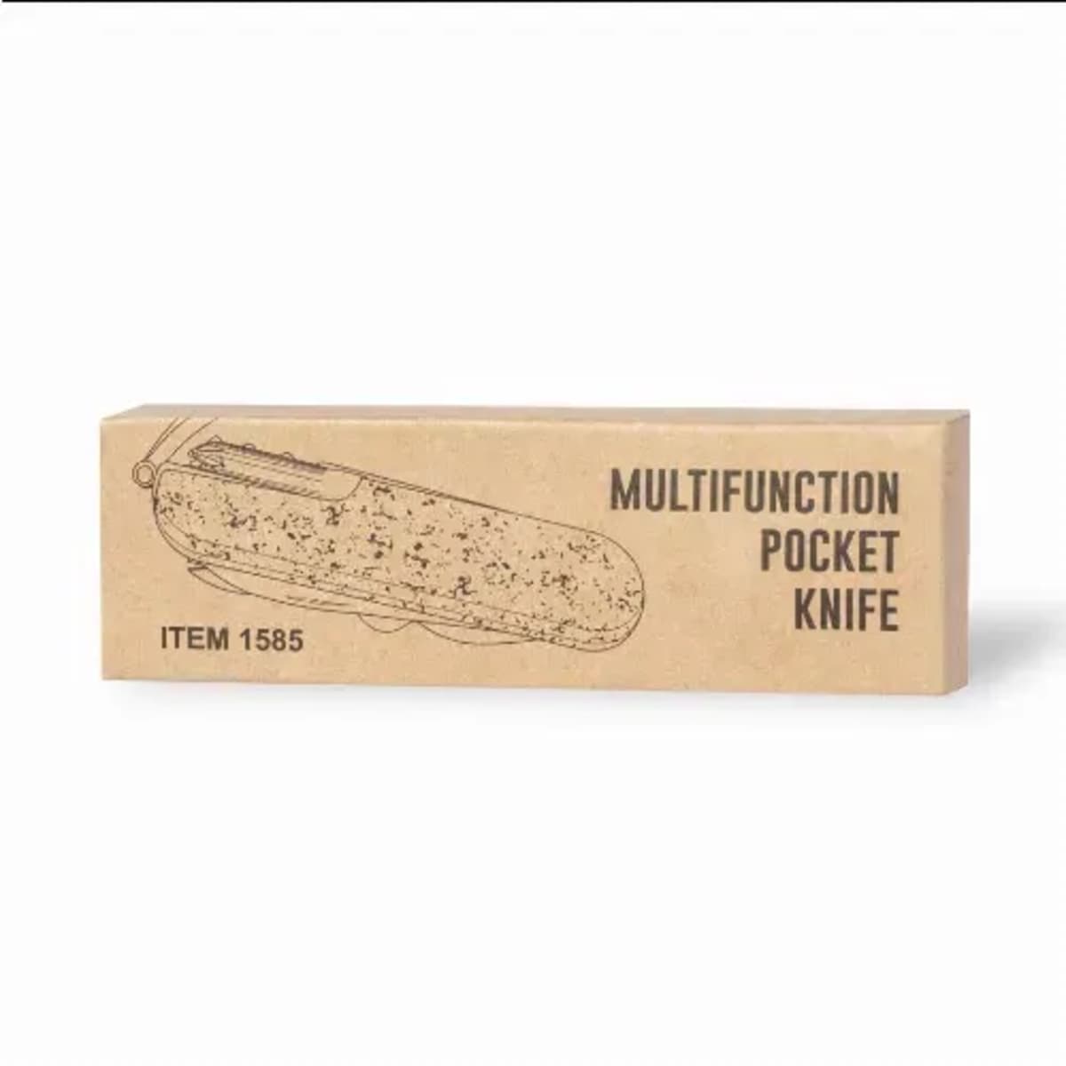 Features:  With 9 functions, including penknife, opener, scissors, file, screwdriver with flat and philips tips, corkscrew... Matching PU leather lanyard and presented in an individual box with kraft design.