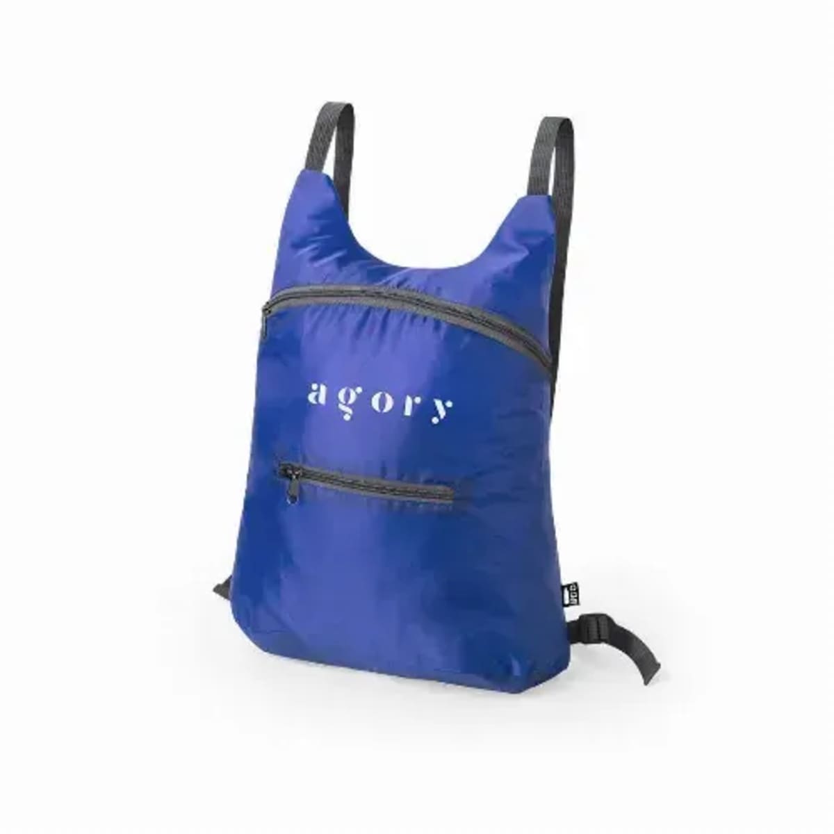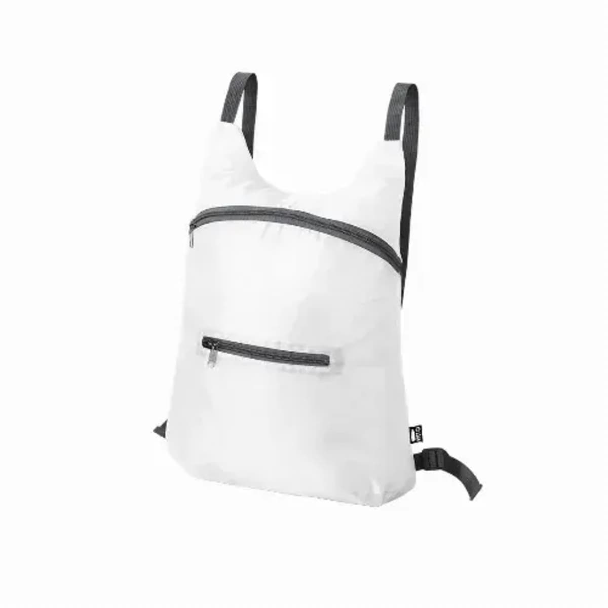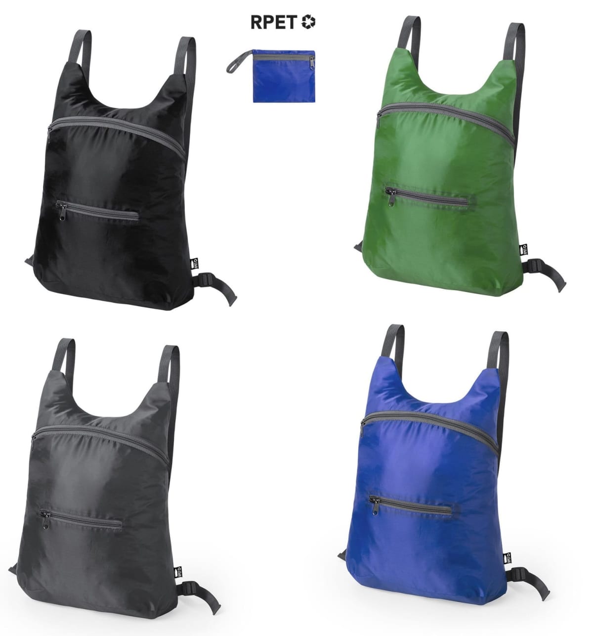 Foldable backpack in soft 201D RPET polyester, made from recycled plastic, to promote the reuse of plastic waste and help the sustainability of the planet.