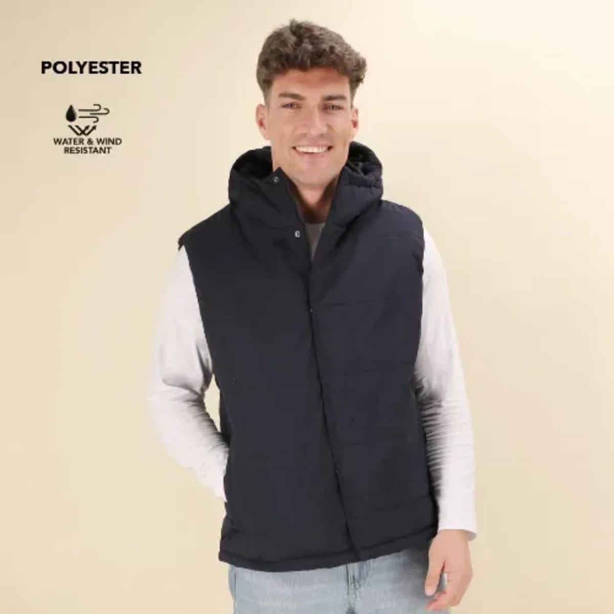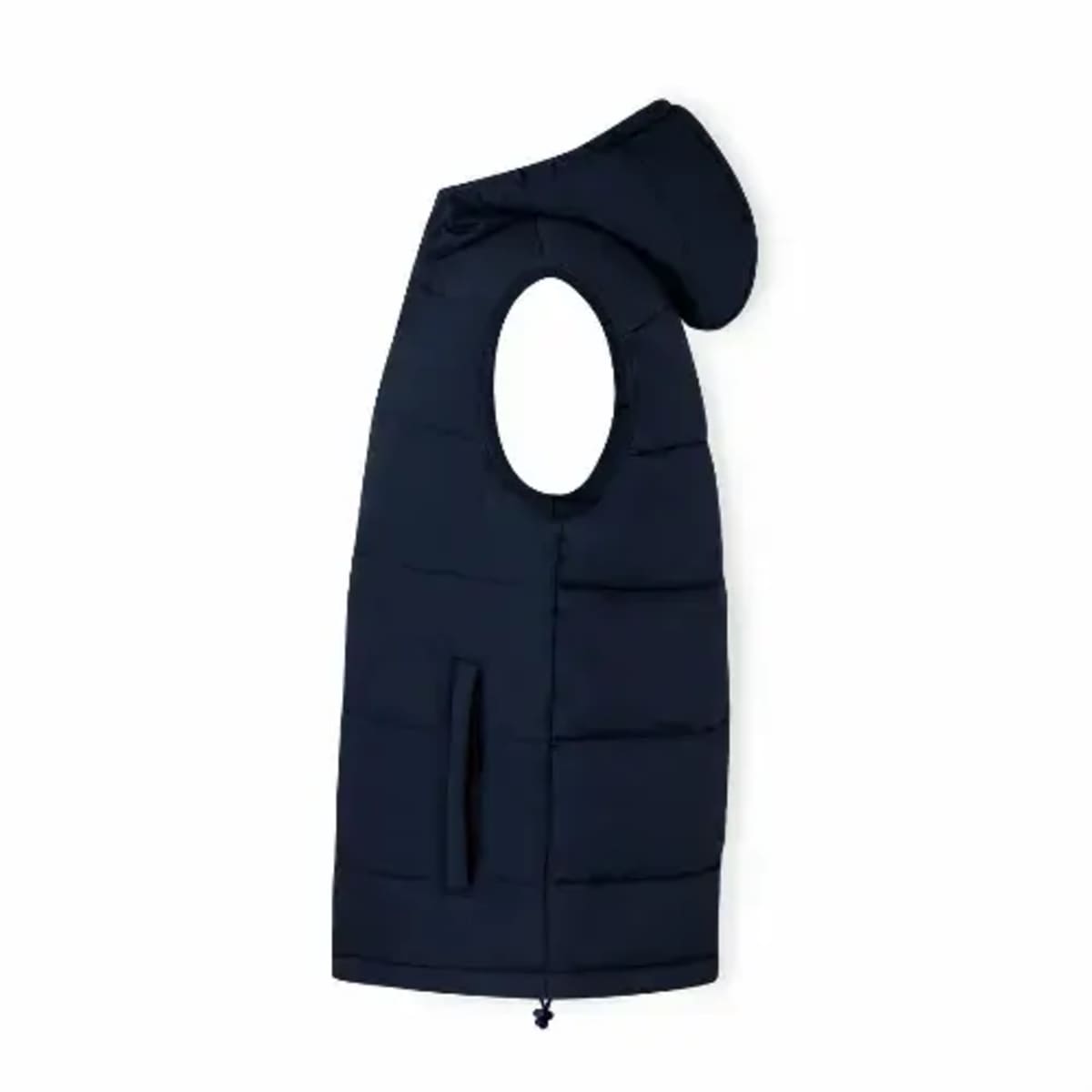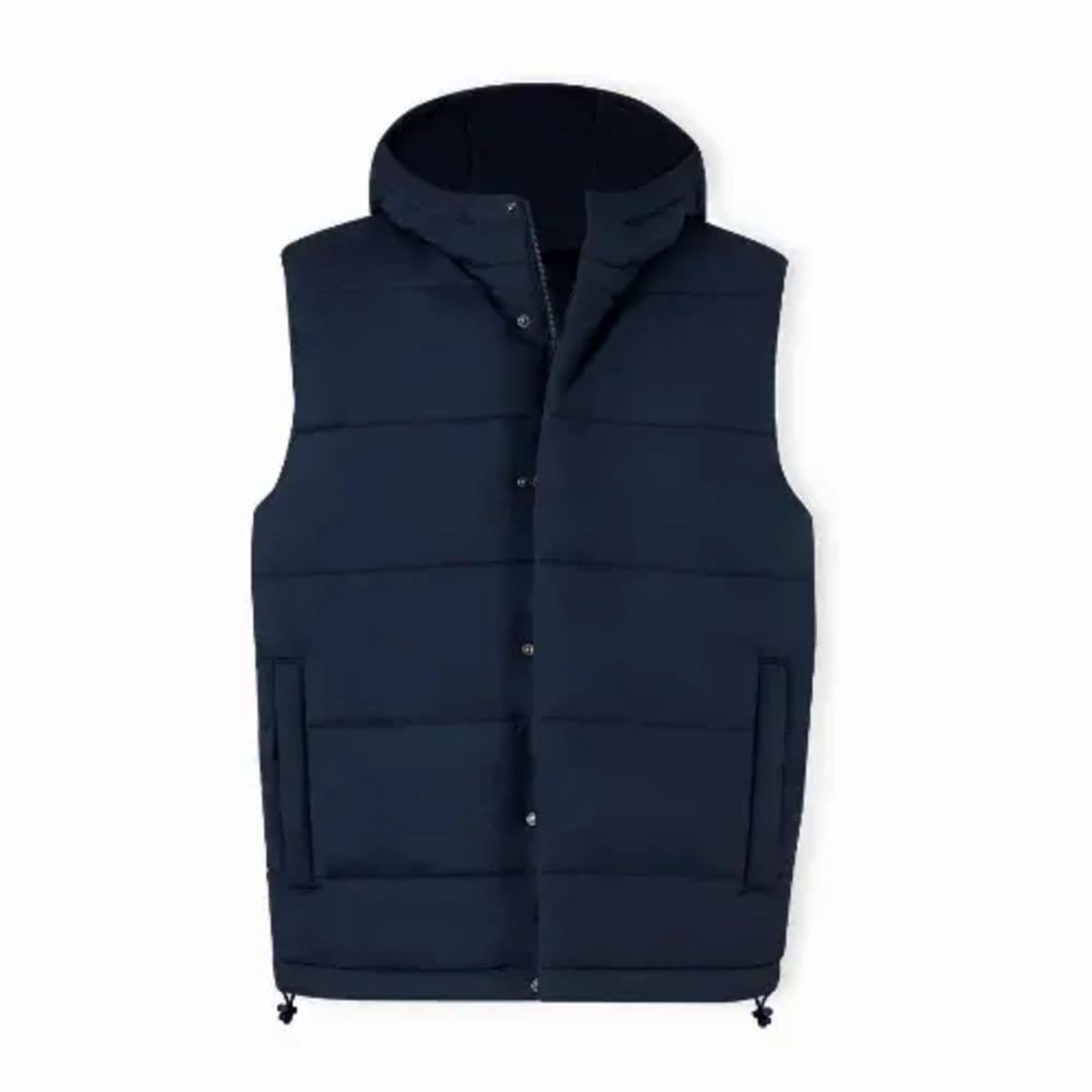 In lightweight, wind and water resistant material. Elegant horizontal construction and padded design, with integrated hood. Double front zip and button fastening. Side pockets with matching pull tabs and adjustable hem string. Available in sizes XS,