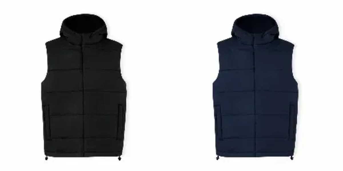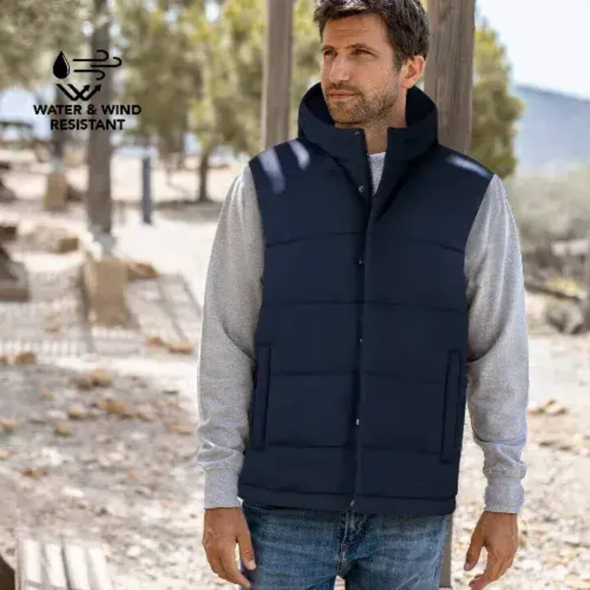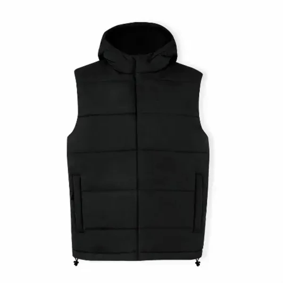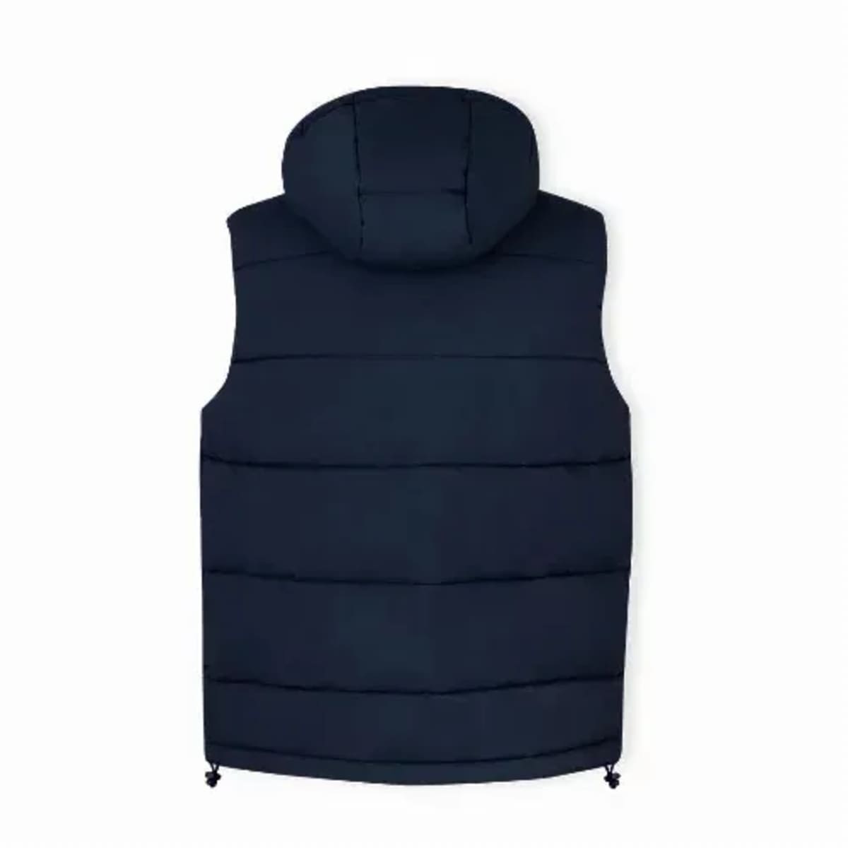 In lightweight, wind and water resistant material. Elegant horizontal construction and padded design, with integrated hood. Double front zip and button fastening. Side pockets with matching pull tabs and adjustable hem string. Available in sizes XS,
