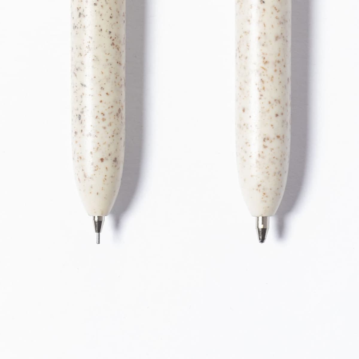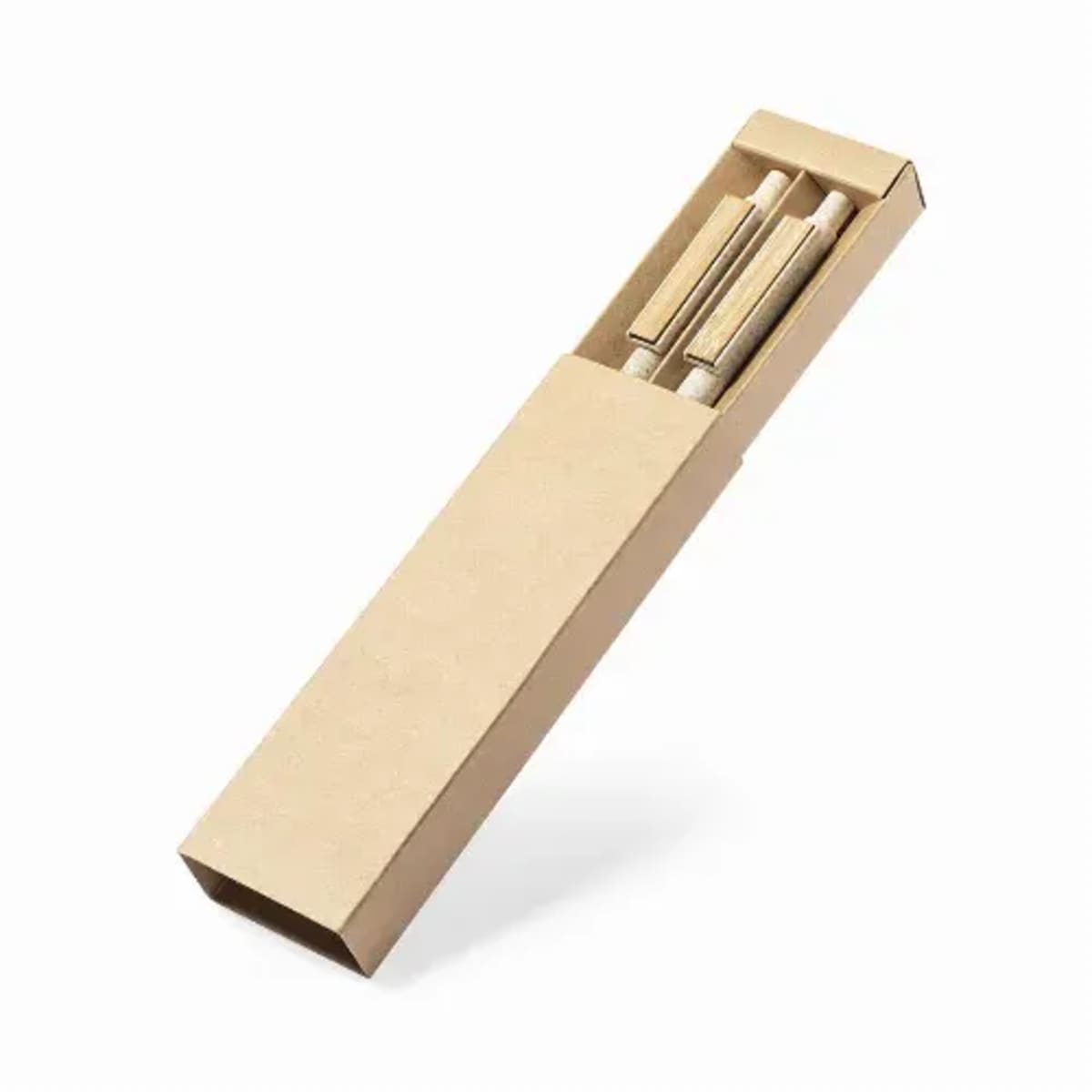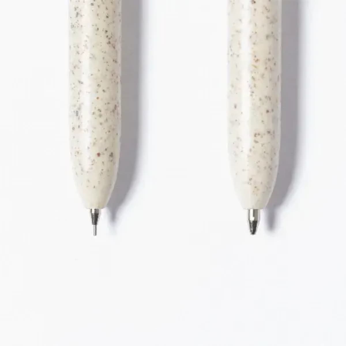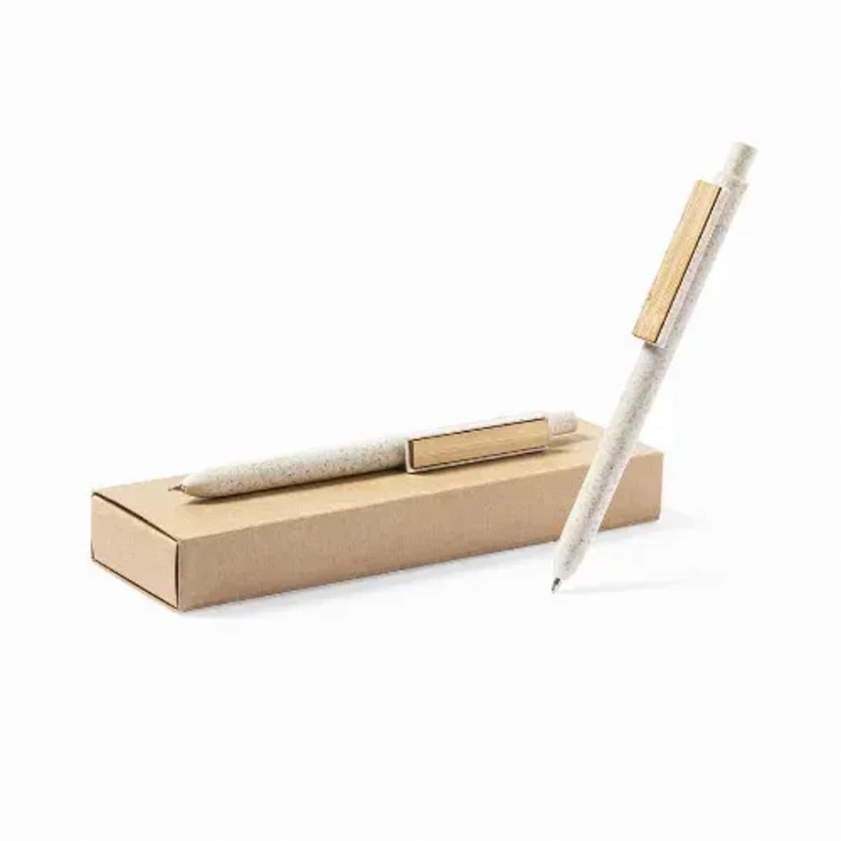 Made in a combination of wheat straw and bamboo clip, to promote the use of natural raw materials and reduce pollutant emissions. Clip with a wide branding area. Blue ink ball pen and mechanical pencil with 2 x 0.5mm leads included. Presented in an i